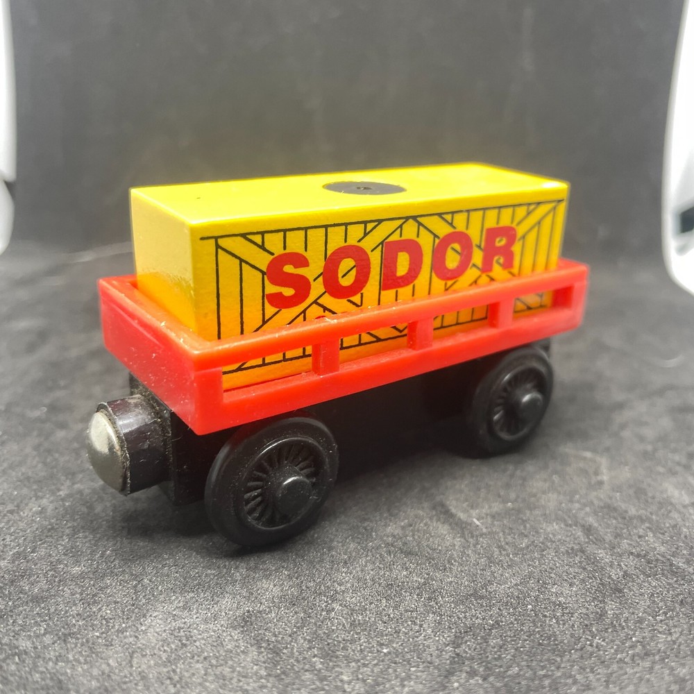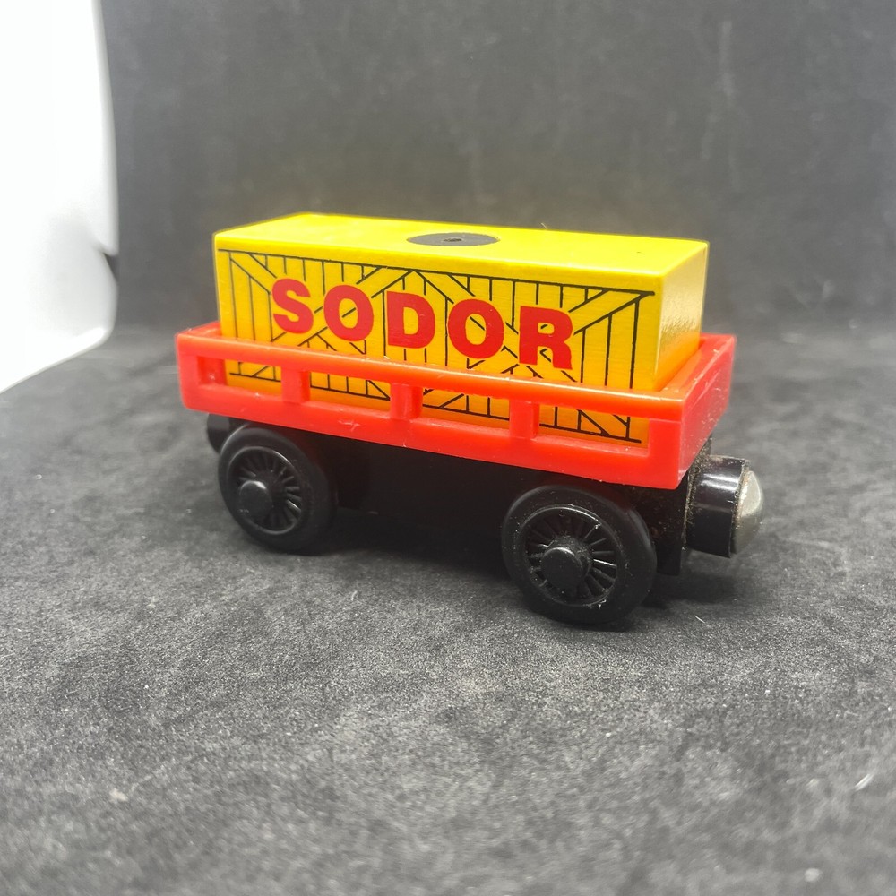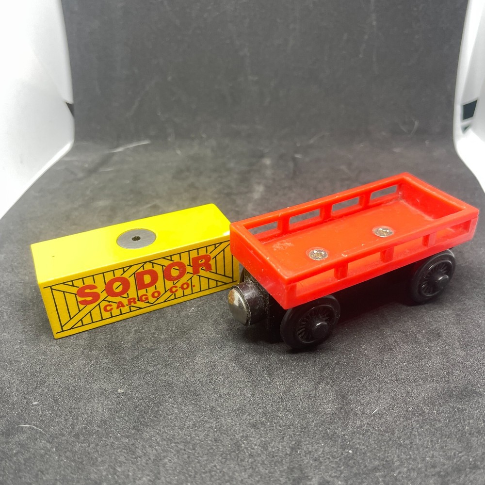 Thomas & Friends Wooden Railway Sodor Red Co With Orange Cargo Car. Loose - lightly played with. Wooden railway toys may have slight paint blemishes and dust from storage - please see photos.