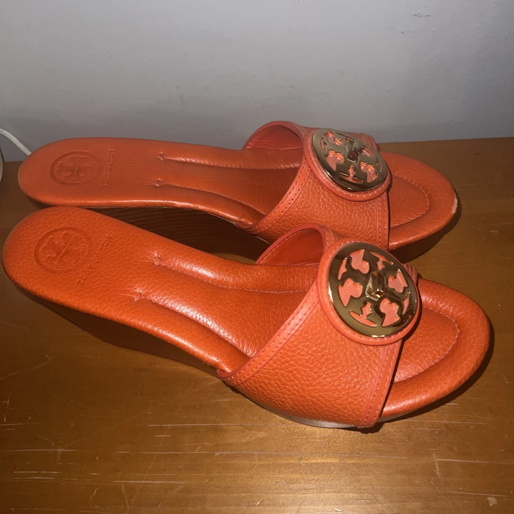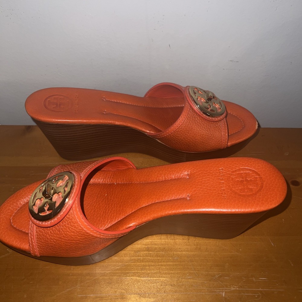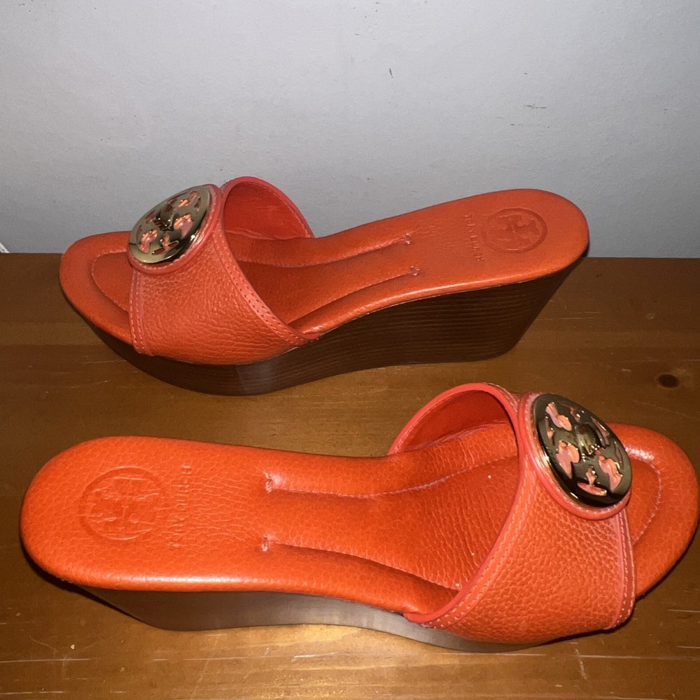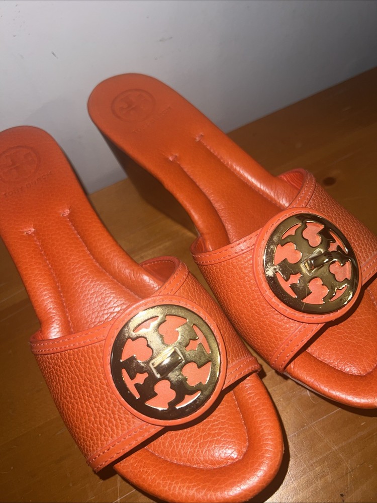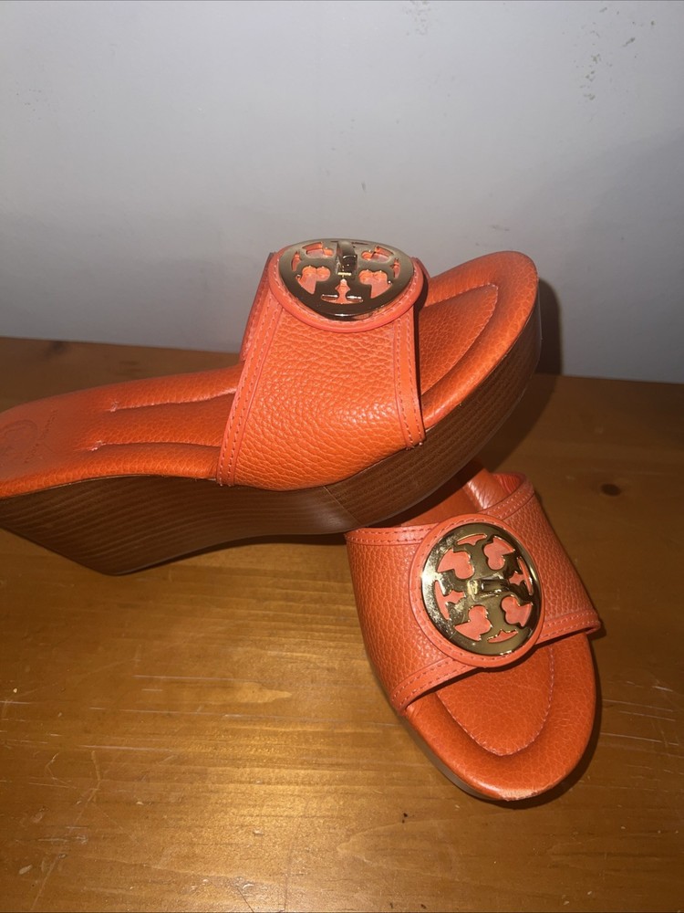 The product is a pair of Tory Burch Elina Gold Logo Orange Leather Mid-Wedge Slide Sandals for women in US size 9.5. These stylish sandals feature a gold color with the iconic Tory Burch logo, a wedge heel style, and a comfortable slide design. Made from leather, these sandals are perfect for adding a touch of luxury to any outfit, whether for a casual day out or a special occasion. The combination of the metal theme and the signature Tory Burch character makes these sandals a must-have for any fashion-forward woman.