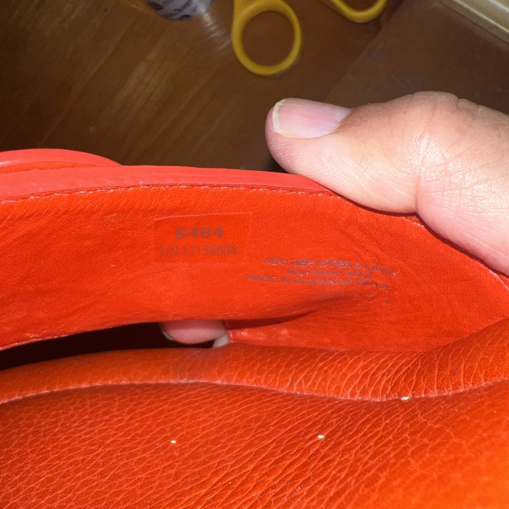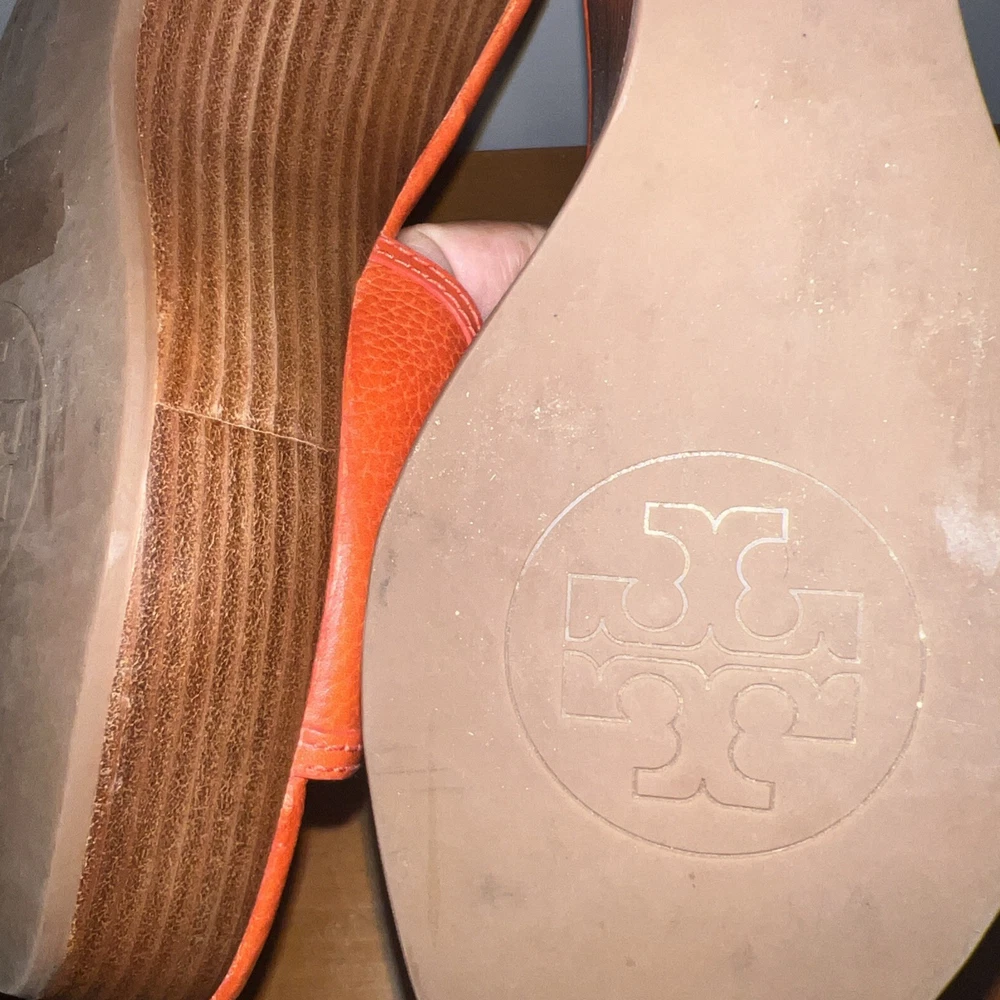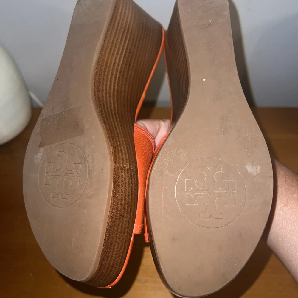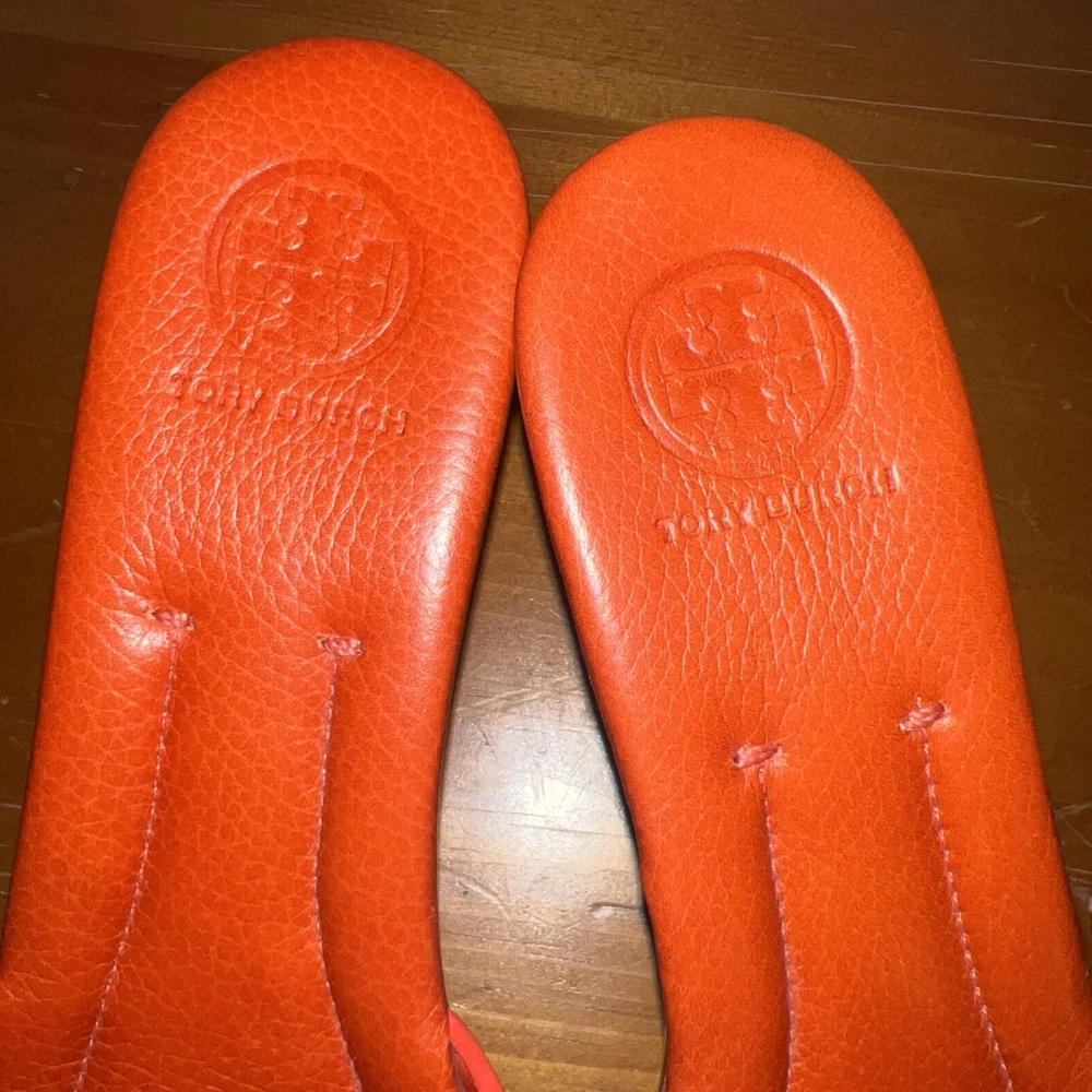 The product is a pair of Tory Burch Elina Gold Logo Orange Leather Mid-Wedge Slide Sandals for women in US size 9.5. These stylish sandals feature a gold color with the iconic Tory Burch logo, a wedge heel style, and a comfortable slide design. Made from leather, these sandals are perfect for adding a touch of luxury to any outfit, whether for a casual day out or a special occasion. The combination of the metal theme and the signature Tory Burch character makes these sandals a must-have for any fashion-forward woman.