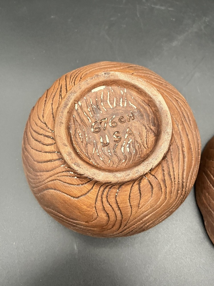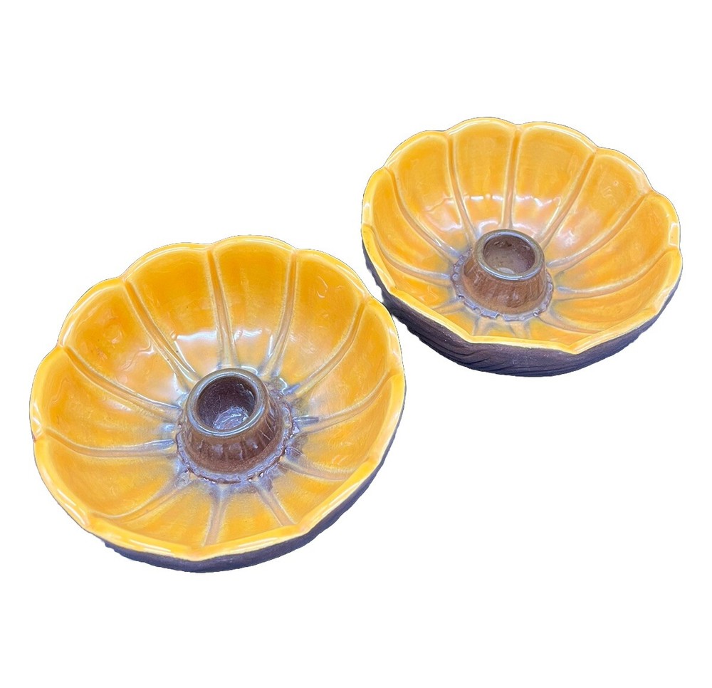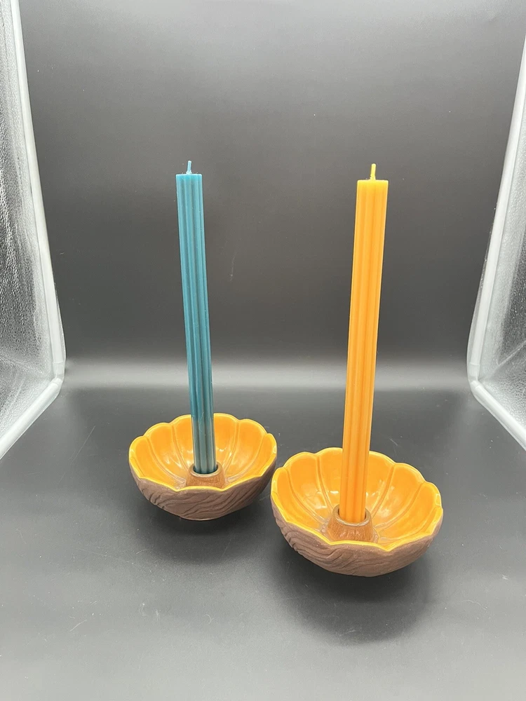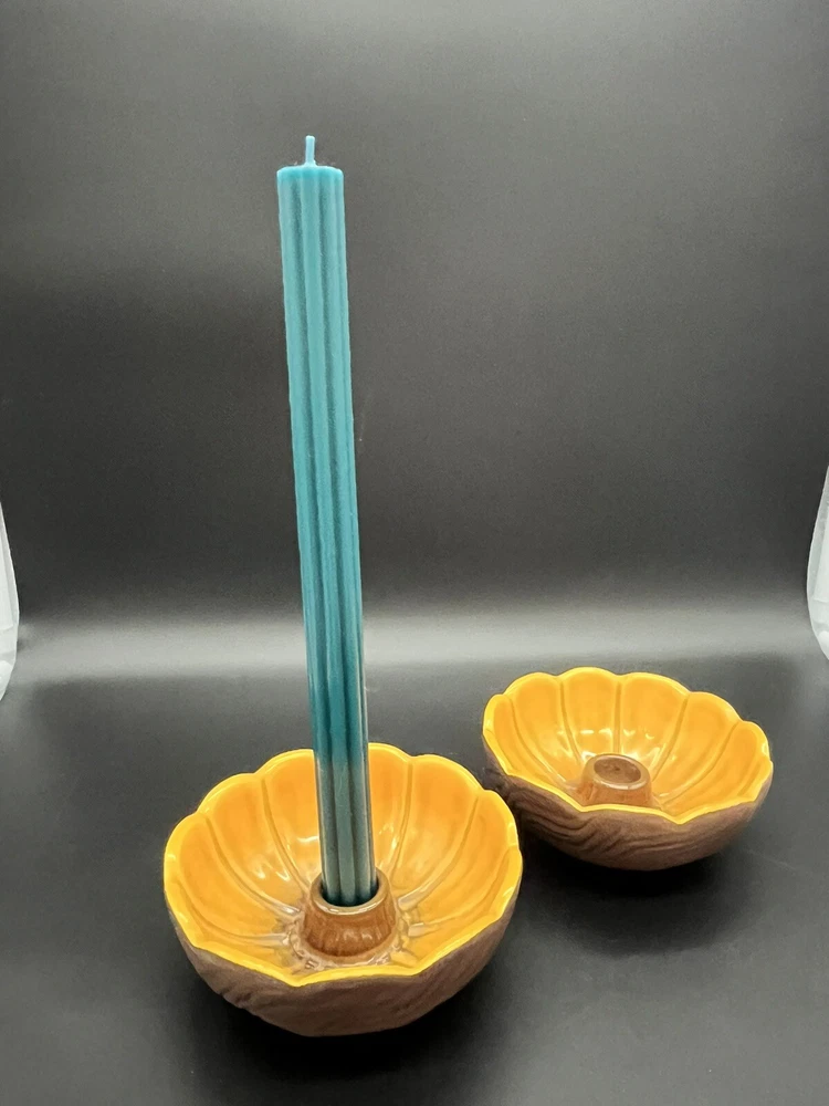 Add a touch of vintage charm to your home with these Treasure Craft Retro MCM Candle Holders. The round ceramic candle holders feature a glossy interior finish and a colorful floral pattern that will complement any retro or vintage style. The exterior is a matte brown color. Measuring 5.25 inches in diameter and 2.5” tall, these candle holders are perfect for creating a cozy and inviting atmosphere in any room. The package includes two candle holders, making it ideal for displaying on either side of your bed or in a decorative dish. Add a touch of nostalgia to your home with these 1960's era candle holders that are sure to become a treasured part of your collection. These can also be used a small bowls as shown in pictures. Please see detailed photos to help you determine condition. This are in good vintage condition with no chips, cracks or breaks. Some of the exterior surface has flaked.