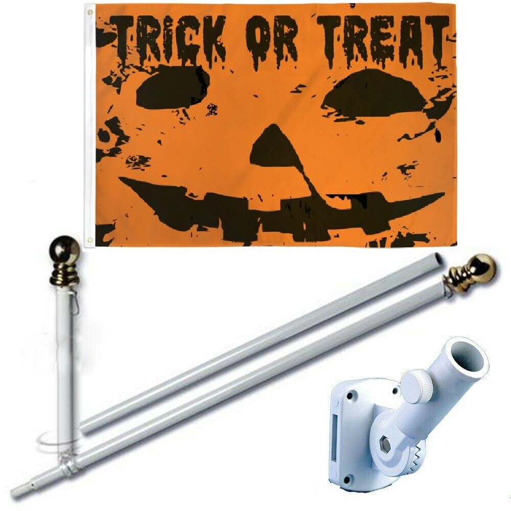 3' x 5' Super Polyester Flag w/ 2 Grommets for Hoisting 6' spinning stabilizing flag pole with 1" diameter Adjustable bracket and wall mounting hardware included This pole kit includes our 6ft Spinning Stabilizer Pole and Adjustable Aluminum Bracket. 2 Section Aluminum Spinning Stabilizer Pole is 6 feet long with a 1-inch diameter and gold ball top and white finish. These poles were recently upgraded from our previous model for strength and durability. They now include a mid-section ball joint so that the pole spins freely, and the flag never tangles. Adjustable Aluminum Bracket with White Finish can fit in up to 13 different angles across 180 degrees of motion.