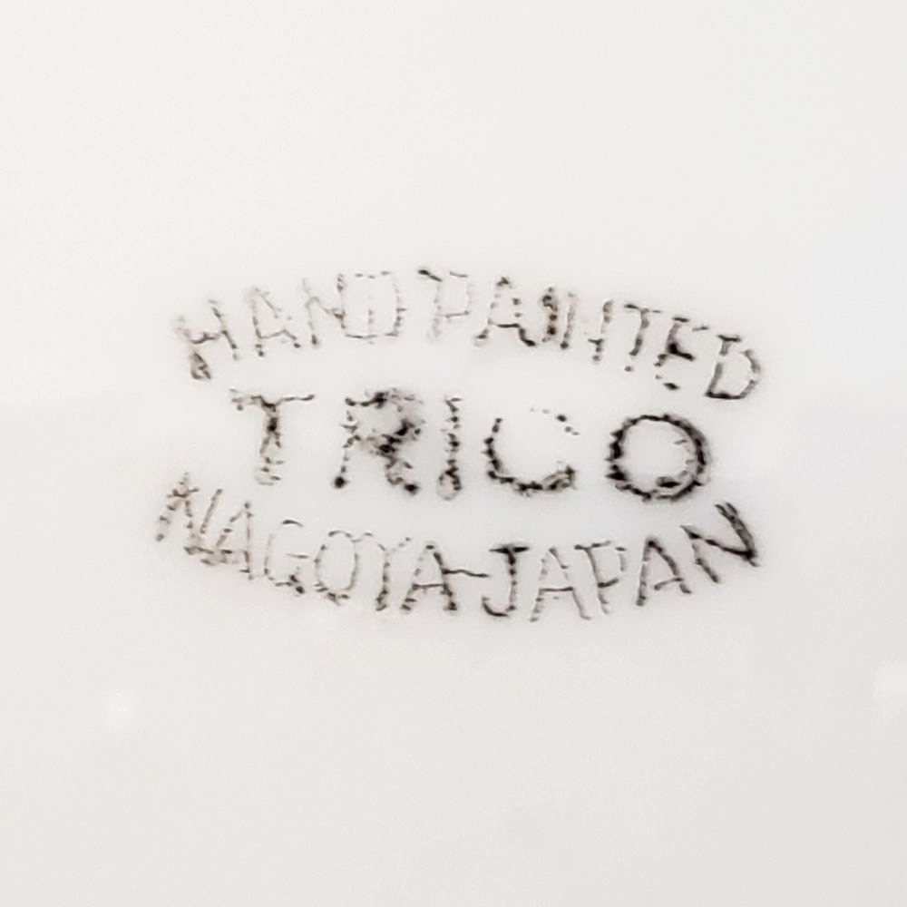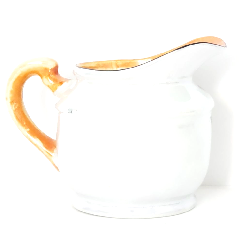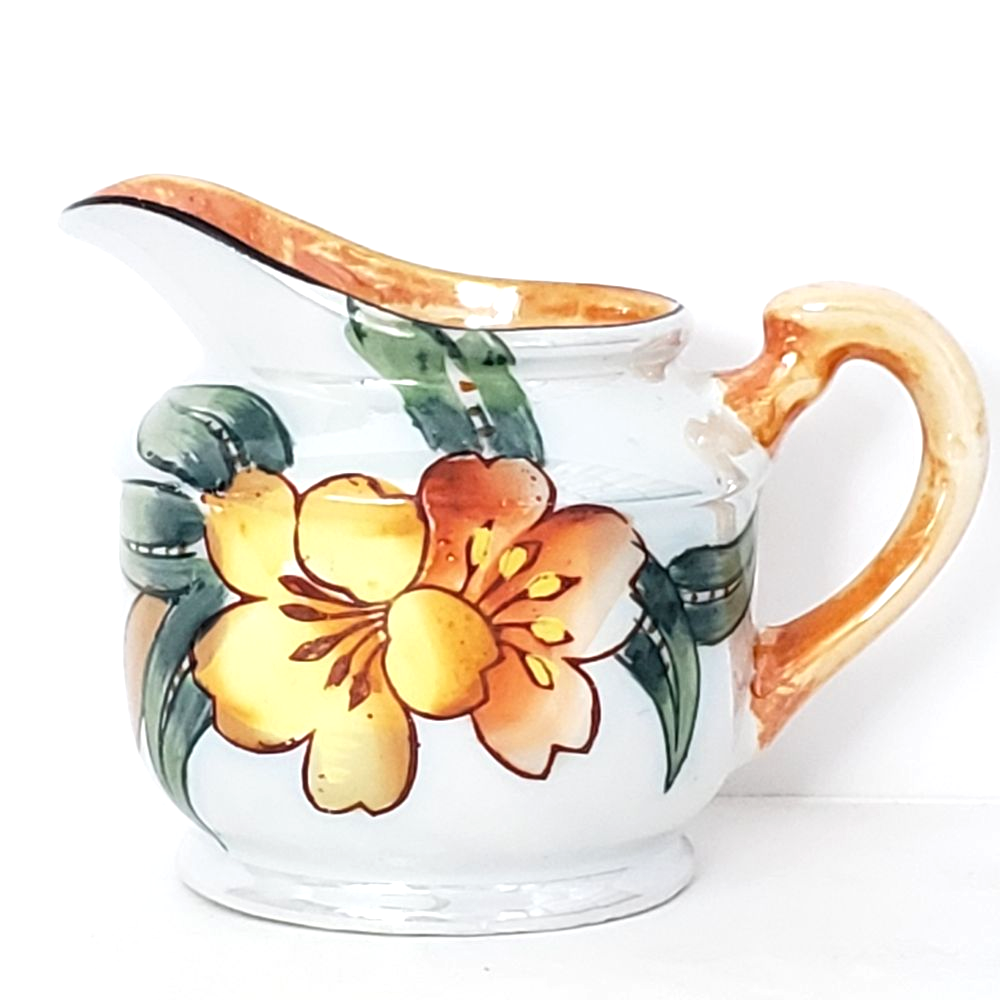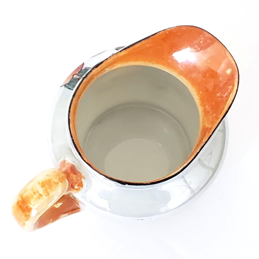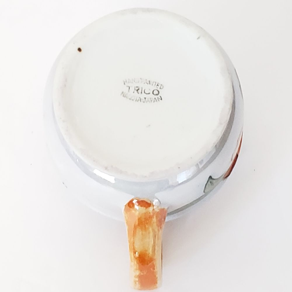 Trico Nagoya Japan vintage mid century luster ware creamer. Beautifully hand painted in shades of orange and green on a white luster background. Rim is outlined in black. Gently used. Condition is consistent with age. Please see photos. Approx. 4.25" across (including handle) Approx. 3" tall