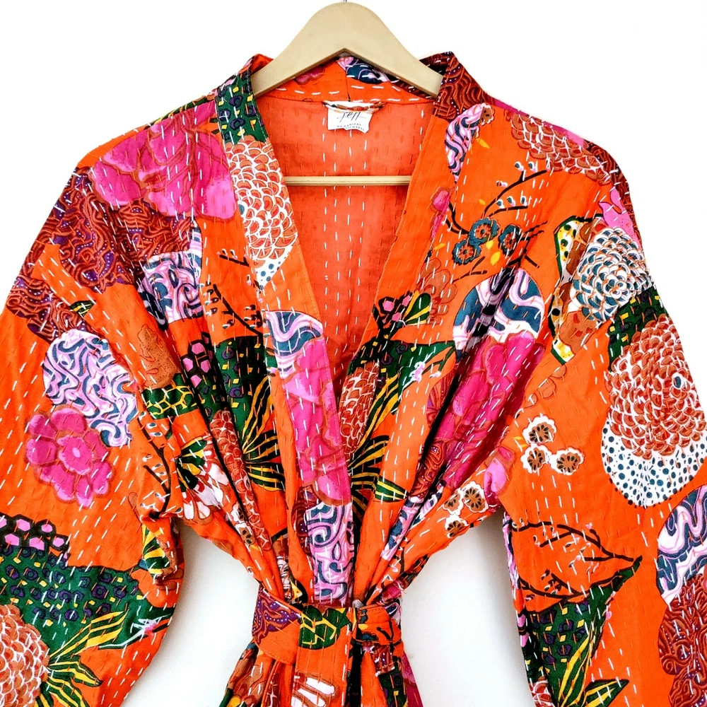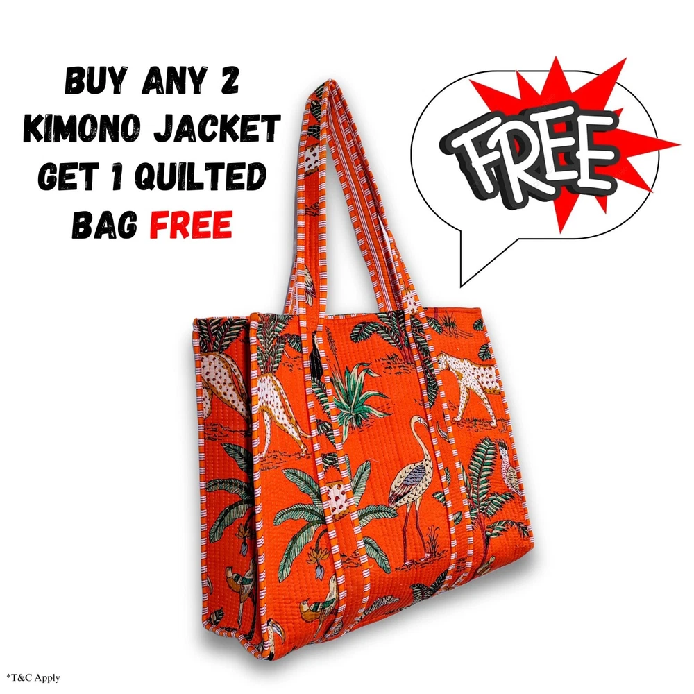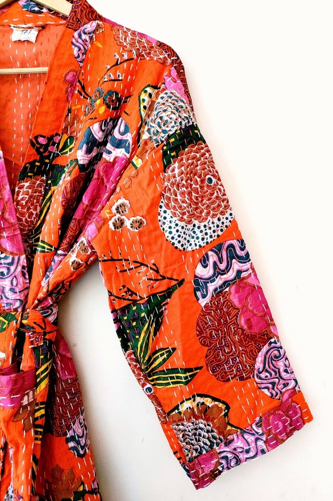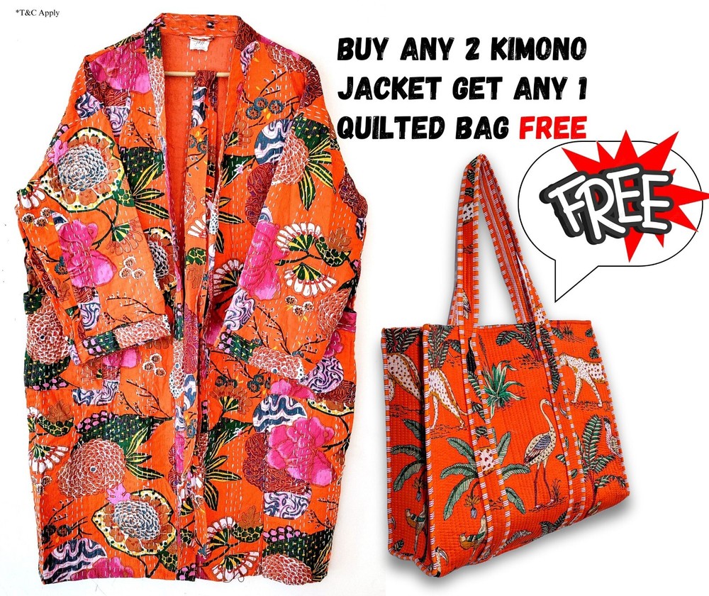FREE**************FREE*************FREE******** BUY ANY 2 KIMONO JACKET GET 1 QUILTED BAG FREE QUILTED FLORAL PRINT OPEN JACKET WITH 2 SIDE POCKET STYLE... Pranipat Handicrafts Presenting beautiful floral Print kantha jacket. Buy it for the holidays! Looks fabulous over a long silk tank dress or palazzo pants. Or wear it with jeans and boots. Jacket made with quilted Floral kantha quilt fabric which is fresh and new. This kantha fabric is hand stitched and it is the specialty of this piece. This jacket is not reversible. We will provide you a matching color string to close this jacket which gives it awesome look. Wear it with any dress, or with jeans to add color and beauty. Handmade in India. Dimension:- ********************************* *Length: 40" Inches *Bust Around Size: 48" Inches *Shoulder: 8" Inches *Sleeve Length: 14" Inches *Sleeve hole: 9" Inches *2 Side Pockets NOTE: The color of images shown above may slightly vary due to flash light and camera-resolution. Special note: We Love to Accept Bulk Orders. So resellers can contact any time. FREE**************FREE*************FREE******** BUY ANY 2 KIMONO JACKET GET 1 QUILTED BAG FREE Product Description:- This is Beautiful Quilted Jacket Made from Cotton Screen Print Kantha Fabric and Hand stitched. Jacket has Multi Base on Black color Peacock Print. There are two Pocket in both side and a removable drawstring. Wash Care:- Machine Washable. Note:- * International Buyers are responsible for their countries and taxes. * We ship the Worldwide by FEDEX, UPS, and by DHL services. Special note: We Love to Accept Bulk Orders. So resellers can contact any time. FREE**************FREE*************FREE******** BUY ANY 2 KIMONO JACKET GET 1 QUILTED BAG FREE ©pranipat_handicrafts Thanks....