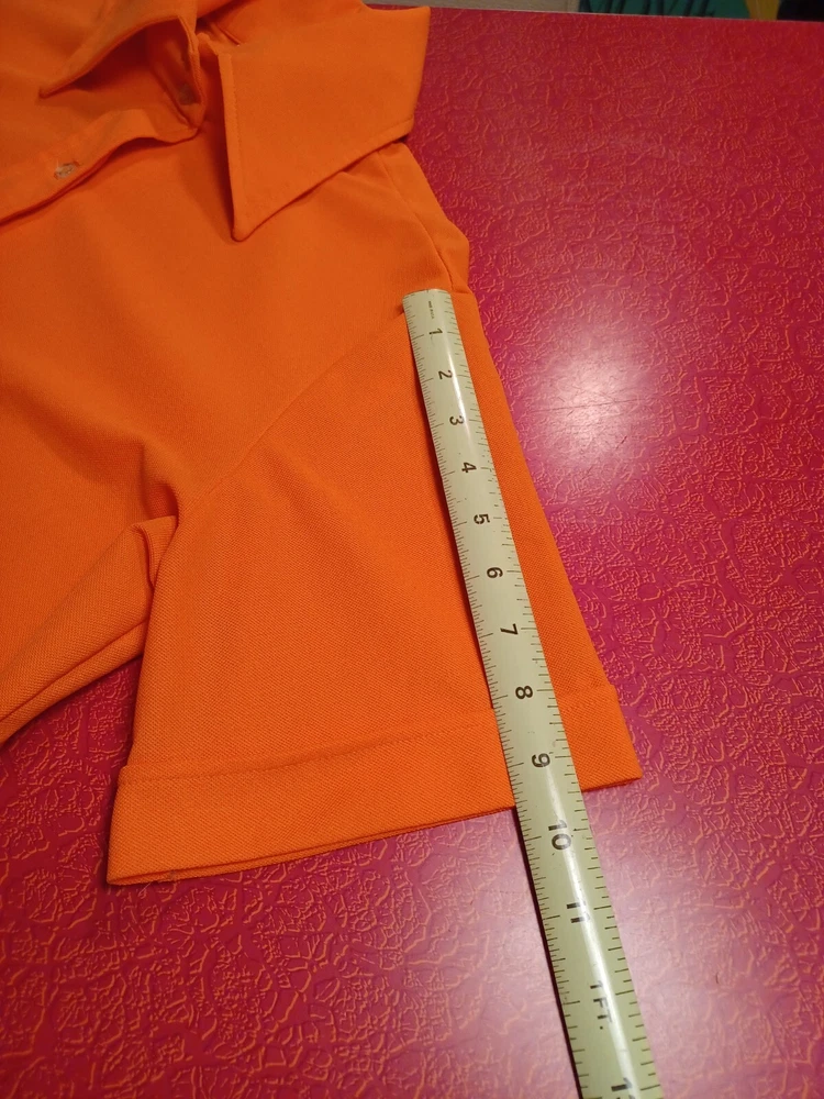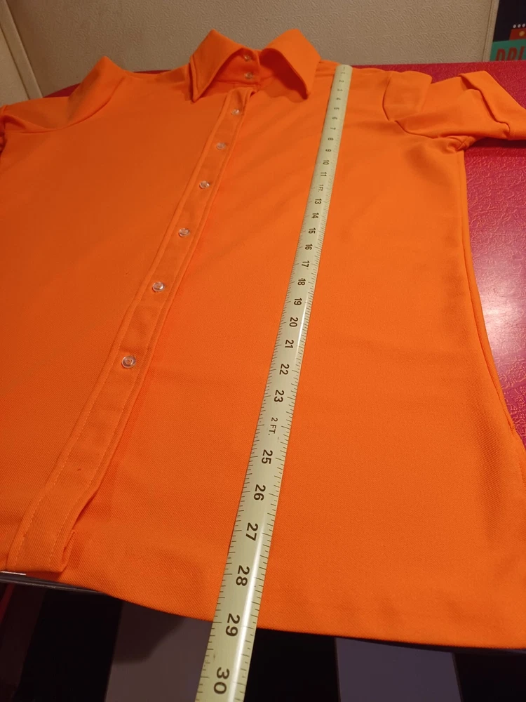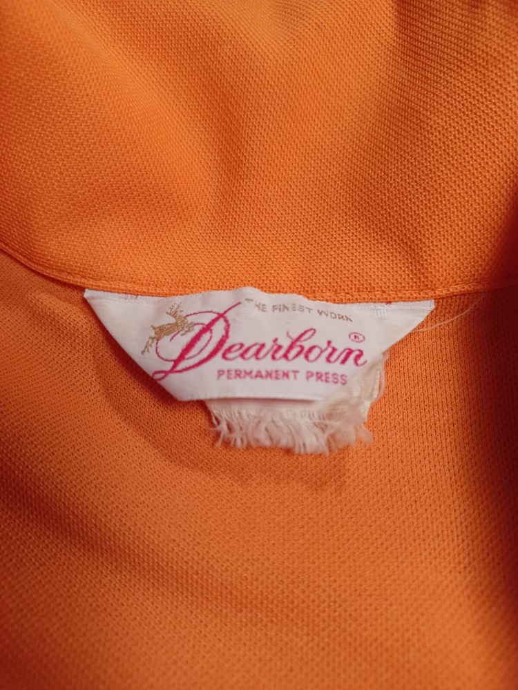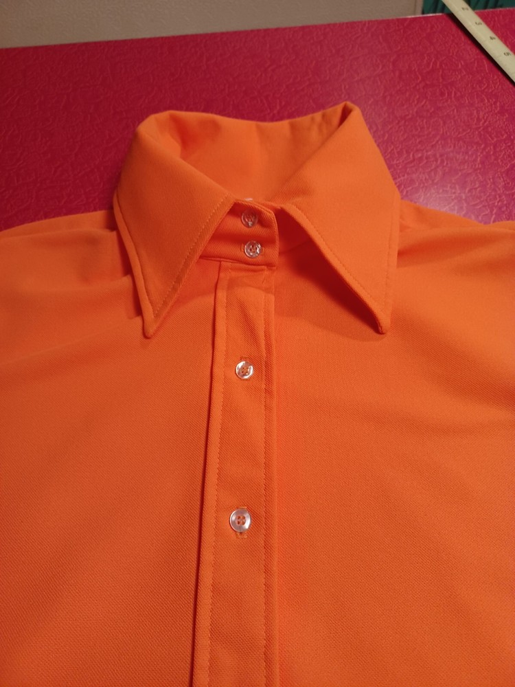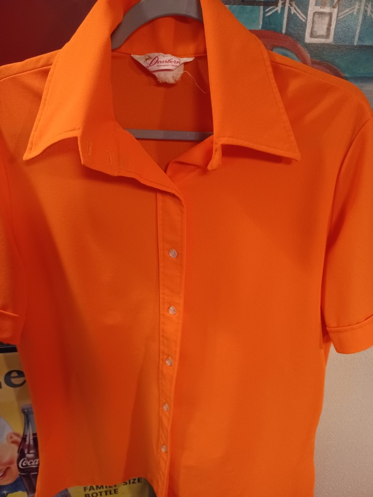 True vintage mid-century 1960s 1970s orange polyester button up short sleeve ladies shirt. No size tag, guessing a Large... ACTUAL MEASUREMENTS IN PHOTOS. Made by Dearborn "Permanent Press" Overall very nice condition with a couple of small flaws which can be seen in the last two photos. (flaws are a very small hole near the front hem and a snag near the back hem) Nice bright orange. No fading or discoloration. ***Please view all photos carefully as they are an important part of the description including detail, condition and actual measurements.