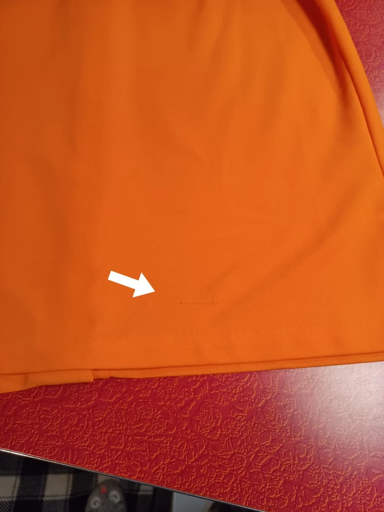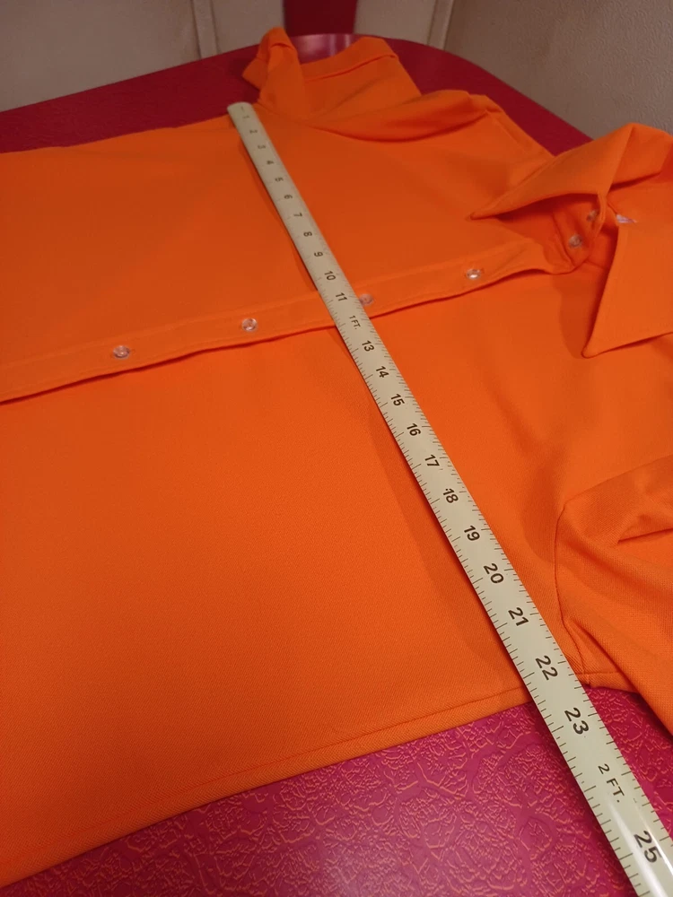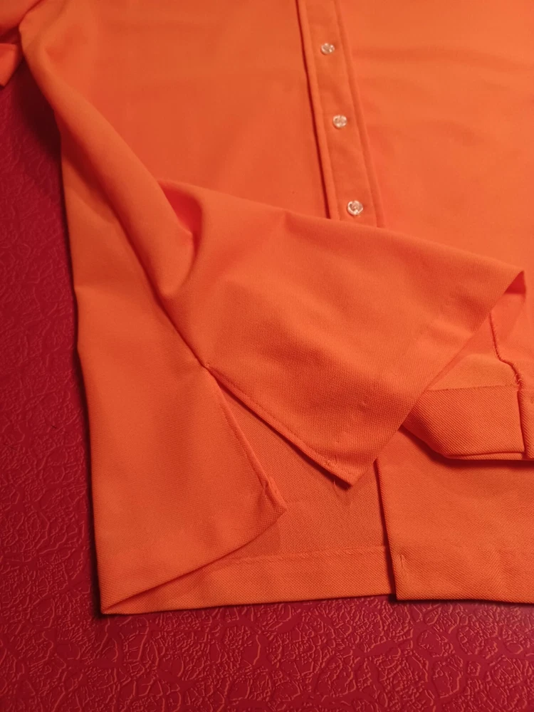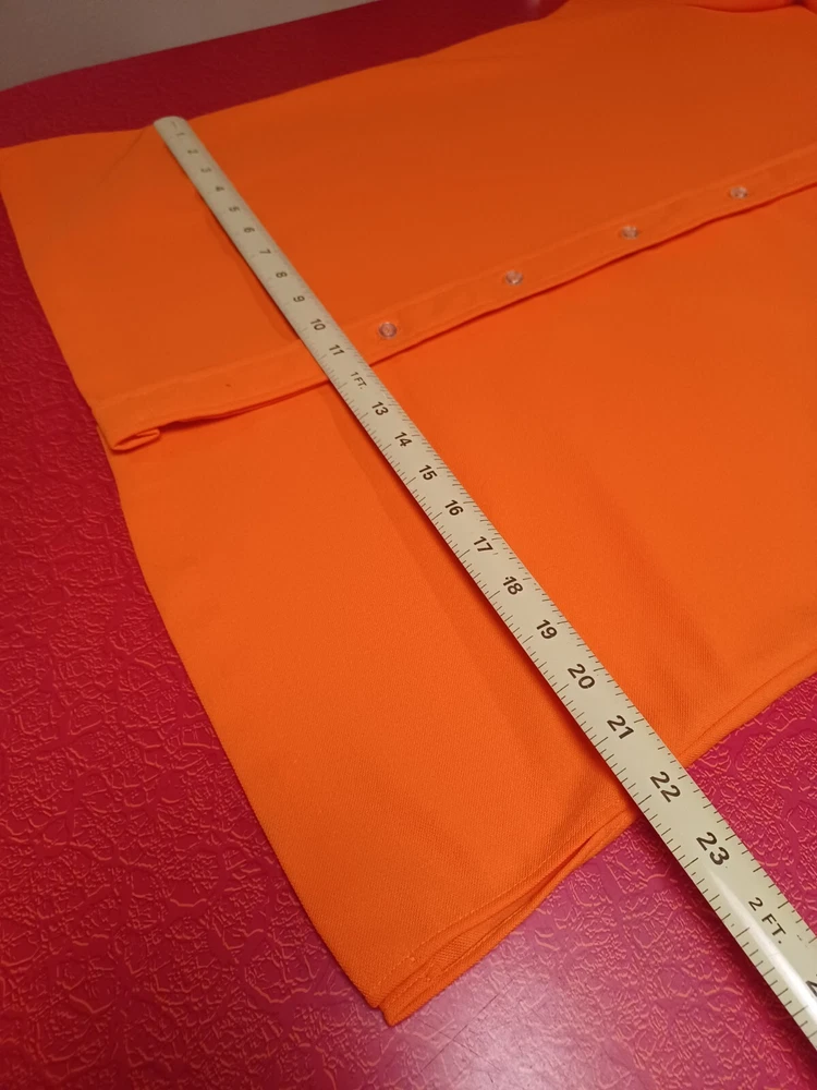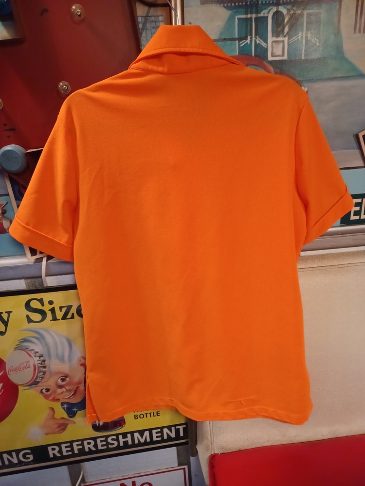 True vintage mid-century 1960s 1970s orange polyester button up short sleeve ladies shirt. No size tag, guessing a Large... ACTUAL MEASUREMENTS IN PHOTOS. Made by Dearborn "Permanent Press" Overall very nice condition with a couple of small flaws which can be seen in the last two photos. (flaws are a very small hole near the front hem and a snag near the back hem) Nice bright orange. No fading or discoloration. ***Please view all photos carefully as they are an important part of the description including detail, condition and actual measurements.