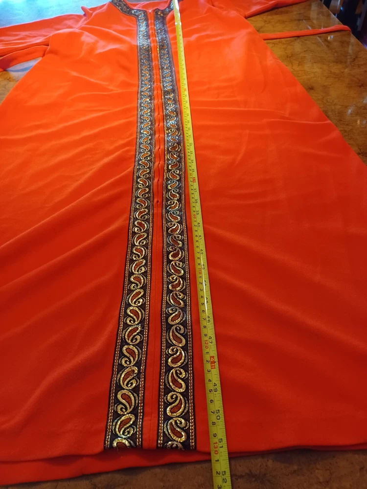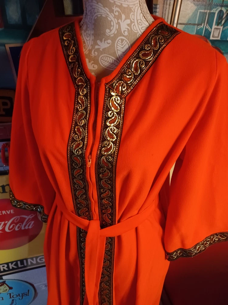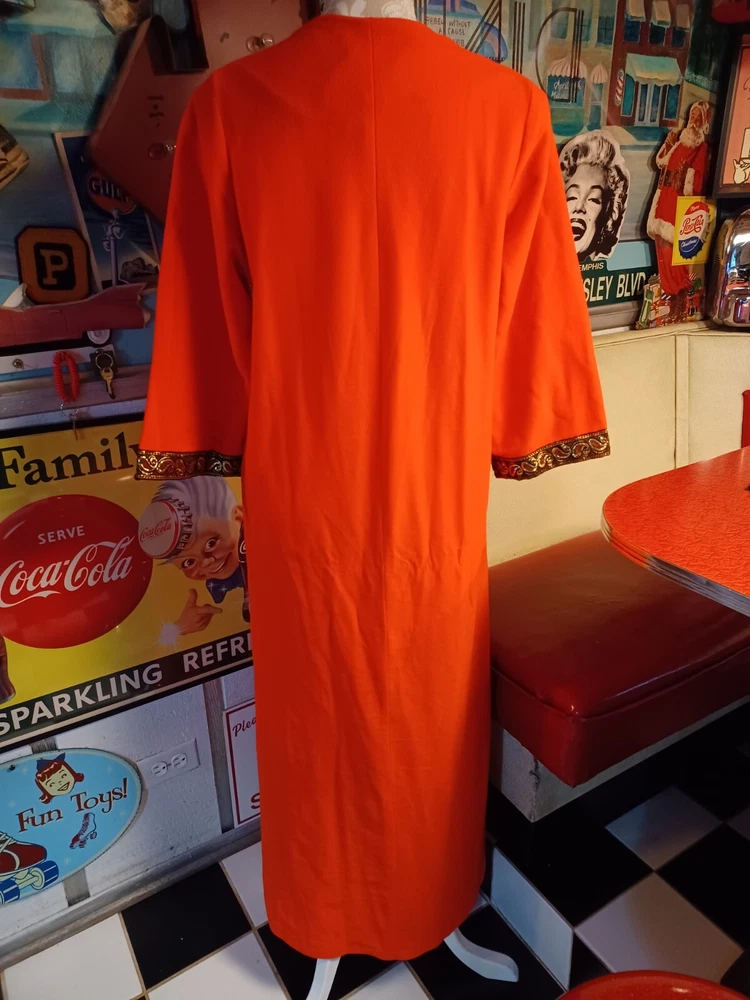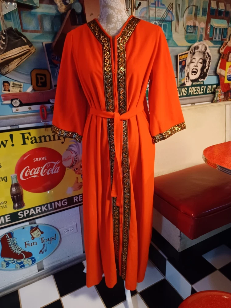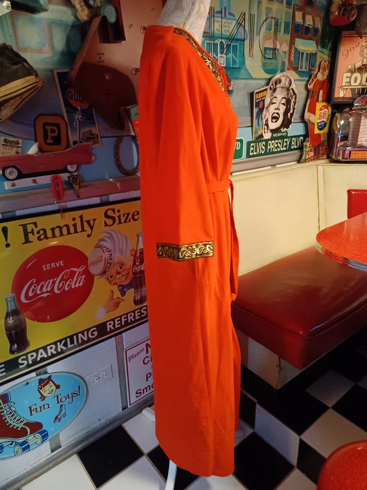 True Vintage Mid-century 1960s Orange Robe With gold metallic Trim MCM MOD No Size tag, but.... ACTUAL MEASUREMENTS IN PHOTOS. Very nice vintage condition. No holes, tears or split seams. Original zipper up the front works perfectly. The beautiful brocade-like gold trim is attached securely. The original belt is also intact. Photo number 10 shows how the belt is attached. The belt is only seen from the front. It goes through the middle and comes out the front to tie it...... hopefully that makes sense. LOL There are a few minor spots like the ones in photo #11. They are not very noticeable at all & I did not even notice them until I laid the robe flat for measurements, but wanted to point them out. The robe has not been washed and I'm not sure if they will release when laundered. ***Please view all photos carefully as they are an important part of the description including detail, condition and actual measurements.
