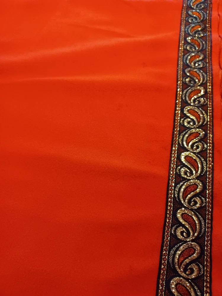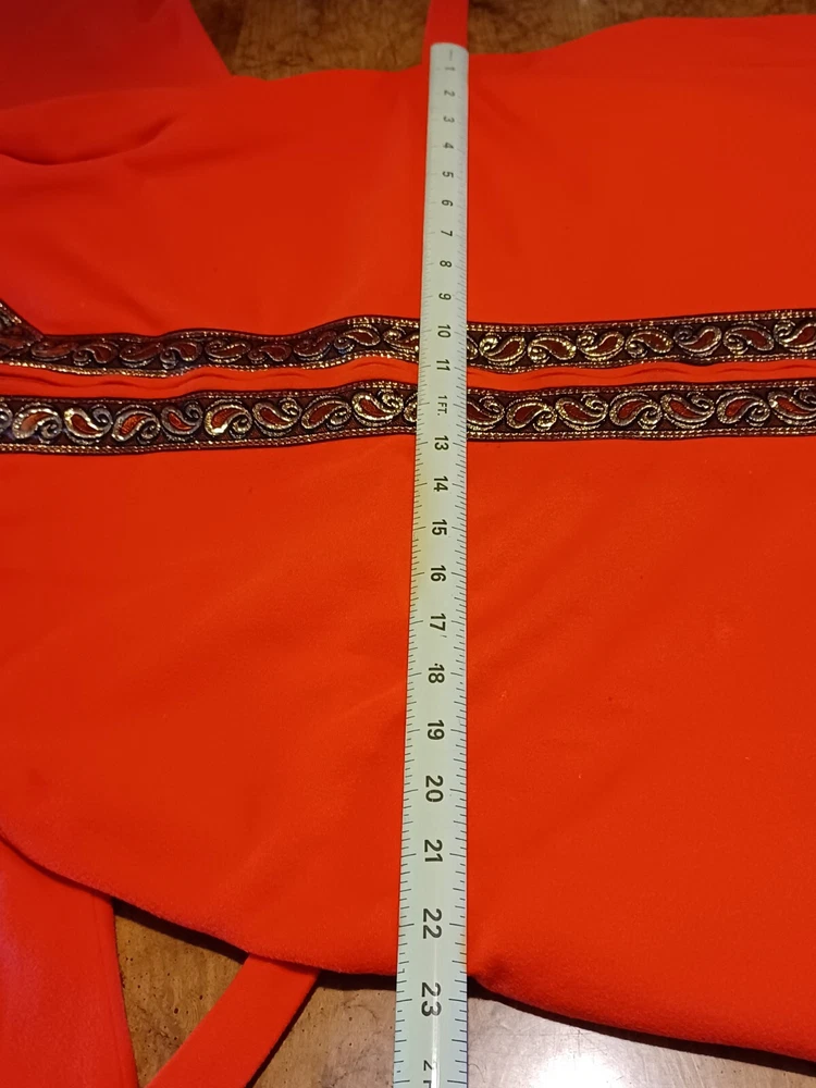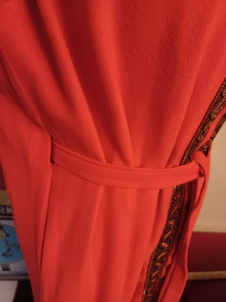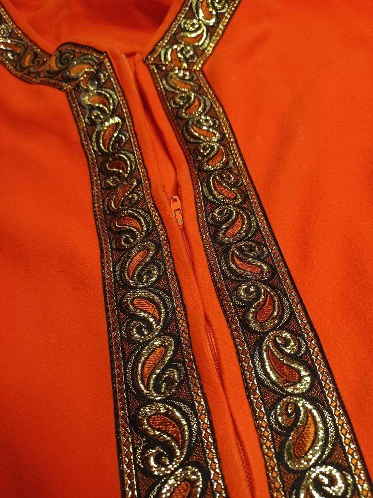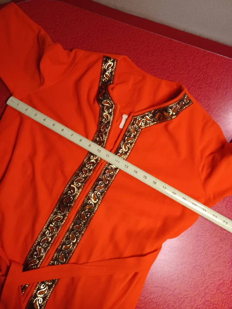 True Vintage Mid-century 1960s Orange Robe With gold metallic Trim MCM MOD No Size tag, but.... ACTUAL MEASUREMENTS IN PHOTOS. Very nice vintage condition. No holes, tears or split seams. Original zipper up the front works perfectly. The beautiful brocade-like gold trim is attached securely. The original belt is also intact. Photo number 10 shows how the belt is attached. The belt is only seen from the front. It goes through the middle and comes out the front to tie it...... hopefully that makes sense. LOL There are a few minor spots like the ones in photo #11. They are not very noticeable at all & I did not even notice them until I laid the robe flat for measurements, but wanted to point them out. The robe has not been washed and I'm not sure if they will release when laundered. ***Please view all photos carefully as they are an important part of the description including detail, condition and actual measurements.