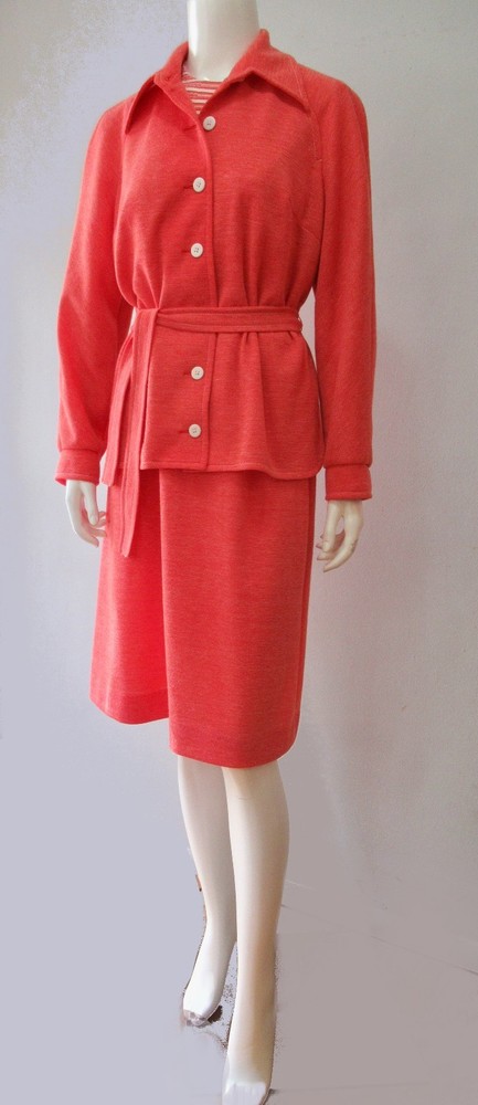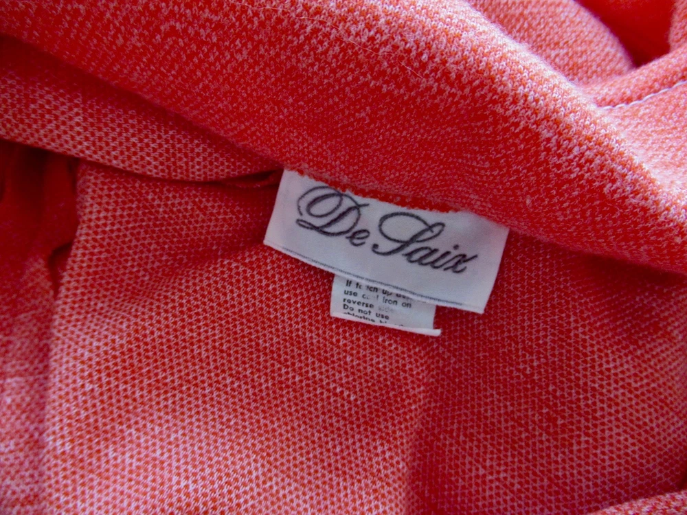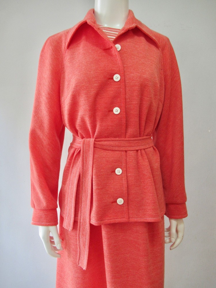 De Laix Space dye orange. A little bit of stretch. All polyester. Original belt. Vintage condition. Without issues. Medium light weight, soft. Shoulder 14.5 Bust 36 Waist 29 Hip 46 Length 42 From waist 25 Underarm seam sleeve length jacket 17 set1