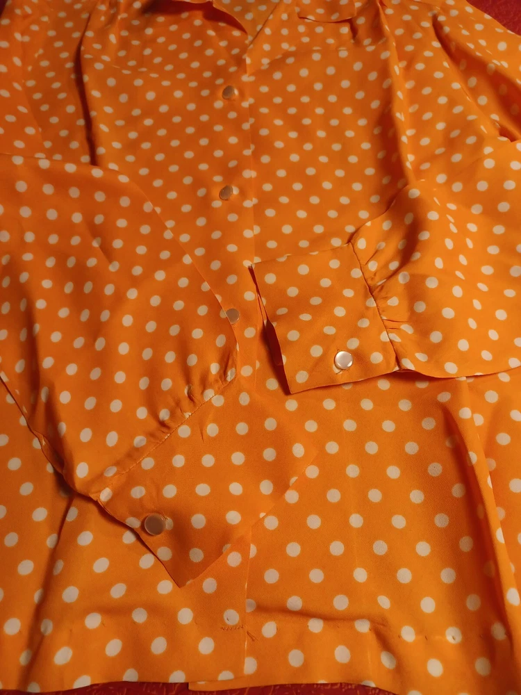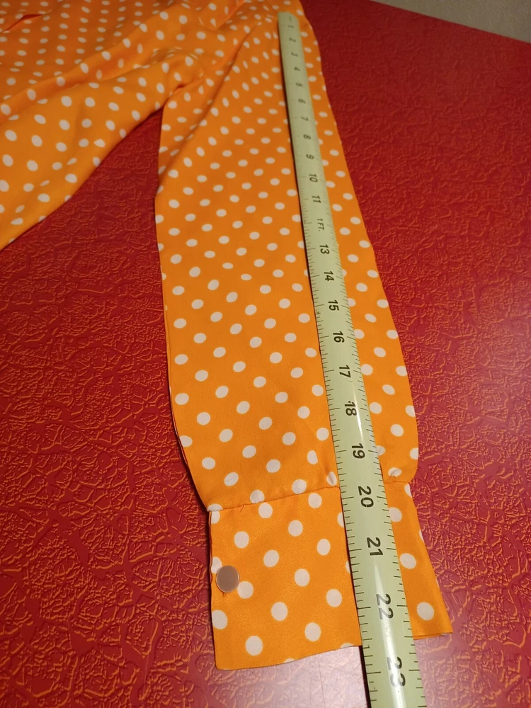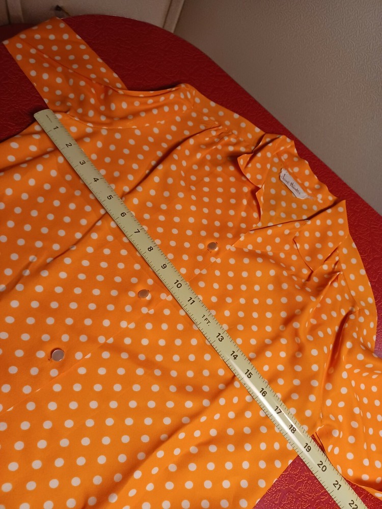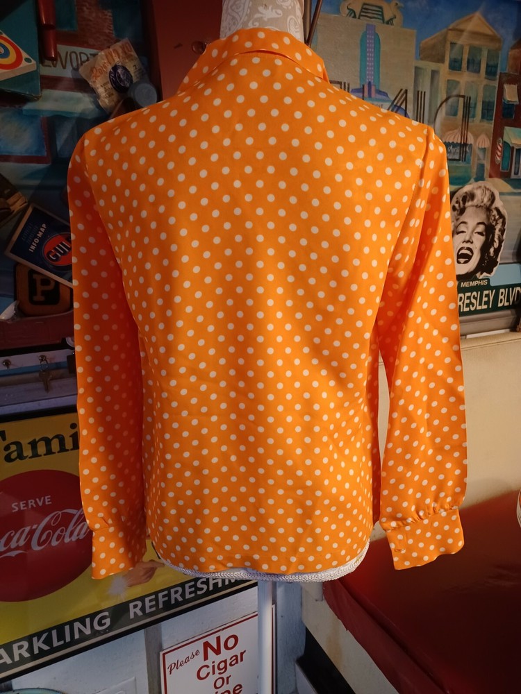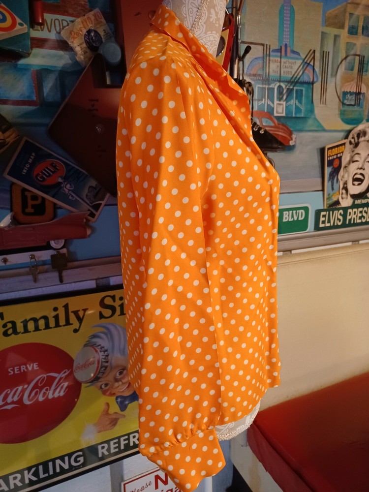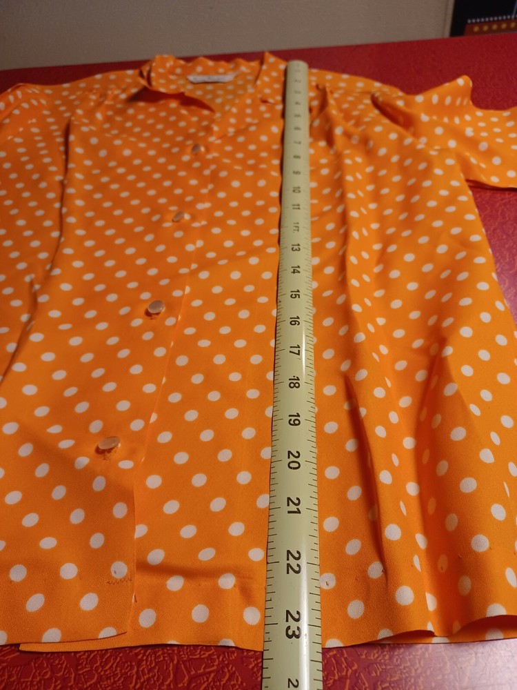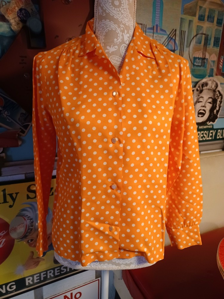 True Vintage Mid-century 1960s Jane Hunter MOD Blouse Top Orange Polka Dot MCM Go-Go. No size tag, but.... ACTUAL MEASUREMENTS IN PHOTOS! Excellent vintage condition. No holes, tears or any other damaged or flaws. No funky odors. All buttons intact. Very lightweight fabric. ***Please view all photos carefully as they are an important part of the description including detail, condition and actual measurements.