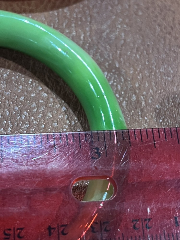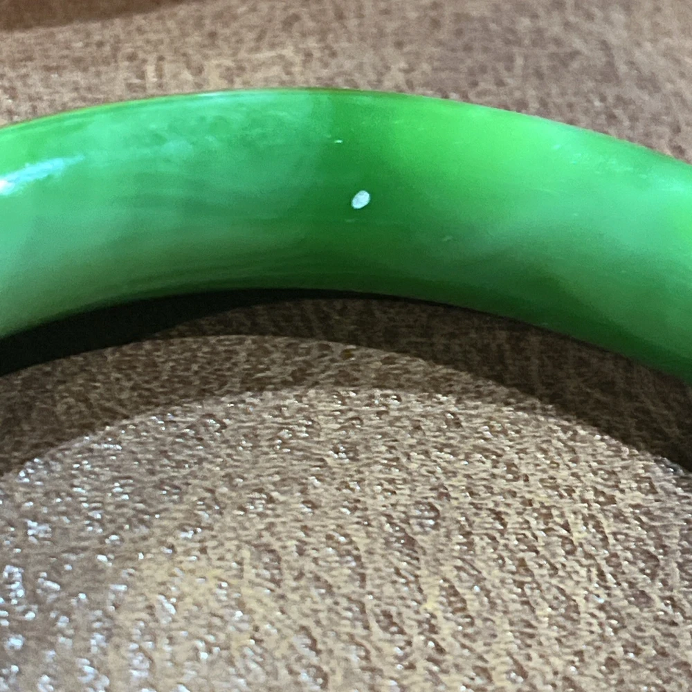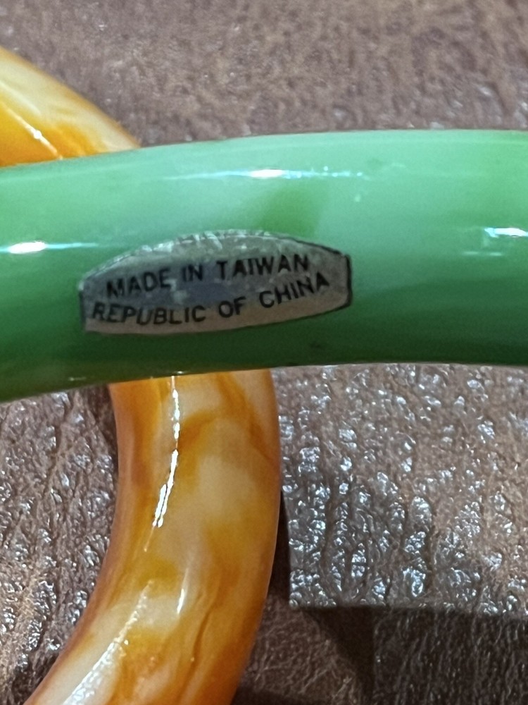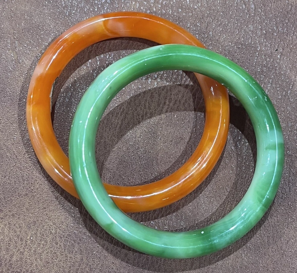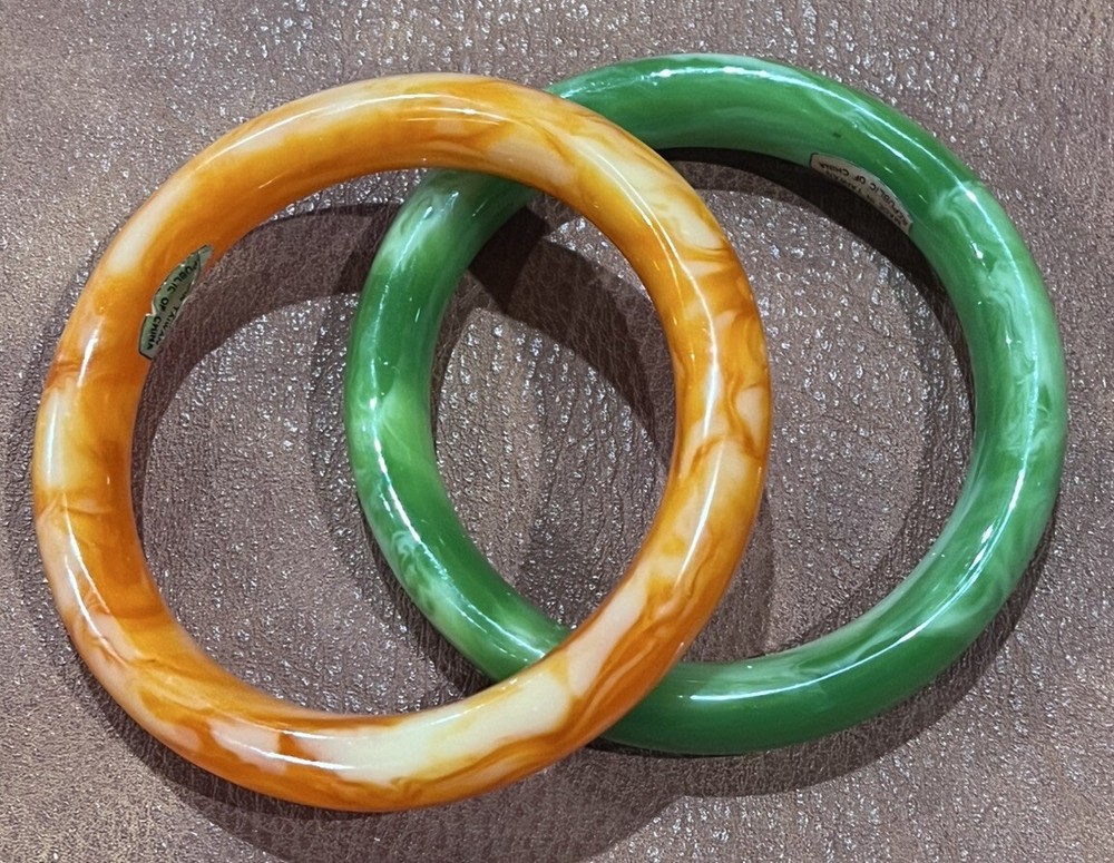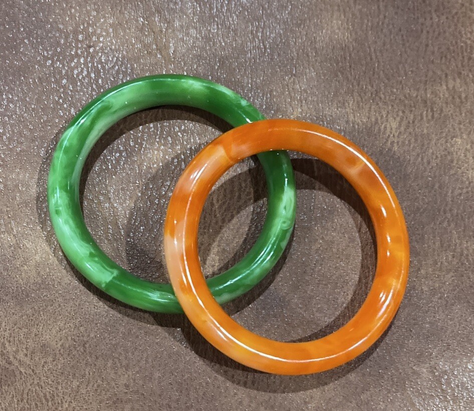 1 Orange and 1 green marbleized acrylic bangles. I know their vintage made in Taiwan republic of china. It’s cold to the touch. There is no mold line so it’s one piece. 3 inch inner circumference The green one has one tiny imperfection, Feel free to make an offer.