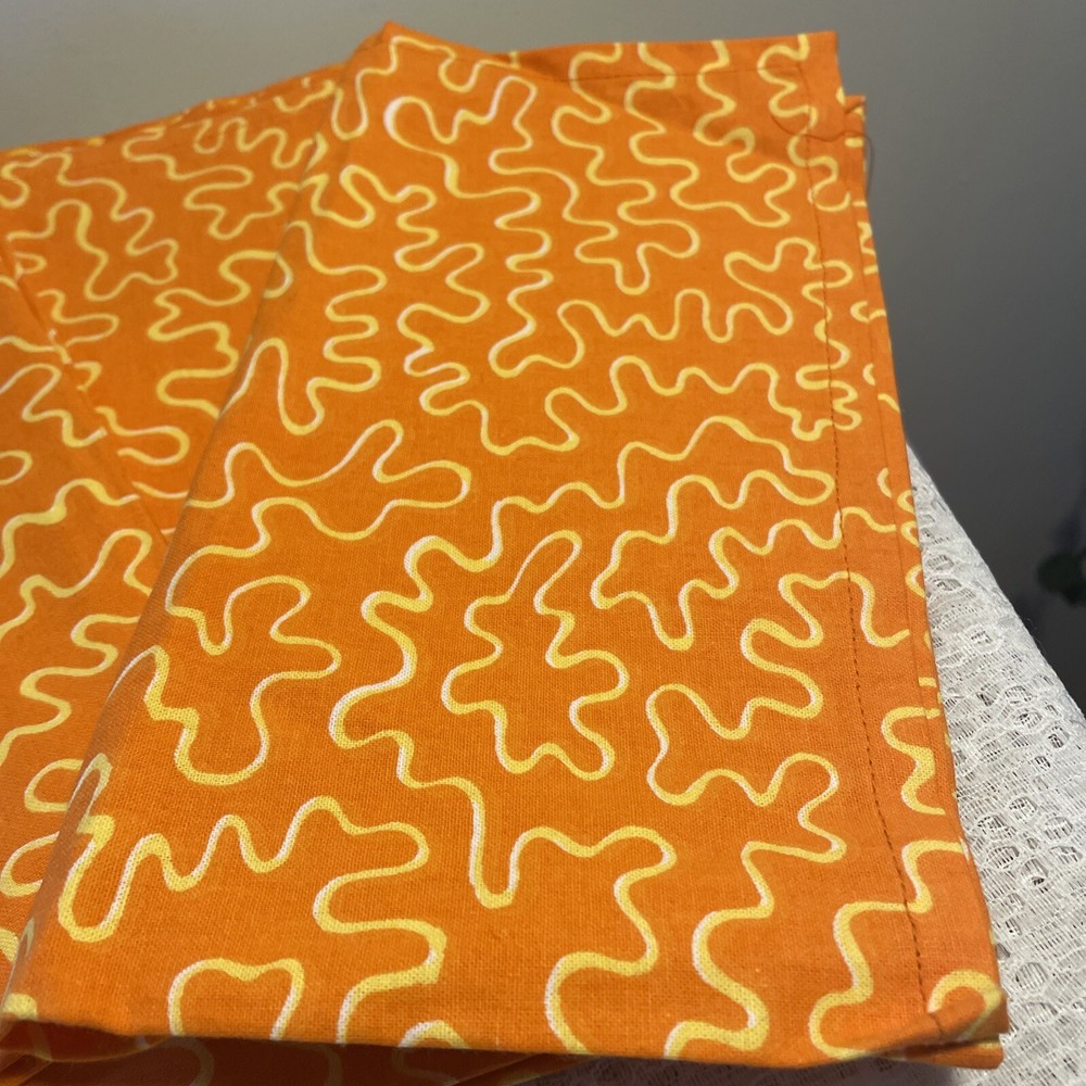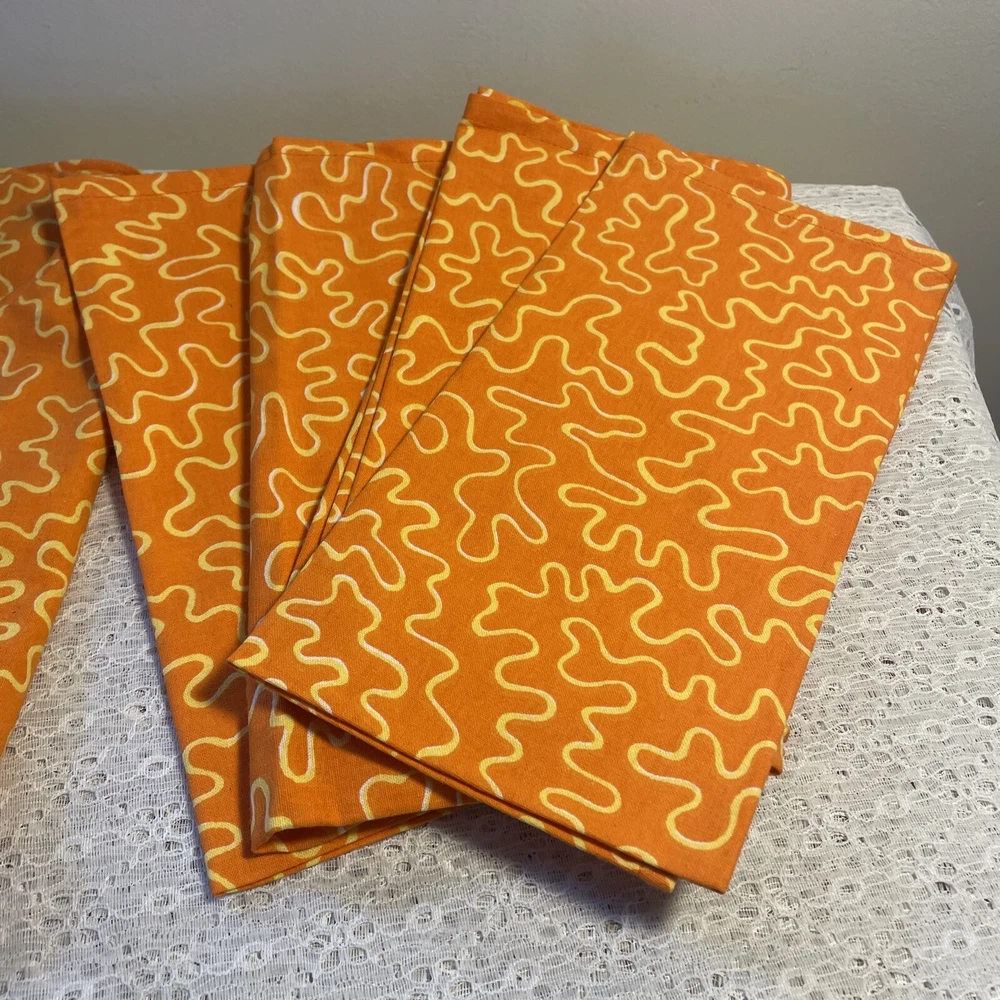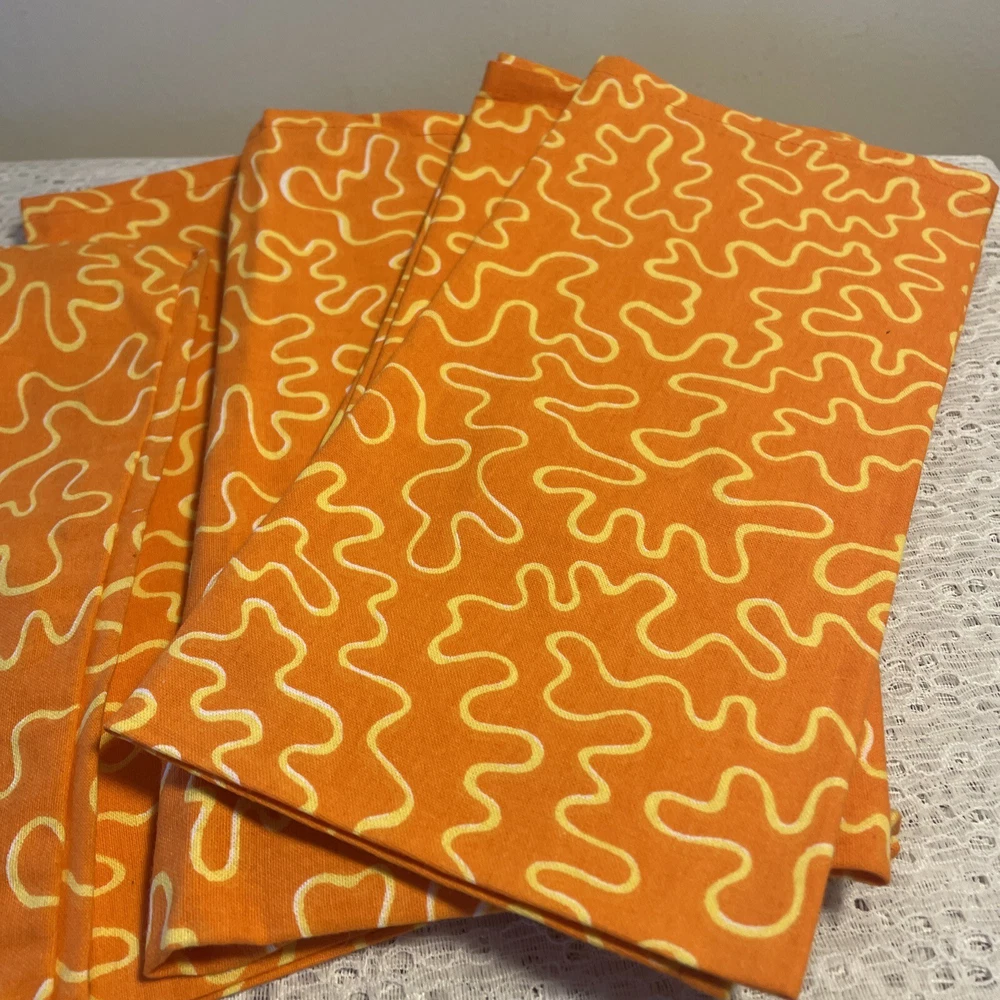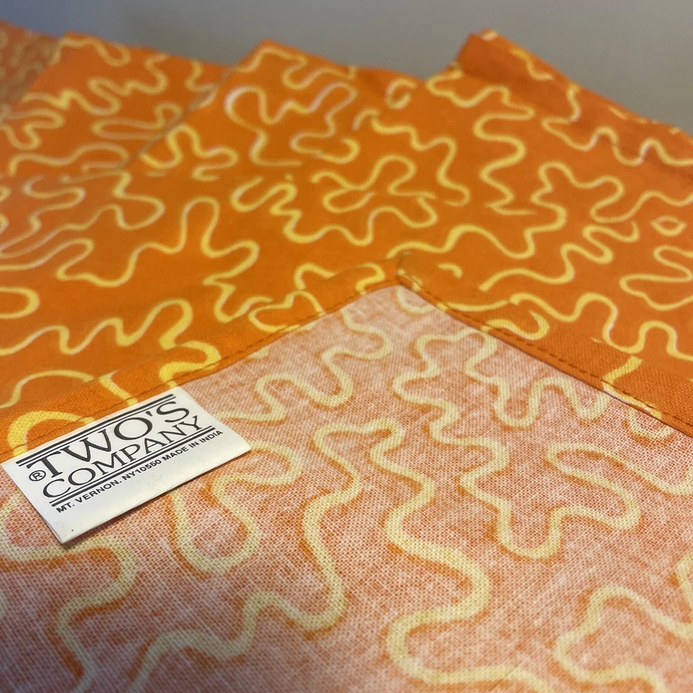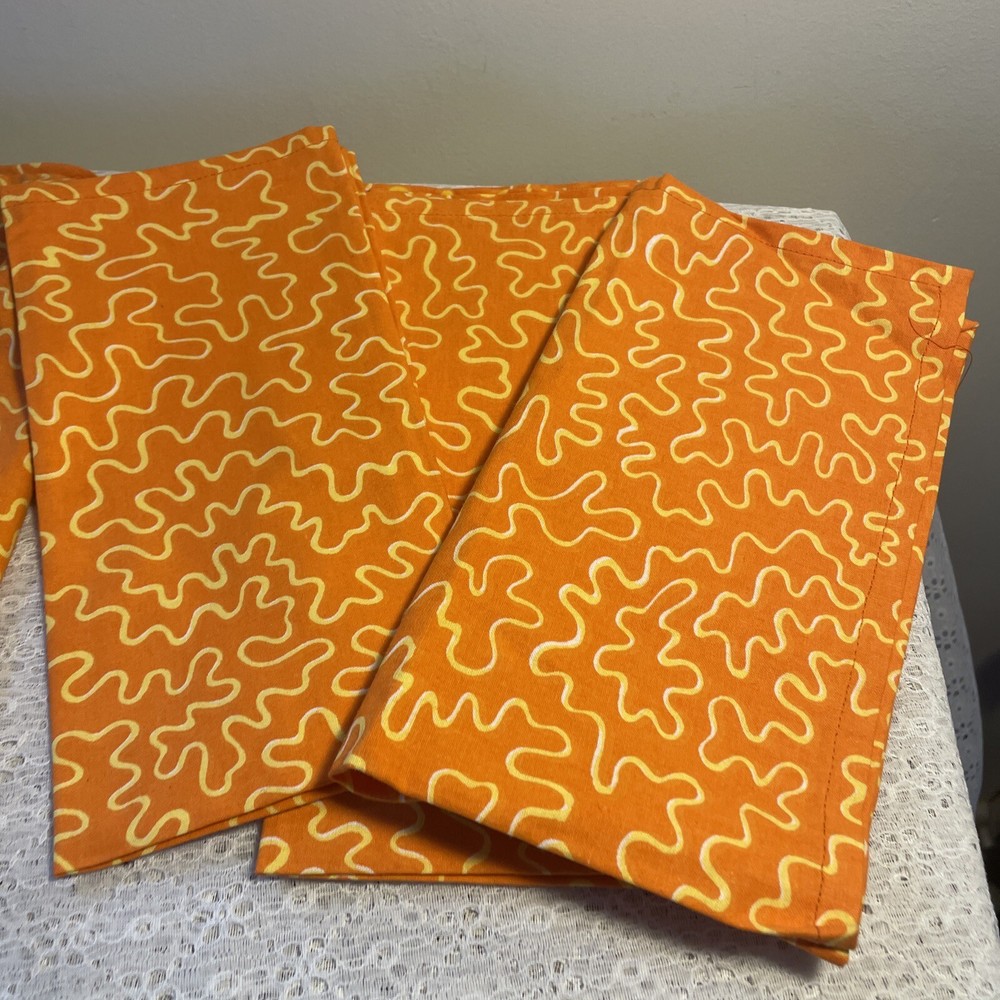 Set of 4 cloth napkins brand new by Two’s Company in an Orange retro 60’s style Mid-Century look. They measure 20”x 20” inches, nice thick cloth and extremely well made. They come with an envelope buttoned case made from the same material for storage. A great unused treasure for sure of high quality. Quick gentle shipping from a loving smoke free home.
