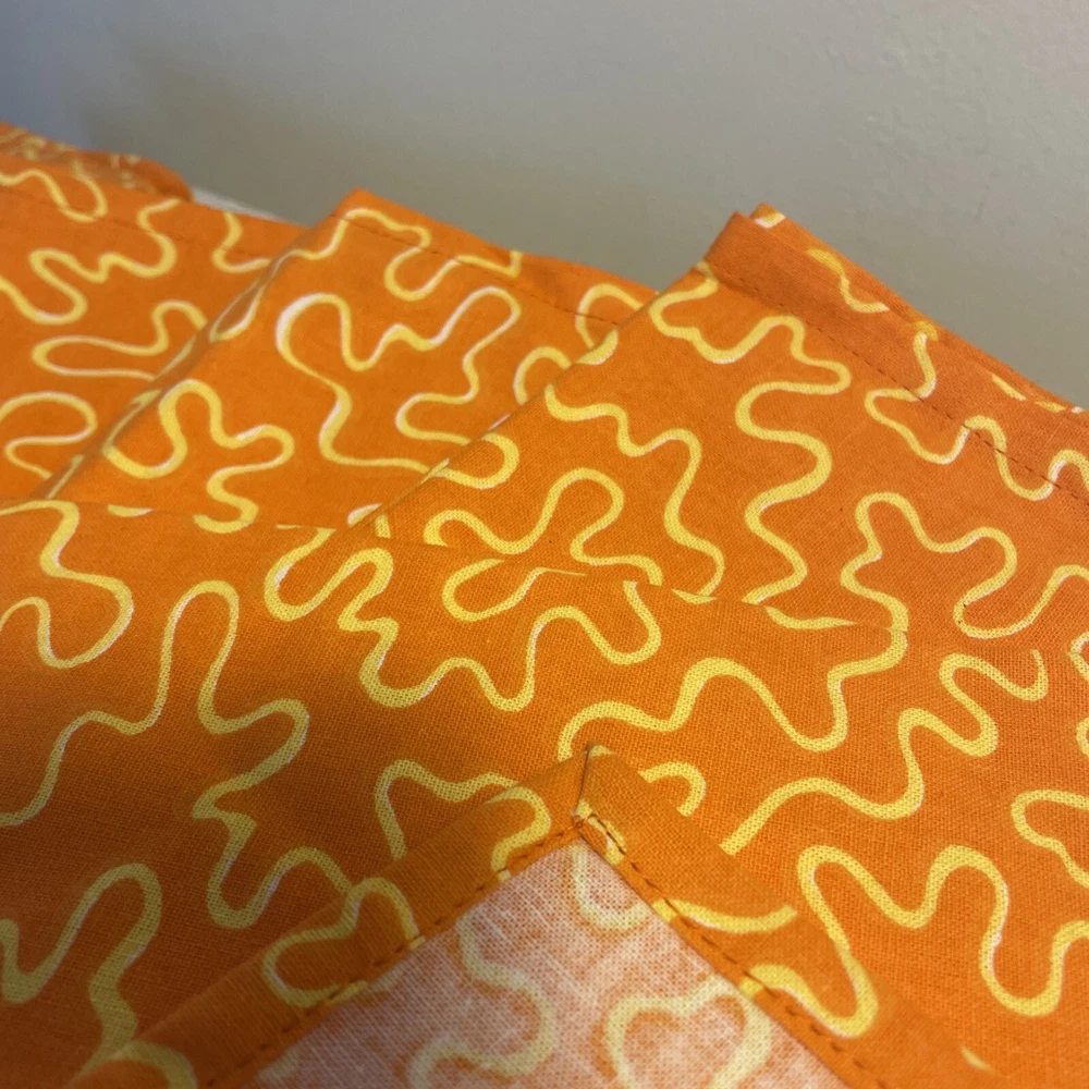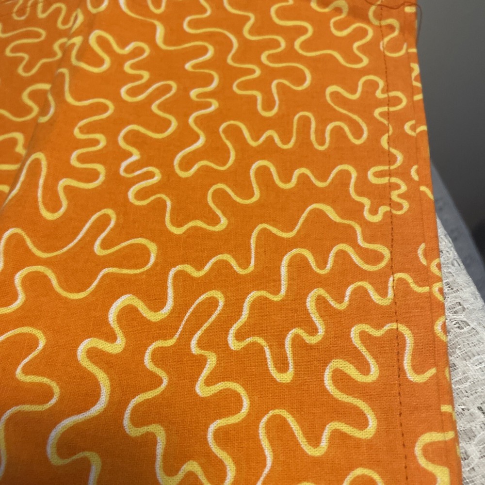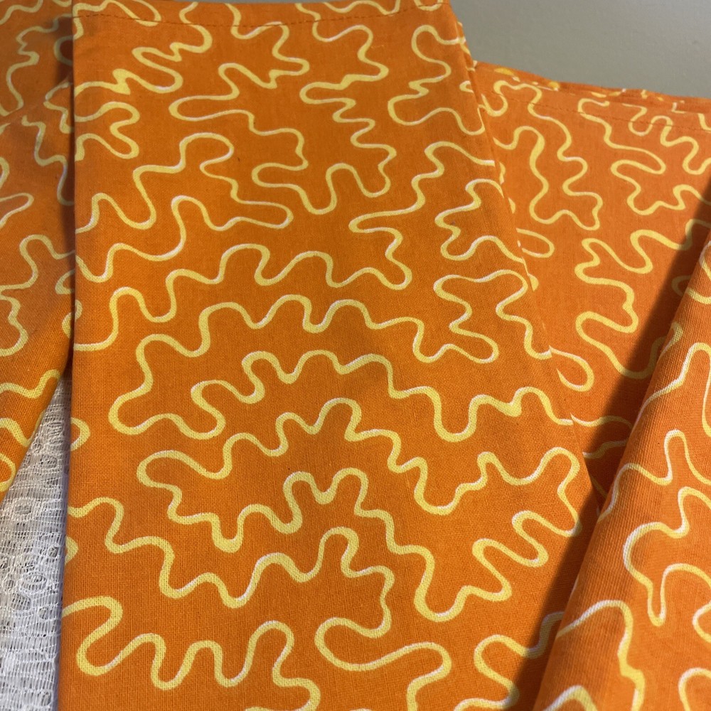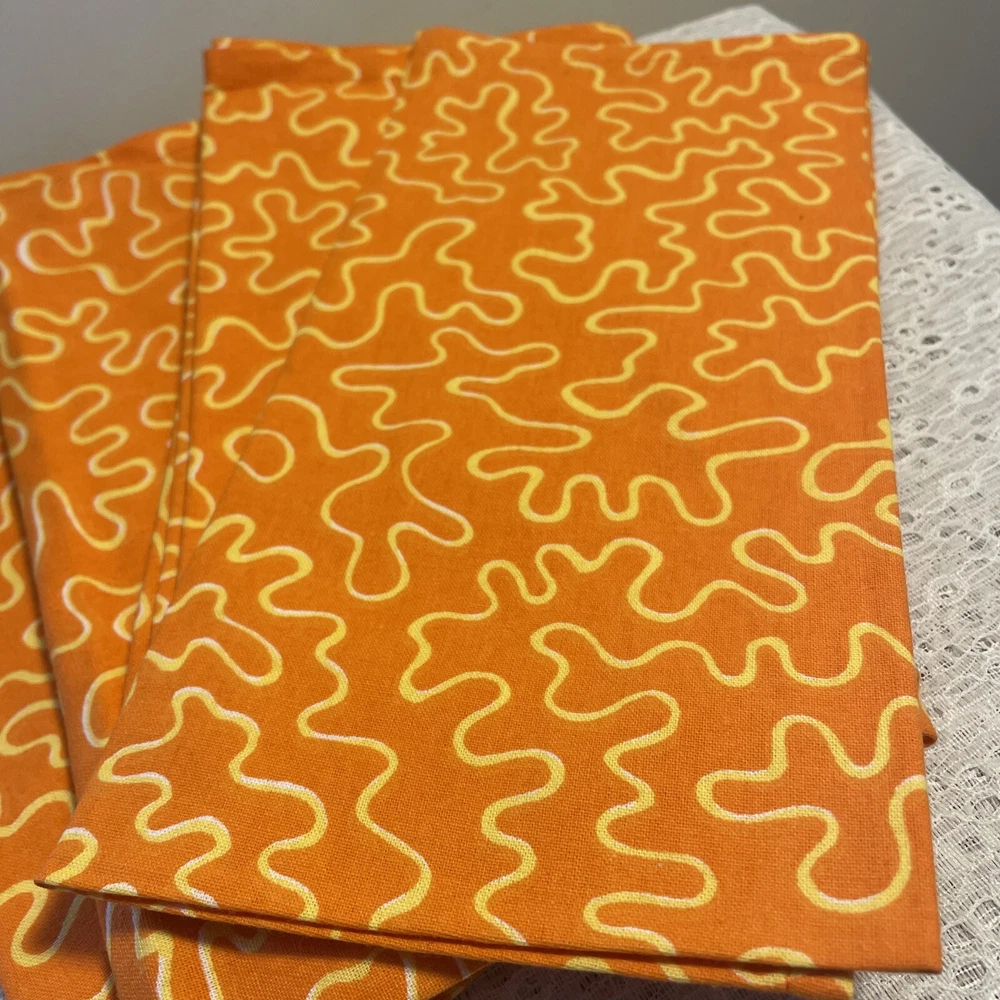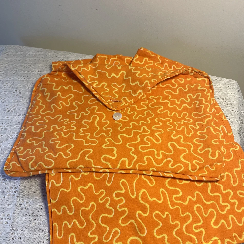 Set of 4 cloth napkins brand new by Two’s Company in an Orange retro 60’s style Mid-Century look. They measure 20”x 20” inches, nice thick cloth and extremely well made. They come with an envelope buttoned case made from the same material for storage. A great unused treasure for sure of high quality. Quick gentle shipping from a loving smoke free home.