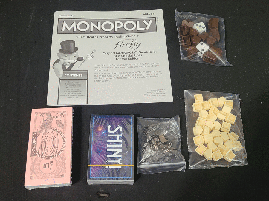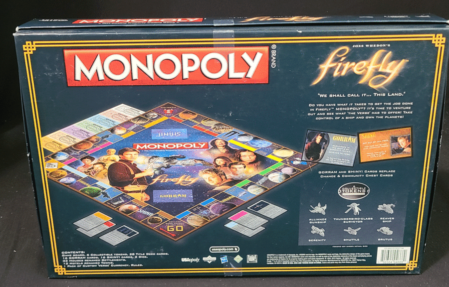 USAopoly Monopoly Firefly Edition Joss Whedon Property Trading Board Game Complete USAopoly Monopoly Firefly Edition Property Trading Board Game The box to this game is in overall good used condition and shows only minor signs of storage wear and tear over the years. The box suffers from some scuff marks along the edges, scratches and some dented corners. Despite the flaws the box remains quite sturdy and the artwork vibrant in color! The pieces inside the box are all in good condition, still sealed in plastic, and will give you many more hours of enjoyment! This game is 100% complete and ready for you to enjoy!! PLEASE NOTE: The pieces to this game were carefully counted to make sure that all pieces are present and accounted for. However, in the rare case that my counting proves to be inaccurate and the game is missing a couple pieces and does not meet your expectations you may return the game to me for a full refund!!! Other Information: Please do not ask me to close an auction early with a buy it now. I do not close auctions early out of fairness to other potential bidders. On items listed "AS IS" make sure to ask plenty of questions before you bid. I am always happy to answer all of your questions. My feedback rating is very important to me, so if you are unsatisfied with your E-bay transaction, please contact me before leaving feedback. I will work with you to make things right! Your satisfaction with the transaction is a top priority of mine! All items come from a smoke/pet free home. It is my goal to make your E-bay transaction with me a positive one! See my other listings for more great items! PAYMENT Payment must be received in 7 days after the close of the auction. Failure to pay will lead to automatic cancellation of the auction and a non-payment bidder report filed to E-Bay. All non-payment bidders will be blocked. Contact me if you are unable to pay within the three days allocated for payment. I will work with you to extend the time to pay. SHIPPING: I use Fedex Home Delivery & USPS for most of my shipping needs. I do combine shipping when possible to save you money. All P.O. Box addresses are shipped USPS. Please contact me for estimated shipping charges. I ship within 3 days after payment is received Free local pick up International Shipping: I will happily ship this auction worldwide. I use the Ebay Global Shipping method for most of my shipping needs. I Do Not Ship Internationally if the package is Oversized. I Do Not Mark the package as “Gift” when shipping internationally. I ship within three days after payment is received. Refund Policy: No refunds are given on listings marked AS IS. If you are unsatisfied with your auction you may send it back for a full refund. Returns are accepted after 30 days of auction close. txzj pxzj2260 txzj63