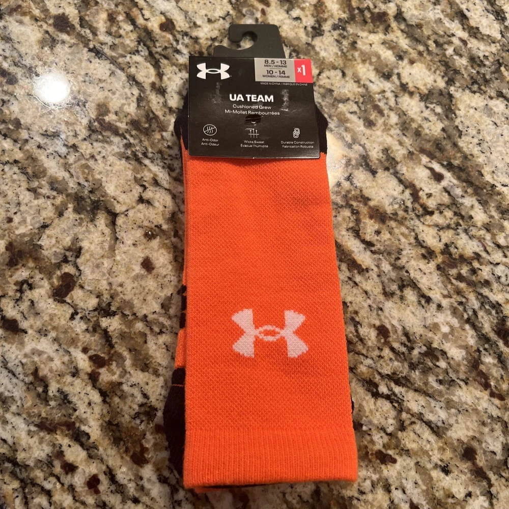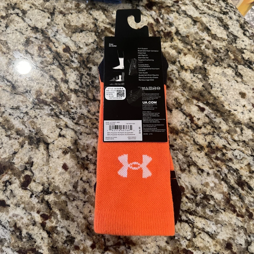 Elevate your performance and style with these Under Armour crew socks. The orange, mid-calf length sock features the iconic UA logo and is made from a durable and comfortable polyester blend. The sock is machine washable and features ArmourBlock technology, ensuring freshness and odor control. Ideal for gym and training as well as running and jogging, these socks provide arch support and moisture-wicking capabilities, making them perfect for all seasons. Whether you're a fan of classic themes or the UA Training character family, these socks are a must-have addition to your wardrobe. N1