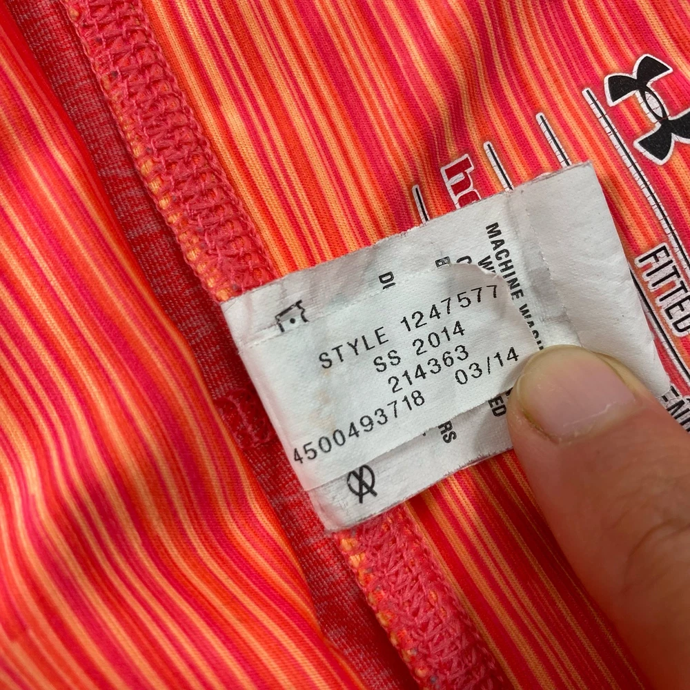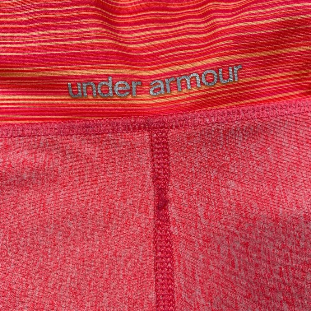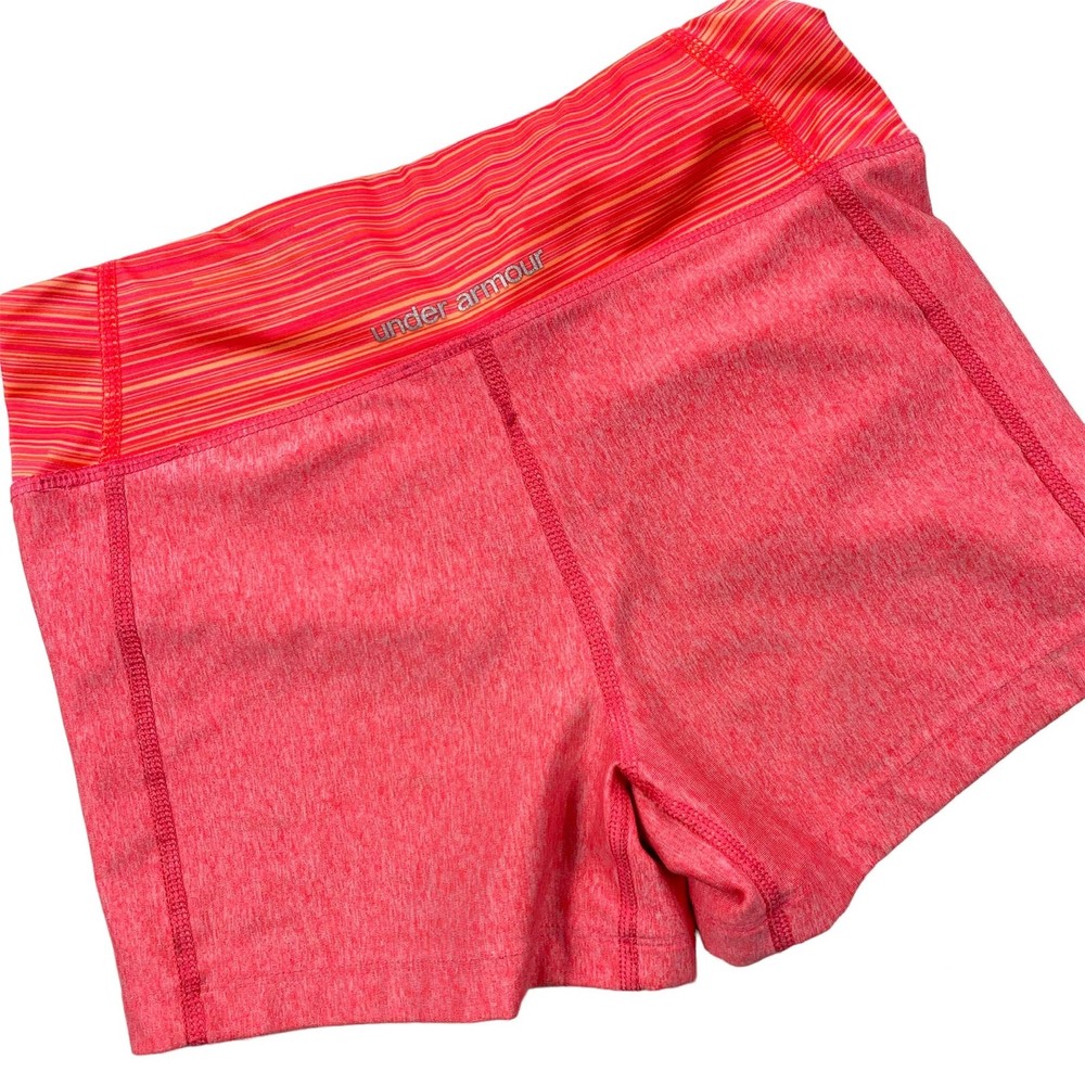 <![CDATA[<div>Under Armour HeatGear Athletic Shorts Compression Pink Orange Striped Mid Rise Shorty Tight Womens Size XS They are made of a polyester blend material that is easy to care for and quick-drying. The elastic waist, compression fit, and breathable fabric provide comfort and support during workouts. Under Armour reflective logo on leg and back waist Elastic waist with colorful striped pattern 80% Polyester 20% Elastane Stretchy Breathable fabric Womens size XS Dimensions taken laying flat. Measurements are approximate Waist 12" Rise 8" Inseam 3" Great Condition Keywords colorful fun breathable shorty mid rise compression gym biking yoga cycling performance athletic athleisure sports reflective logo stretchy shorts running moisture wicking heatgear fitted