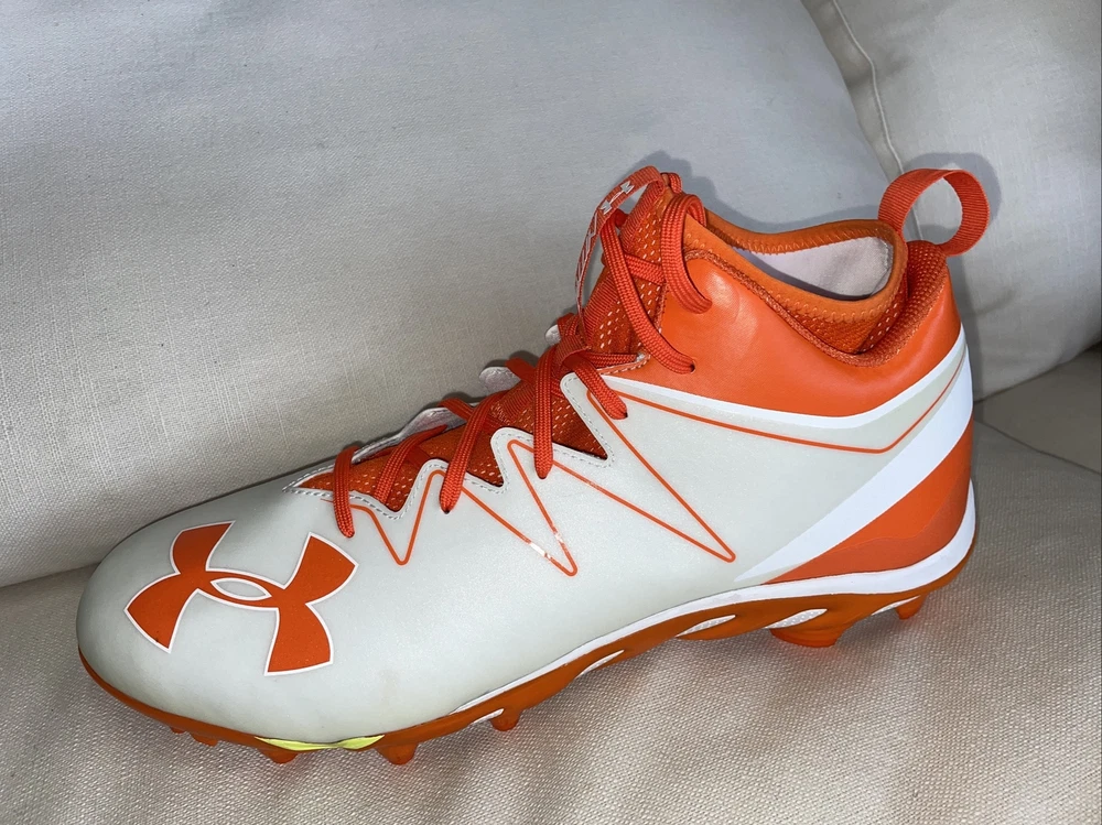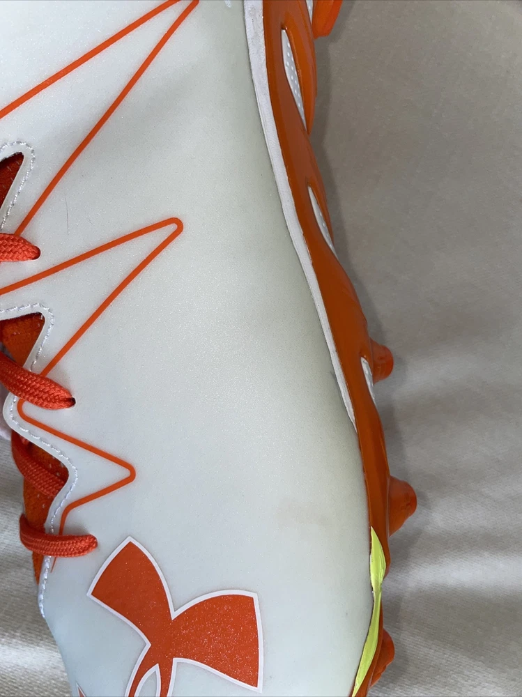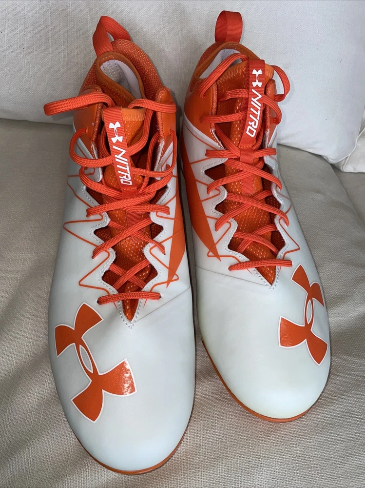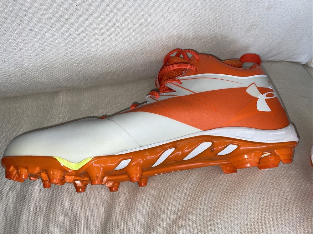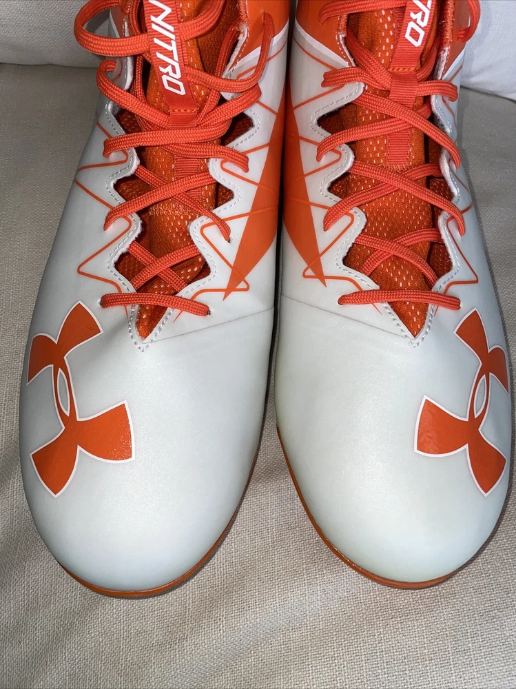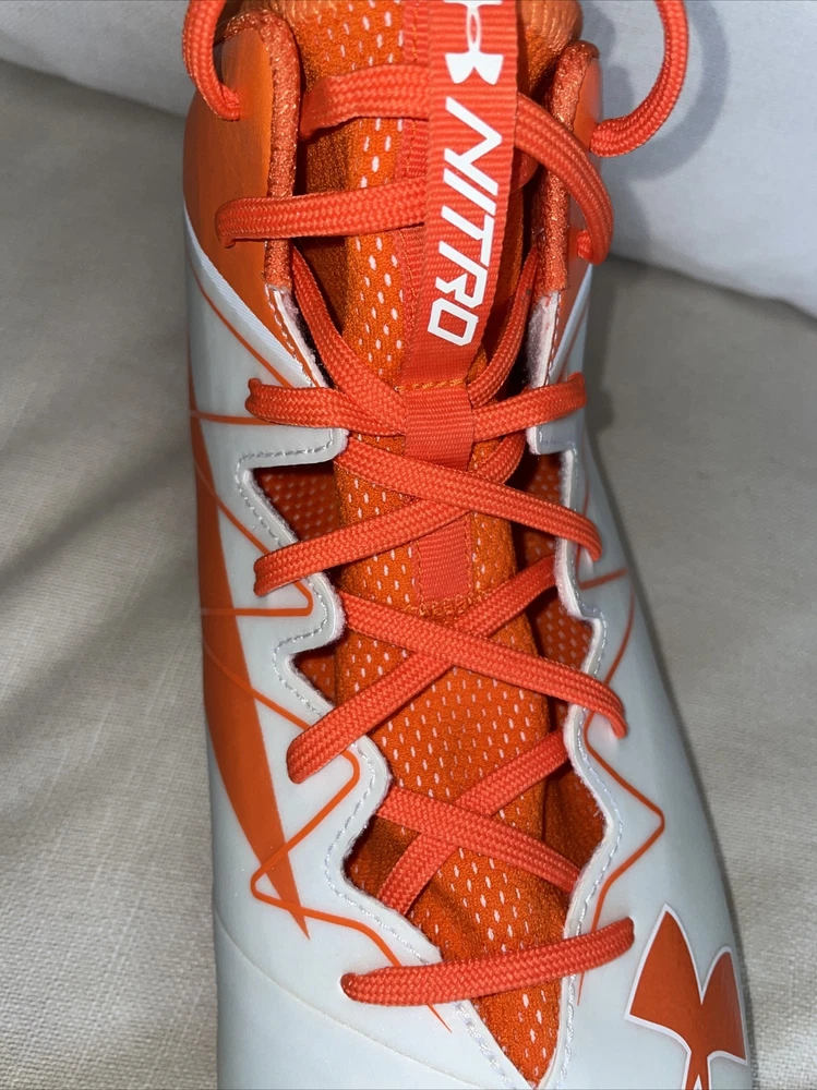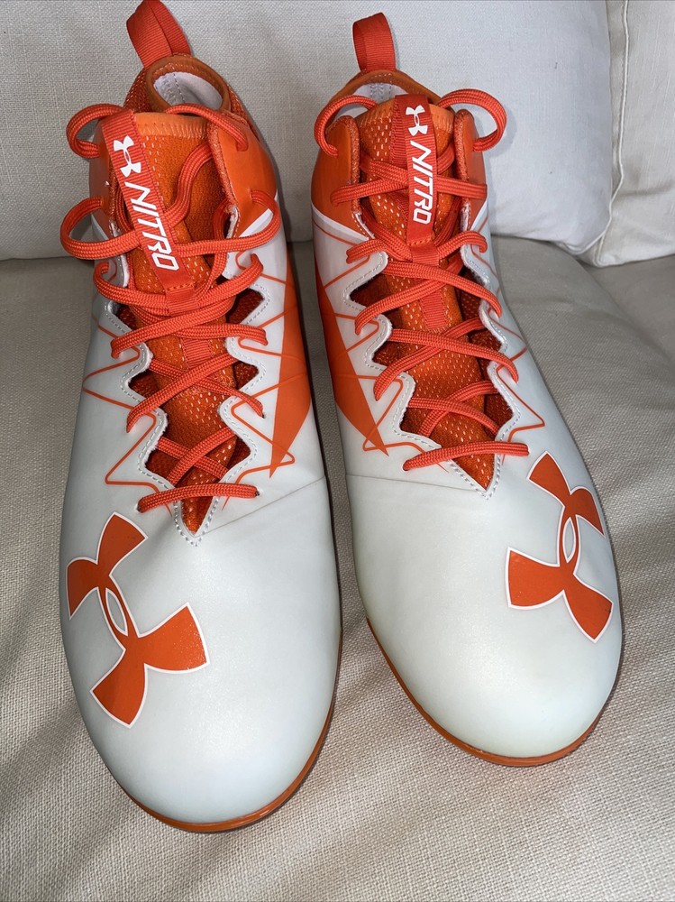 Under Armour Nitro Football Cleats Mid Orange White Men's SZ 16 | 1287491-180 P6. New without box. Mens size 16 USA Made in China 4D foam insoles Orange with White The only minor discrepancy is some yellowing discoloration near the sole where the white meets the yellow and orange. Might be the design but I’m disclosing! Smoke free home!!! Smoke free pet free storage Please see all pictures All sales final. No returns Ships usps priority Mail UPS GROUND or FedEx home depending on buyer location and at sellers discretion. P6