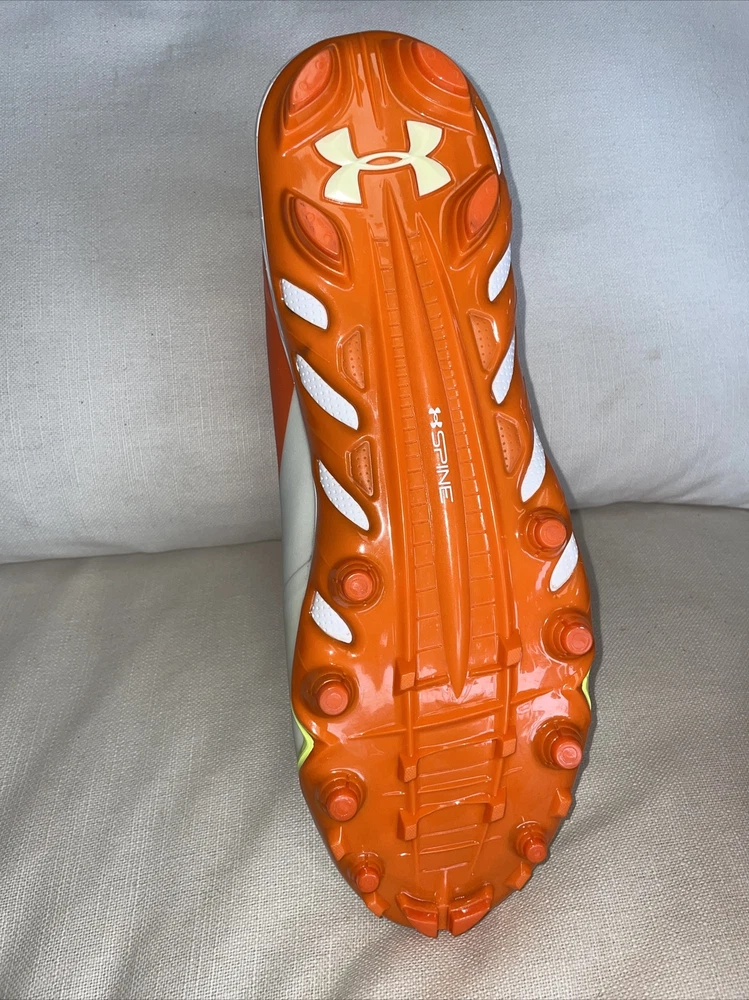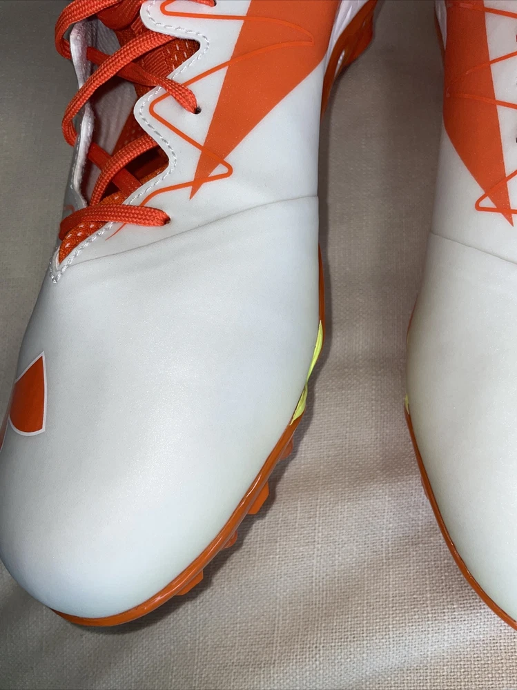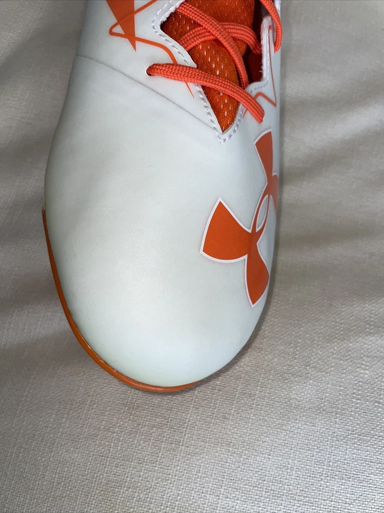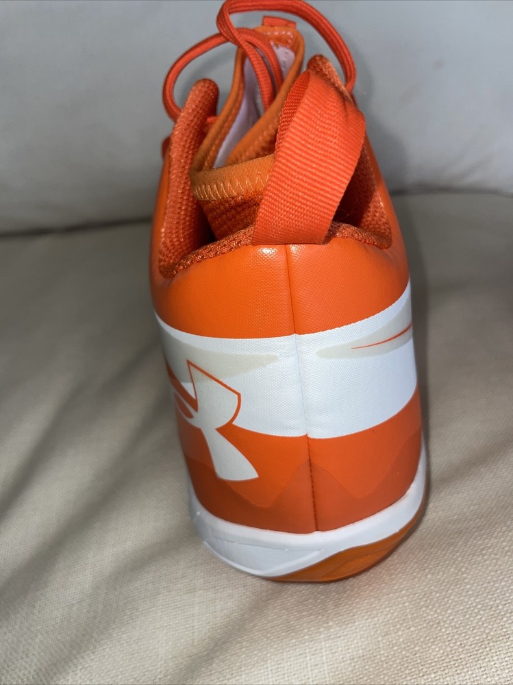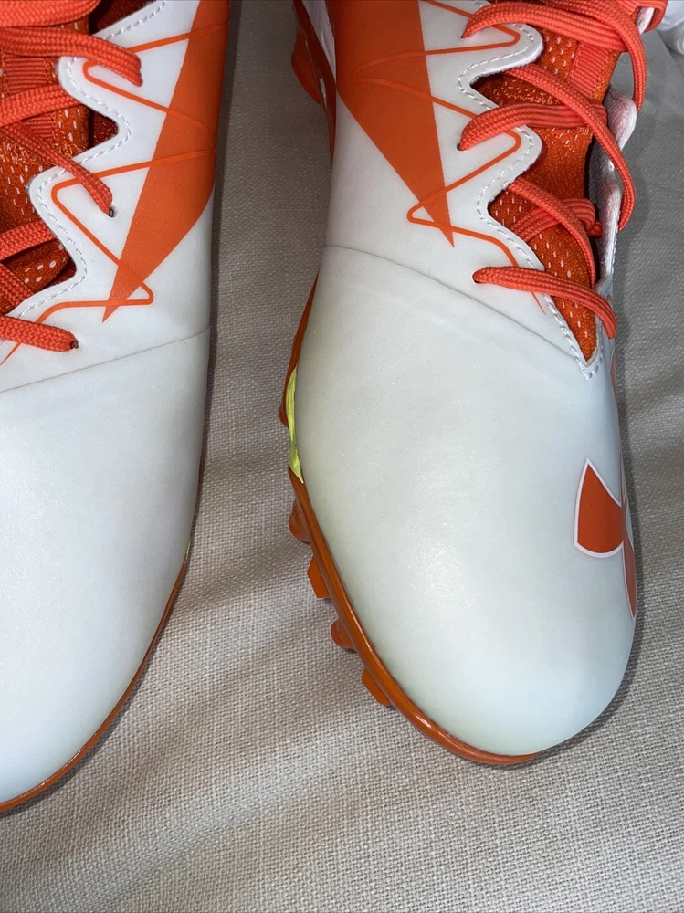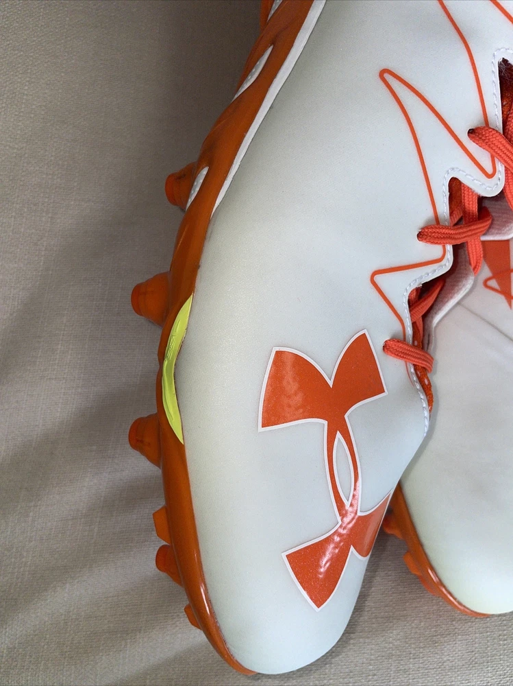 Under Armour Nitro Football Cleats Mid Orange White Men's SZ 16 | 1287491-180 P6. New without box. Mens size 16 USA Made in China 4D foam insoles Orange with White The only minor discrepancy is some yellowing discoloration near the sole where the white meets the yellow and orange. Might be the design but I’m disclosing! Smoke free home!!! Smoke free pet free storage Please see all pictures All sales final. No returns Ships usps priority Mail UPS GROUND or FedEx home depending on buyer location and at sellers discretion. P6