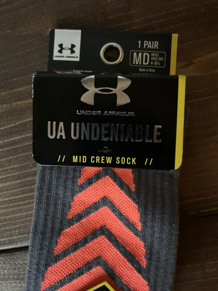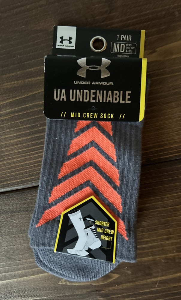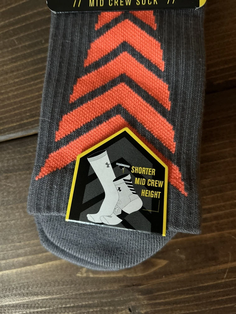 New - Under Armour Heat gear Mid Crew sock Size: Medium (fits men shoe size 4 - 81/2) would fit youth in this shoe size as well Color: Graphite gray and orange
