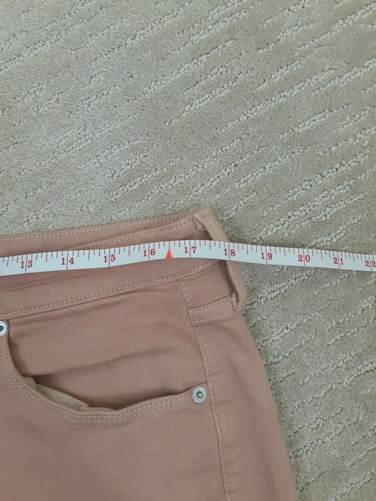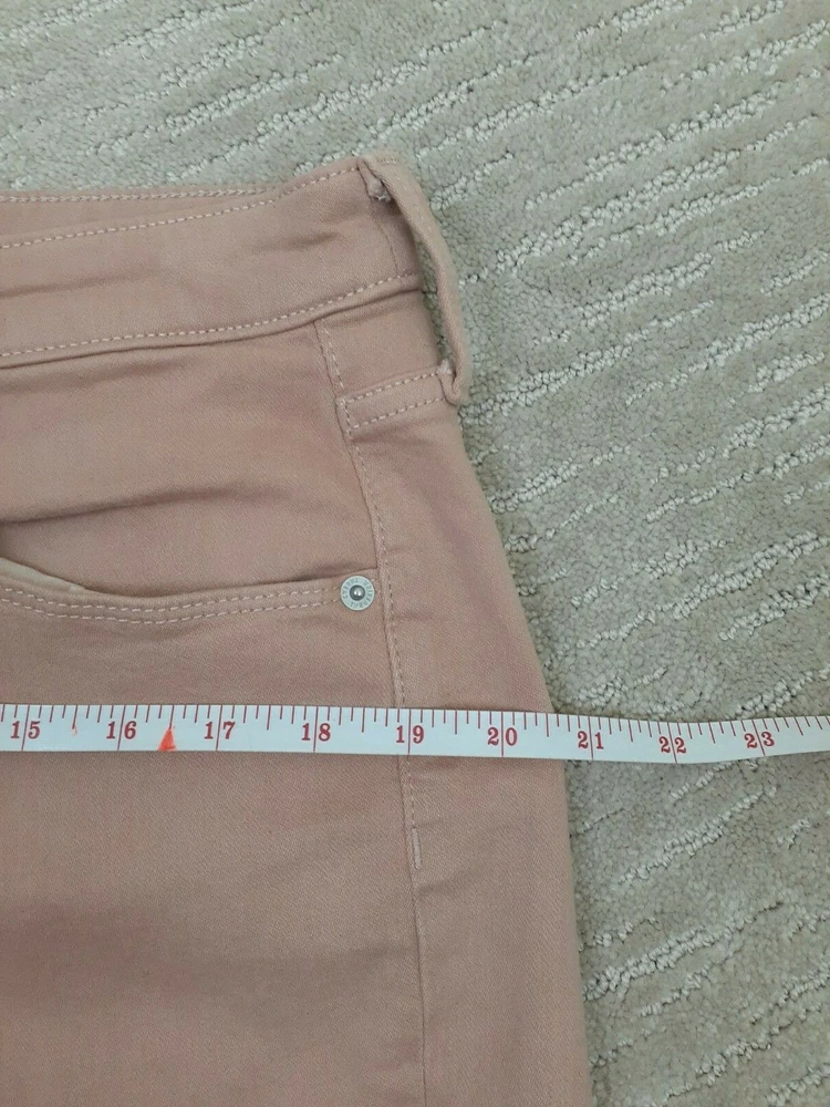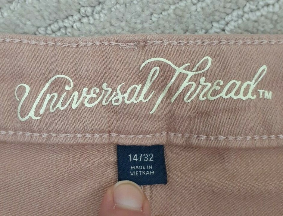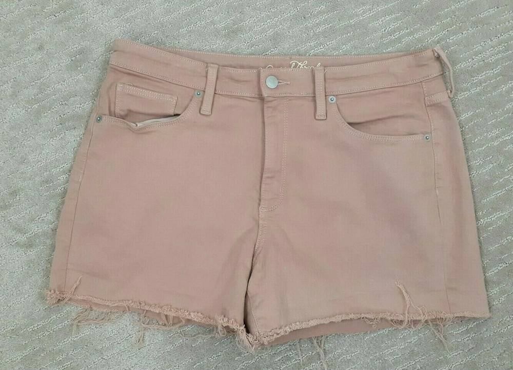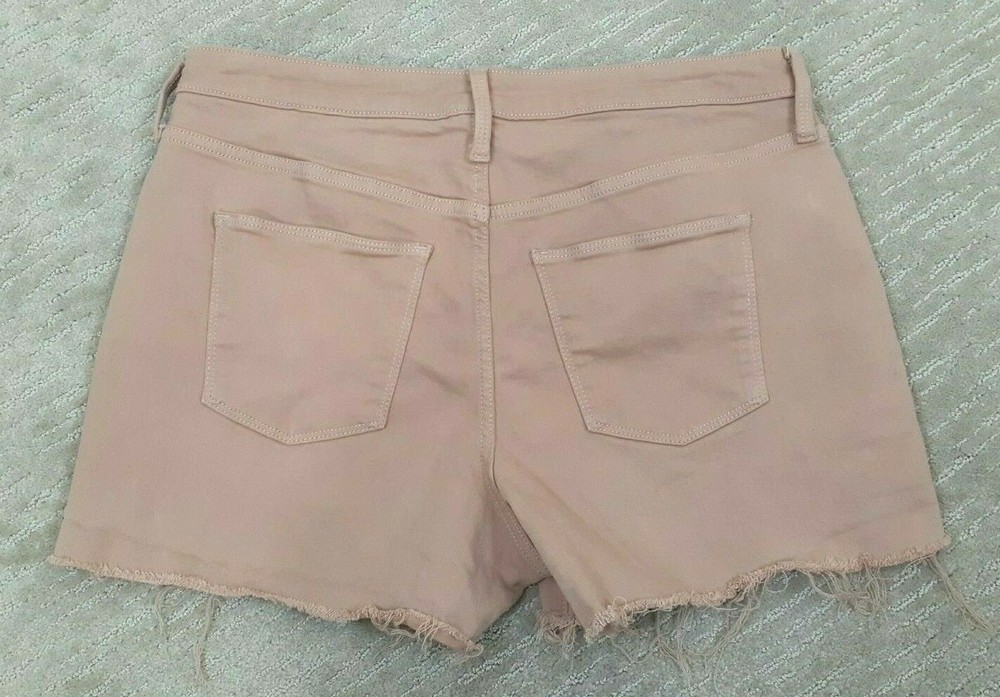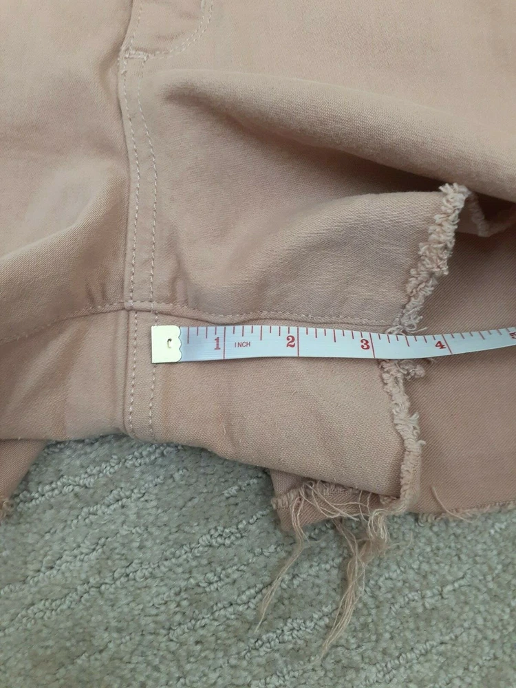 Universal Thread Size 14 Peach Salmon Denim Mid-Rise Cut-Off Shorts Raw Hem - Great pair of peach/salmon/taupe denim cut off shorts! Raw hem! Lots of stretch. Pockets. Waist measures 34 inches, hips measure 20 1/2 inches across and inseam measures 3 inches. Preowned and in good gently used condition! No rips, tears or stains. From a smoke free home.