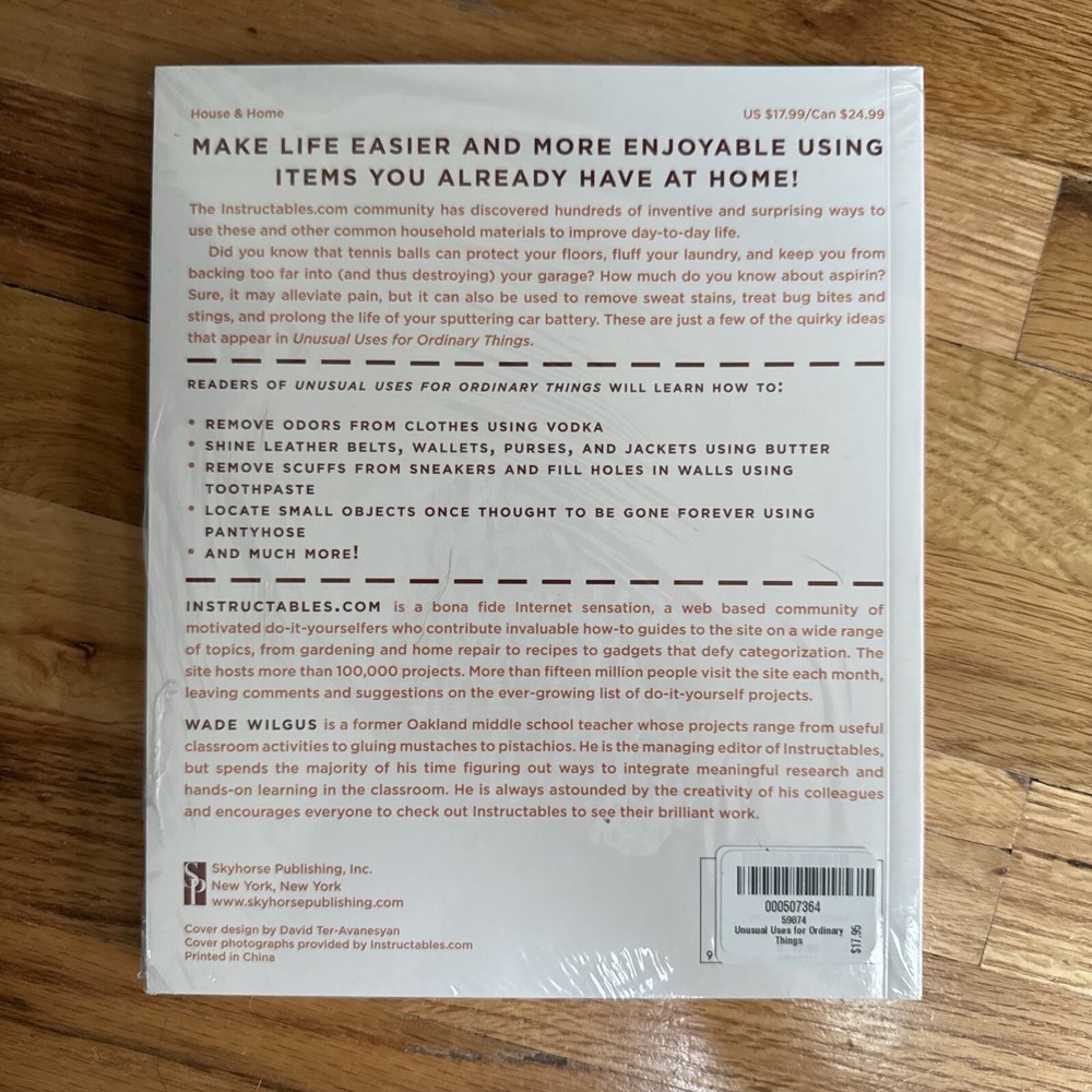 The product is a book titled "Unusual Uses for Ordinary Things: 250 Creative Solutions Using Everyday Items" by Wade Wilgus. Published by Skyhorse Publishing Company, it offers 144 pages of innovative ideas in the genres of House & Home and Architecture. Focusing on topics such as Sustainable Living, Do-It-Yourself projects, Remodeling & Renovation, Sustainability & Green Design, and Repair, the book presents practical solutions for utilizing common items in creative and unexpected ways to promote eco-friendly practices and efficient home improvement.