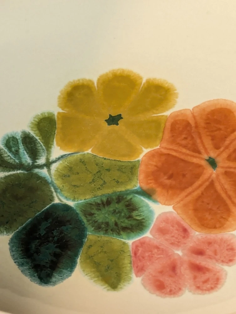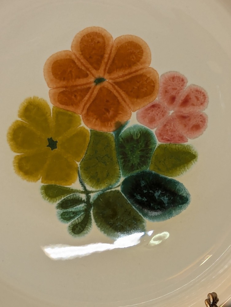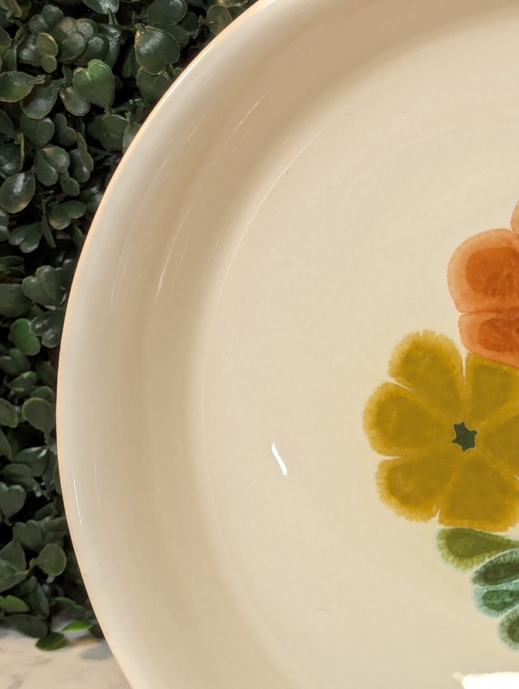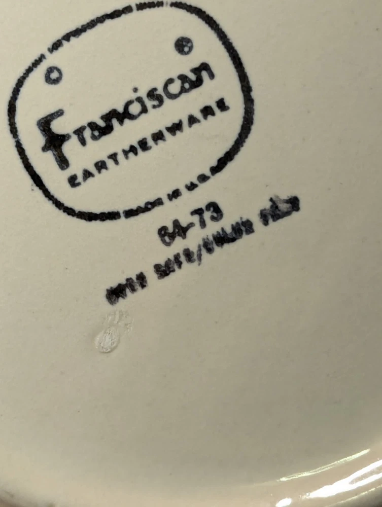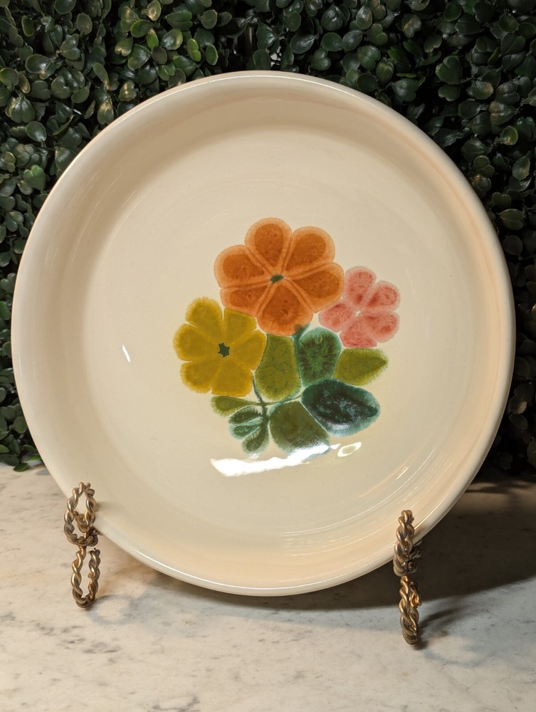 Add a touch of vintage charm to your table setting with this beautiful Franciscan earthenware serving bowl. The round bowl features a lovely floral pattern in shades of pink, orange, gold, and teal, making it a perfect addition to your mid-century modern decor. Measuring 7.75 inches in diameter and 2.75 inches in height, this stoneware bowl is perfect for serving your favorite dishes to your loved ones. Crafted in the mid-20th century, this original vintage serving bowl is a rare find. The glossy finish and printed backstamp add to its unique appeal. Ideal for collectors and enthusiasts alike, this bowl is a must-have for anyone who loves to add a touch of vintage charm to their home decor. Bowls shelf