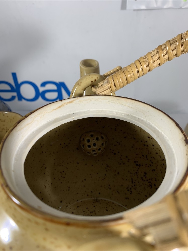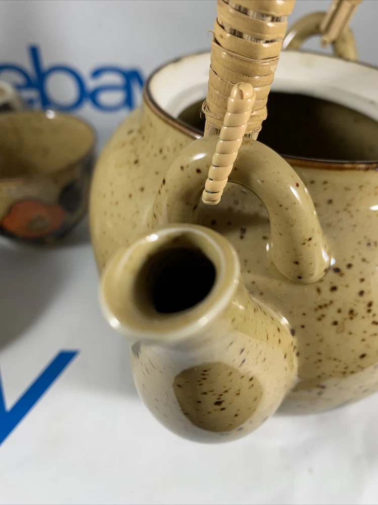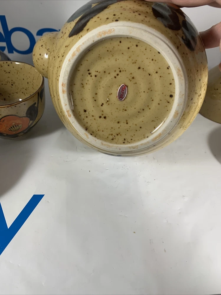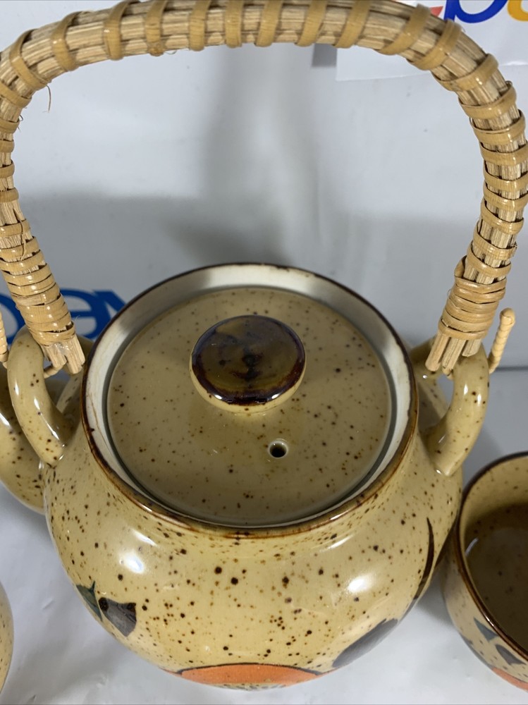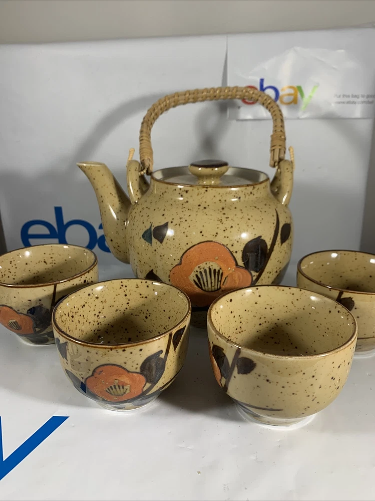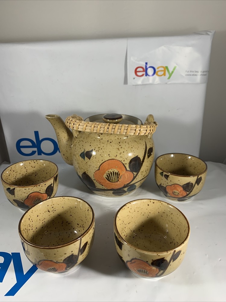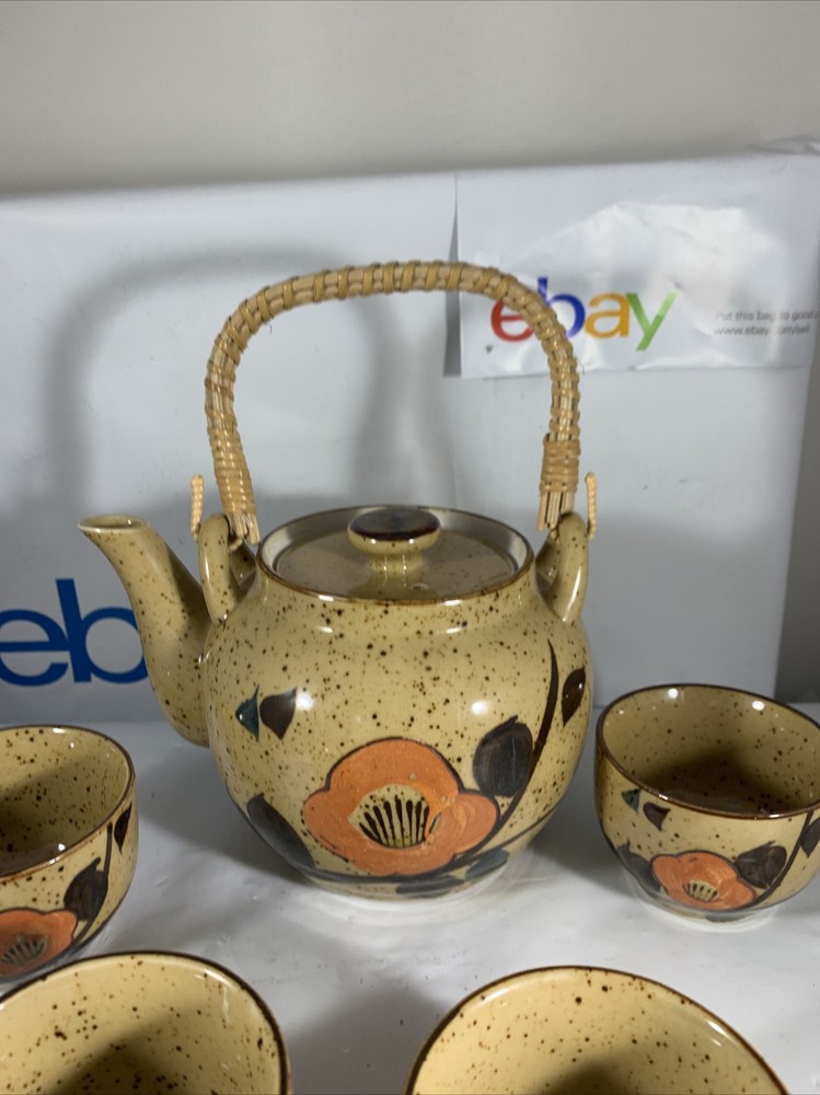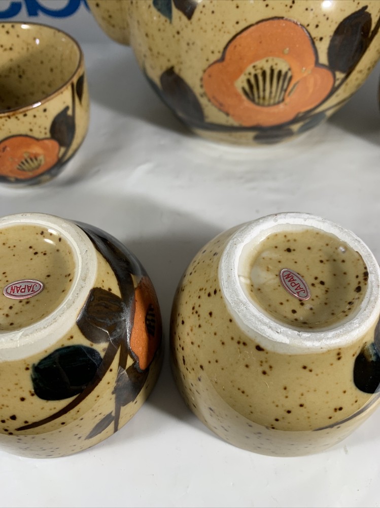 VINTAGE MCM MID CENTURY MOD Orange Flower TEA POT SET JAPANESE. There are no issues with this set has 4 cups has original Japan sticker speckled glaze extremely clean...