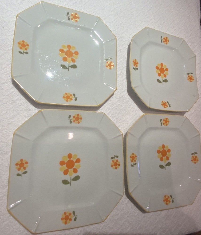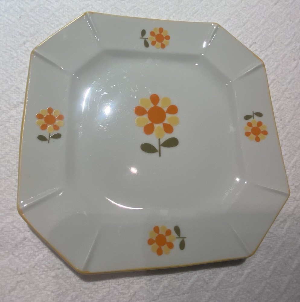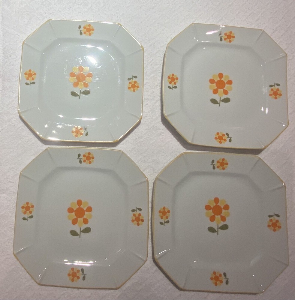 VINTAGE MID CENTURY DESSERT 7 1/4” ORANGE AND YELLOW DAISY PLATES SET 0F FOUR. * PIC 8 SHOWS CHIP ON BOTTOM RIM OF ONE OF THE PLATES. * PLATES ARE IN USED CONDITION AND AS SEEN IN PICS HAVE SOME MINOR WEAR ON TOP OF EACH PLATE. NO CRACKS OR CRAZING.