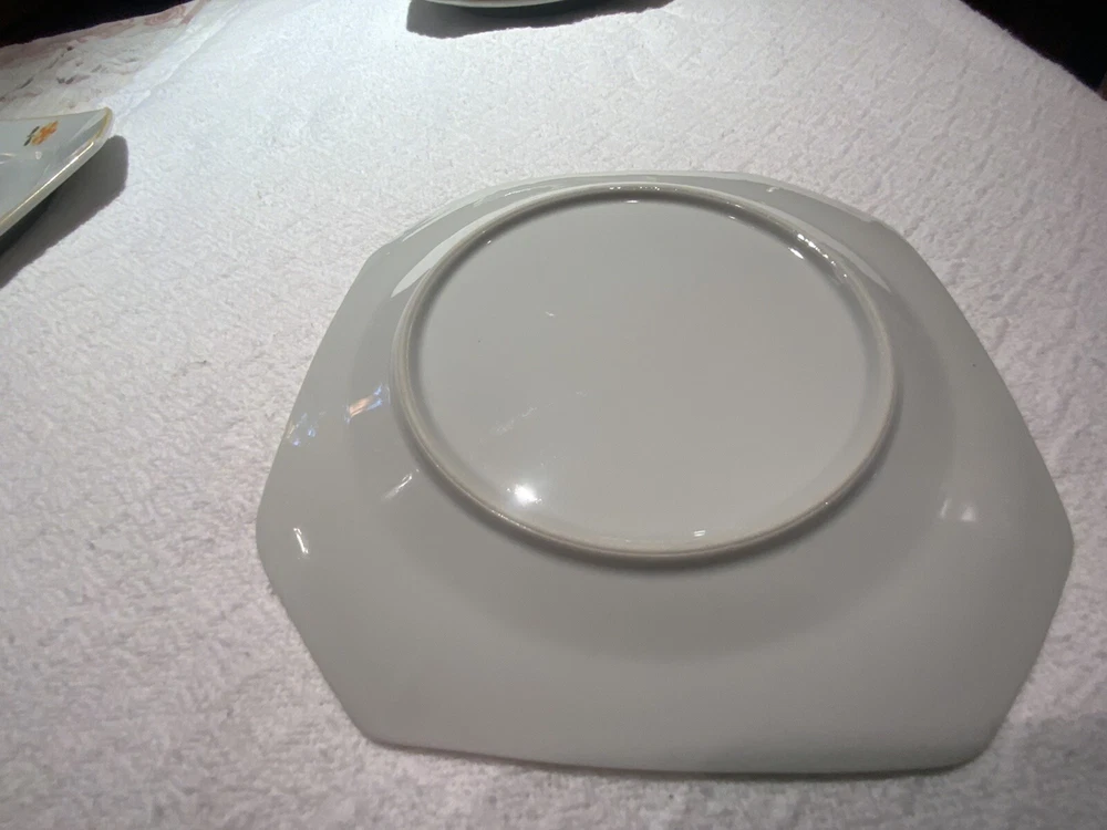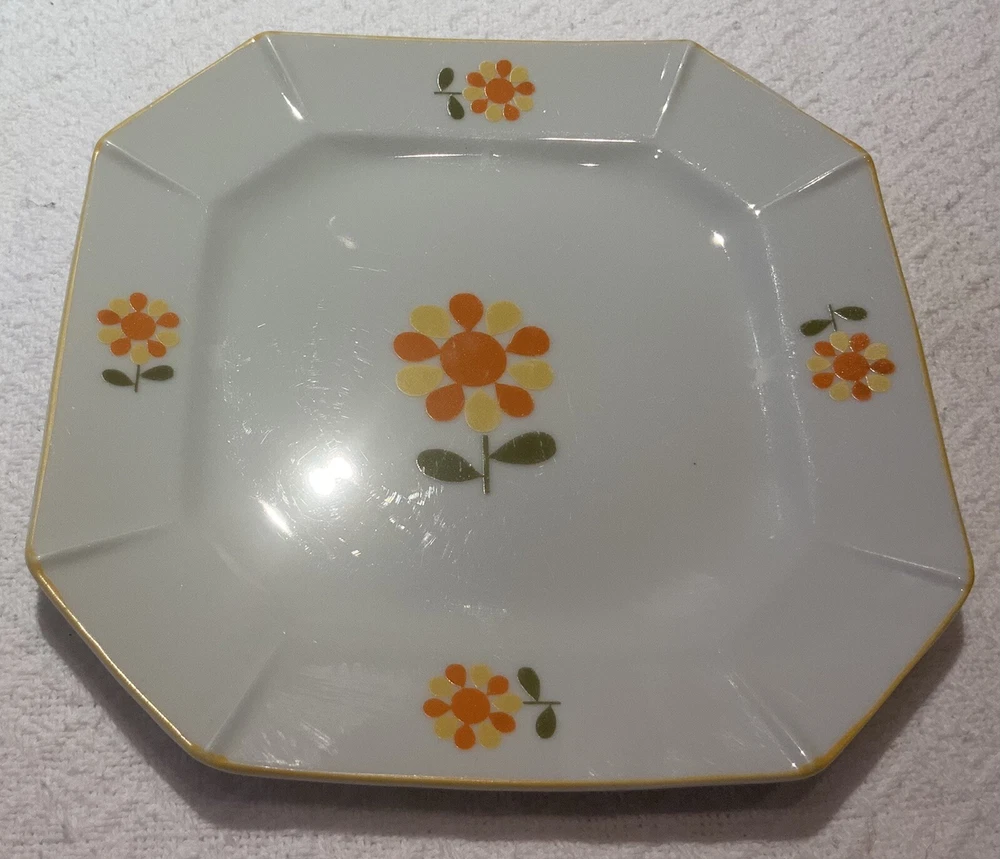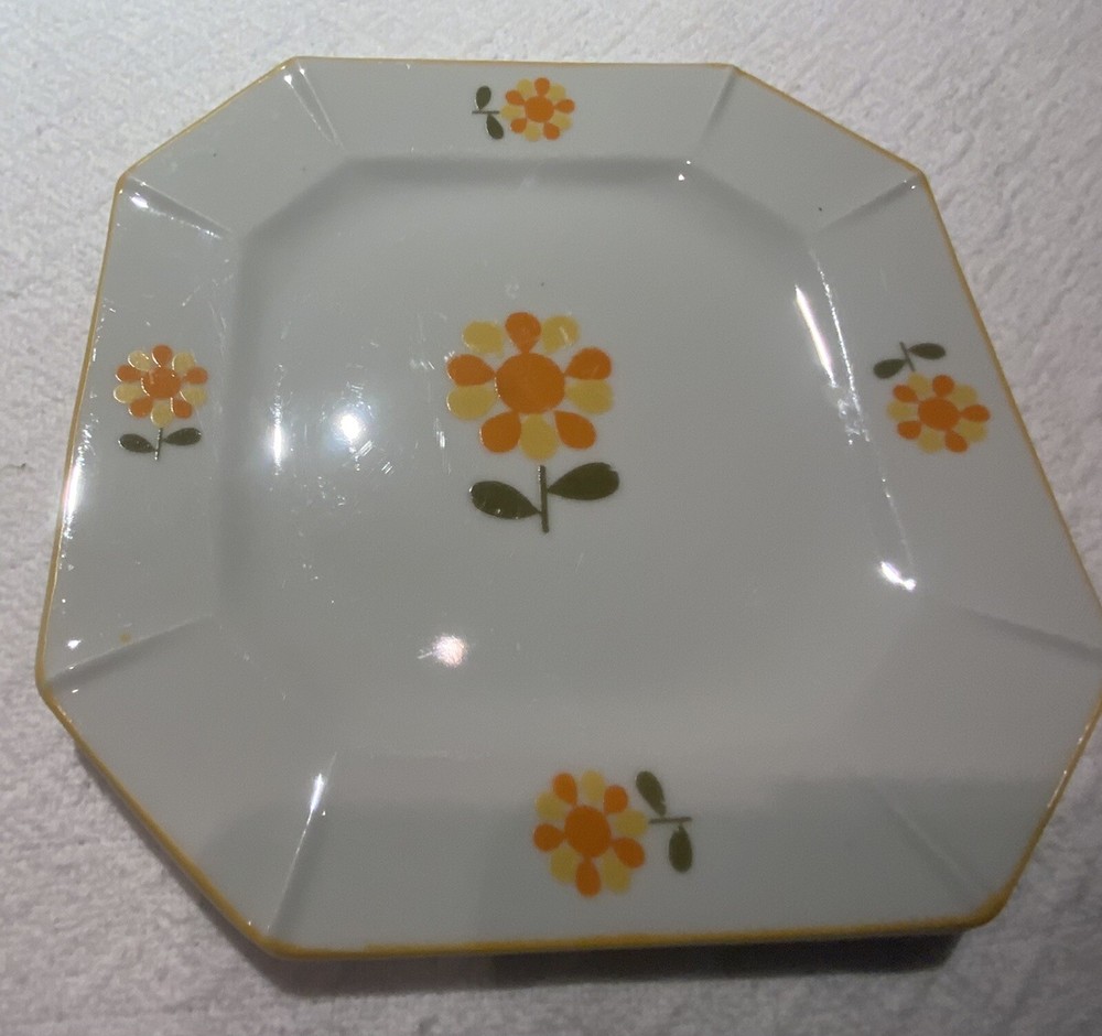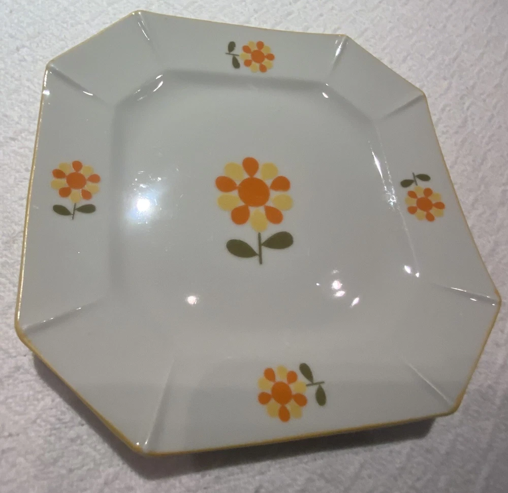 VINTAGE MID CENTURY DESSERT 7 1/4” ORANGE AND YELLOW DAISY PLATES SET 0F FOUR. * PIC 8 SHOWS CHIP ON BOTTOM RIM OF ONE OF THE PLATES. * PLATES ARE IN USED CONDITION AND AS SEEN IN PICS HAVE SOME MINOR WEAR ON TOP OF EACH PLATE. NO CRACKS OR CRAZING.