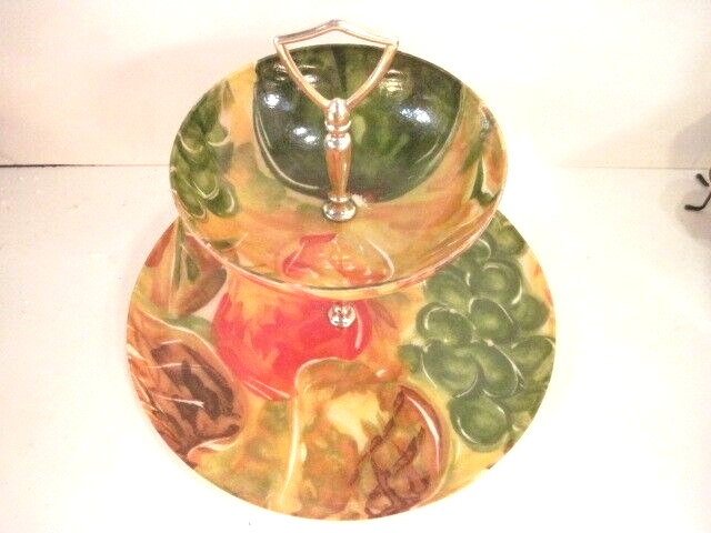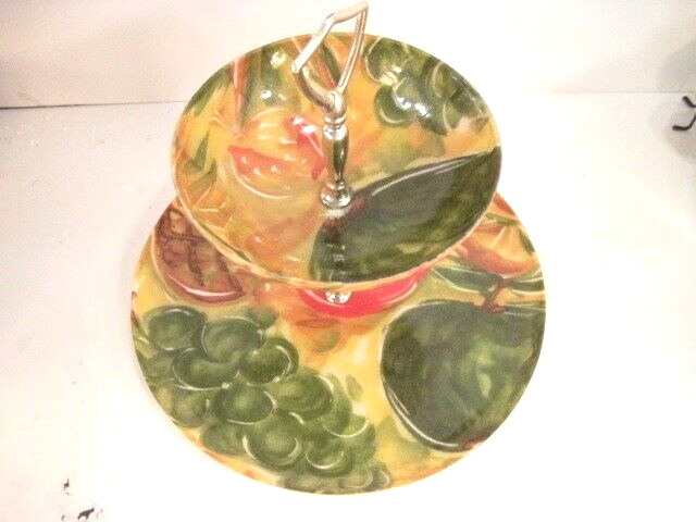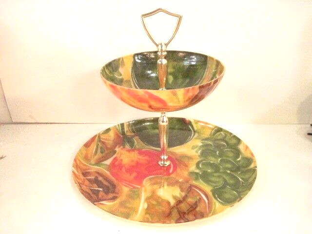 This vintage mid-century modern tid bit tray is a must-have for any collector! The tray features a beautiful abstract fruit pattern in orange, green, and gold colors, making it a perfect addition to any kitchen or home decor. The bottom plate measures 11" wide and the top bowl measures 6 1/2". The tray is made of durable fiberglass material and has a glossy finish that adds to its charm. It comes apart for easy storage. The tid bit tray is a two-level tray with a top bowl, making it perfect for serving fruits or other small items. Its chip-resistant feature ensures that it will last for years to come. This tray is perfect for anyone who loves unique and stylish collectibles. Please see the other items I have listed. I will be happy to combine items for shipping whenever possible to save on shipping costs. Please ask all questions well before auction end, and see all photos as they are part of the item description - sometimes they speak better than words. I am trying very hard to keep the cost of shipping down. Whenever I have them, I am using good, clean, used packing materials that family and friends collect for me. Nearly all of my items were found at estate sales, auctions, yard sales, etc., so I don't know their history - smoking, animals, etc. If I detect anything on any of my items I will mention it in the listing. Thanks for stopping by, and have a great day! PLEASE USE EBAY CHECKOUT. Payment is due within 3 days. Please ask all questions before bidding or buying - all sales are final. If you need this by a certain date, let me know, I will do my best to get it to you in time. Ebay will send you an invoice automatically. If you have bought more than one item, please request total from seller before you pay anything so I can send you a revised invoice with combined shipping. I USUALLY DO NOT SELL ON EBAY DURING THE WINTER MONTHS - MID DECEMBER UNTIL MAY. If you are seeing this listing, my store is still open. INTERNATIONAL BUYERS PLEASE NOTE - Import duties, taxes, and charges are not included in the item price or shipping cost. These charges are the buyers responsibility. Please check with your country's customs office to determine what these additional costs will be prior to bidding or buying.