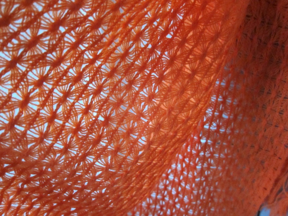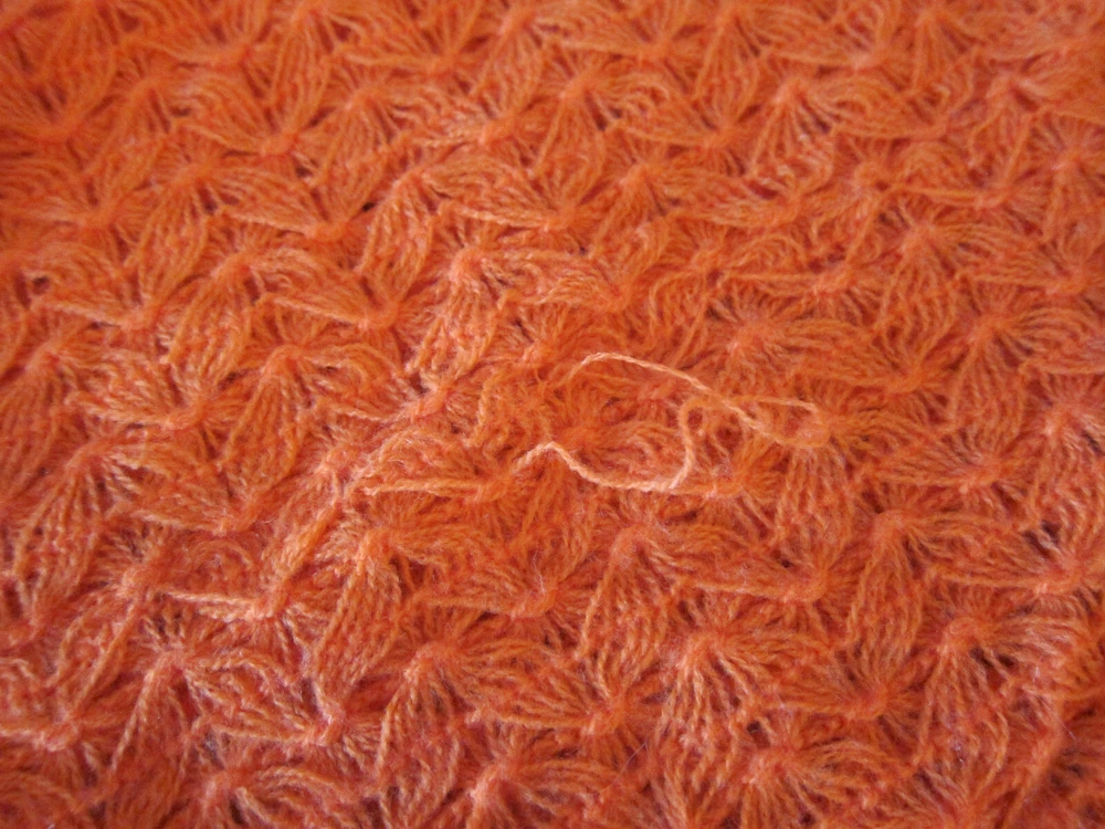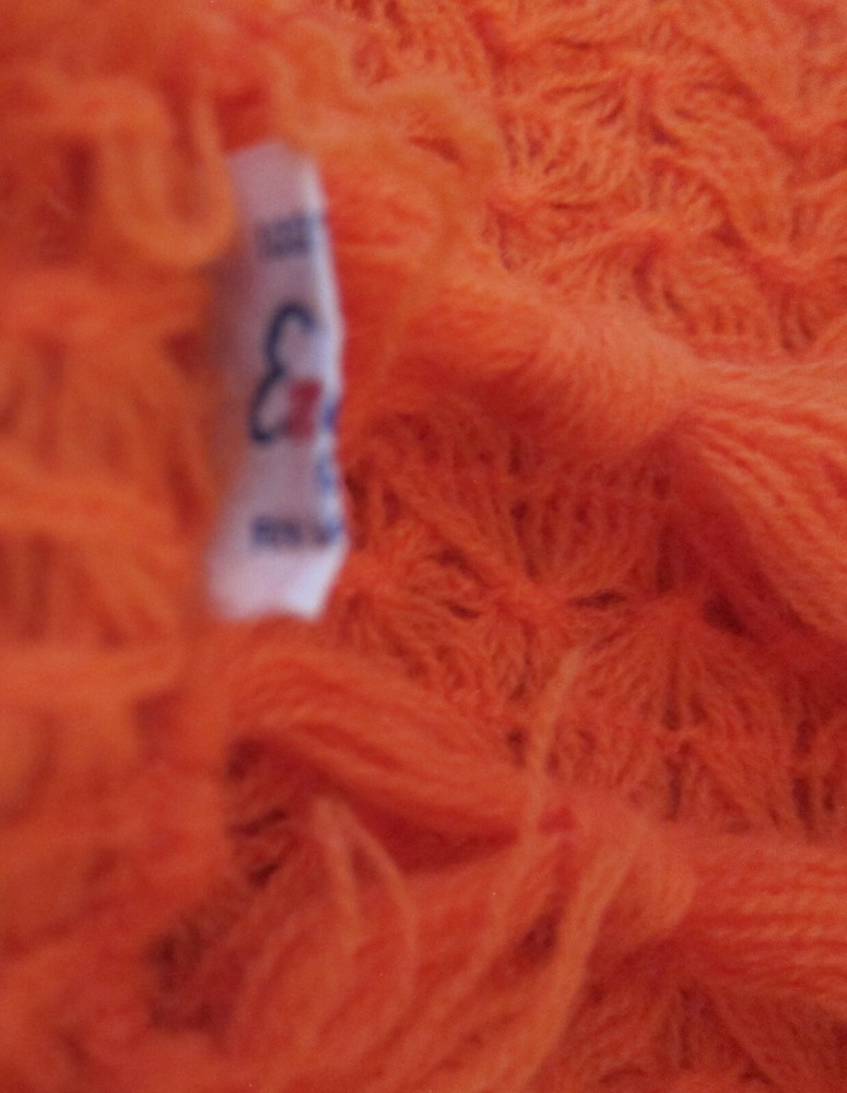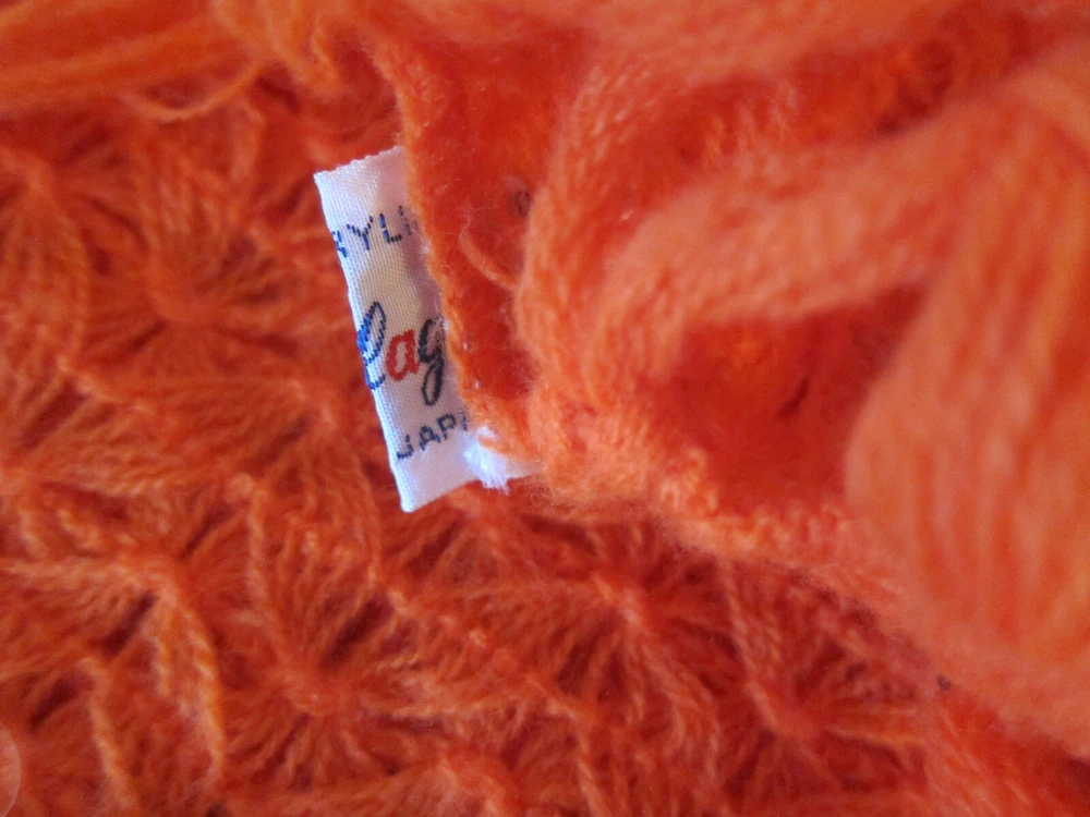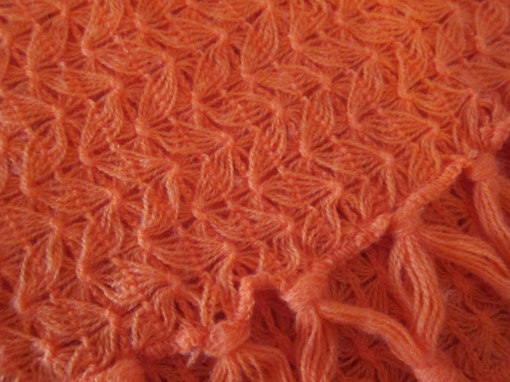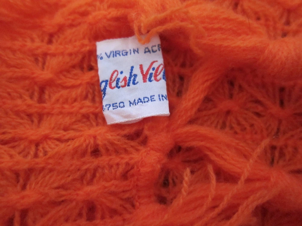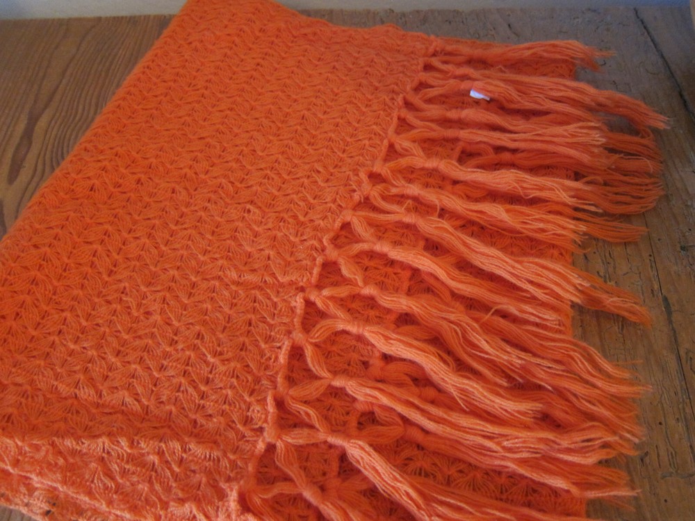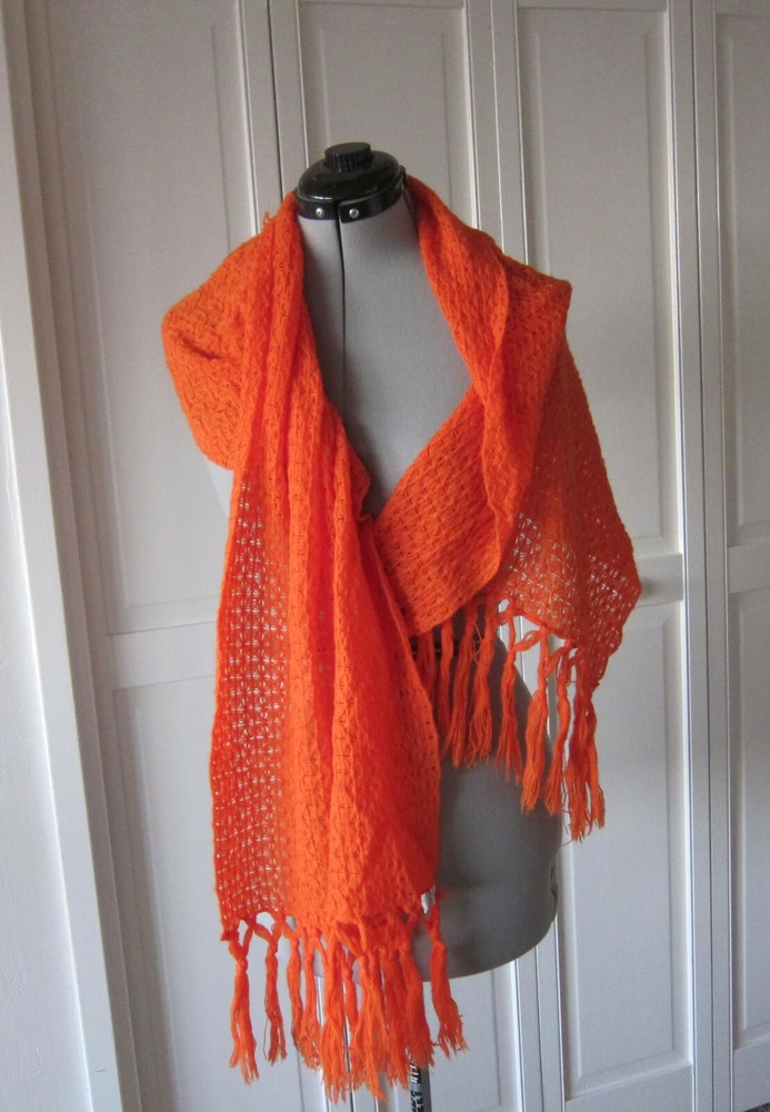 Large mid-century English Village acrylic knit scarf in burnt orange with long fringes and a very pretty stitch; light weight and soft; one snag, otherwise excellent condition; made in Japan. 19 in. x 64 in. (including fringe) International Buyers – Please Note: Import duties, taxes, and charges are not included in the item price or shipping cost. These charges are the buyer's responsibility. Please check with your country's customs office to determine what these additional costs will be prior to bidding or buying.