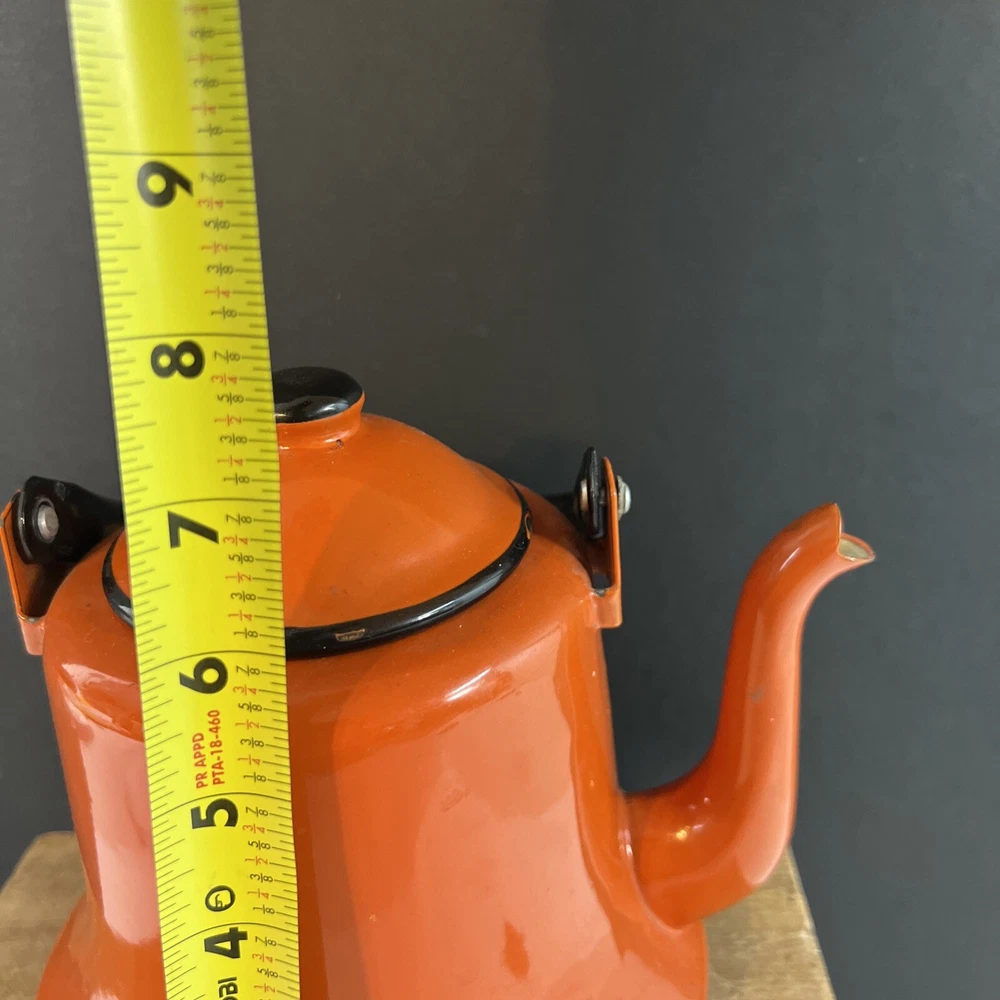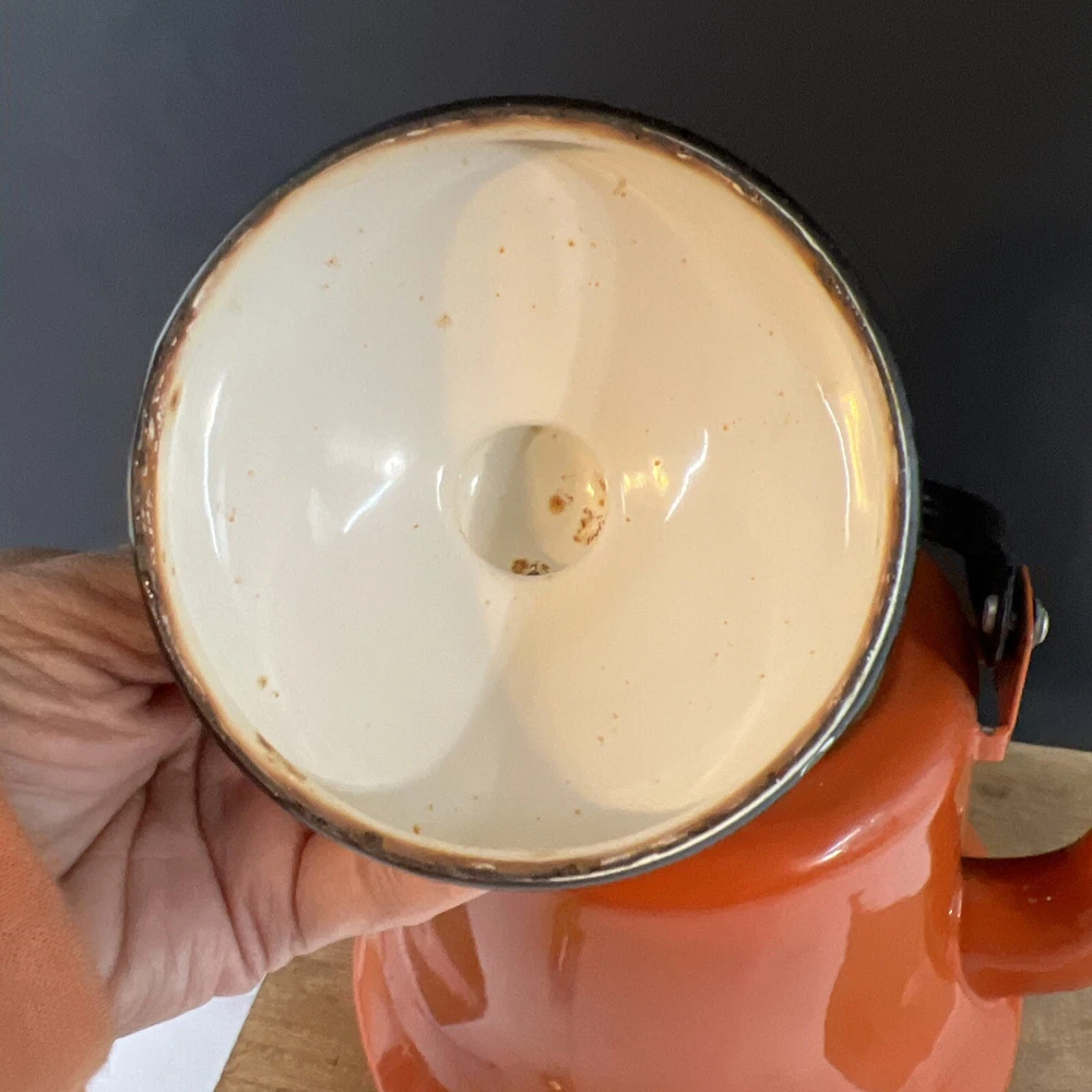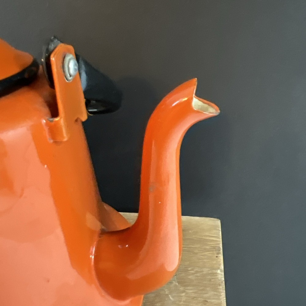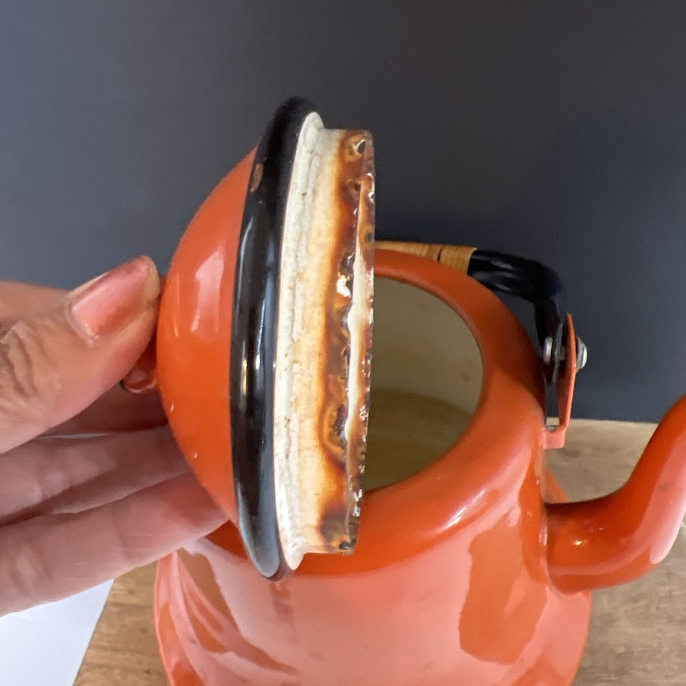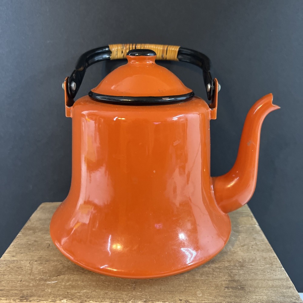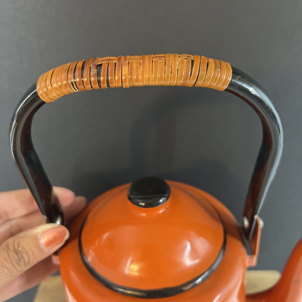 VINTAGE MID CENTURY OTTO BRIGHT ORANGE TEA KETTLE POT WITH HANDLE JAPAN. This does have wear inside the kettle as shown in the pictures.