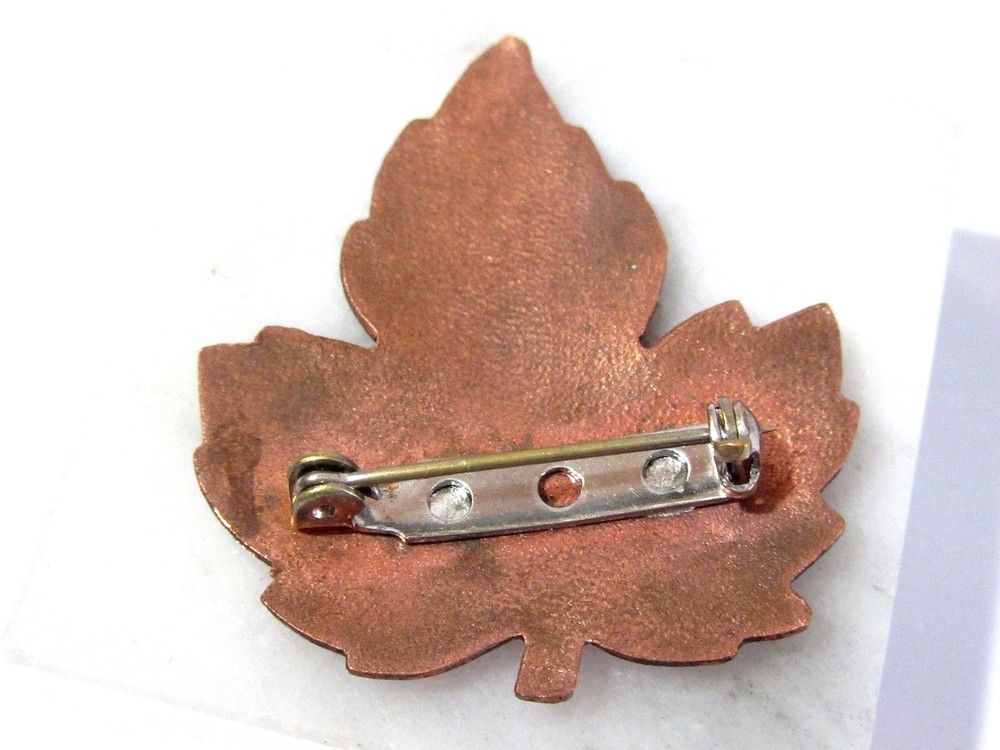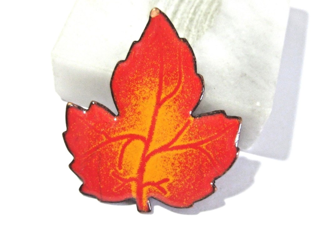 BRIGHT ORANGE/RED MAPLE COPPER ENAMEL LEAF PIN. MEASURES APPROX. 1 3/4" X 1 1/2" WIDE. GOOD CONDITION, LIGHT ENAMEL WEAR/LOSS, SEE TIP IS COPPER. AS SHOWN.