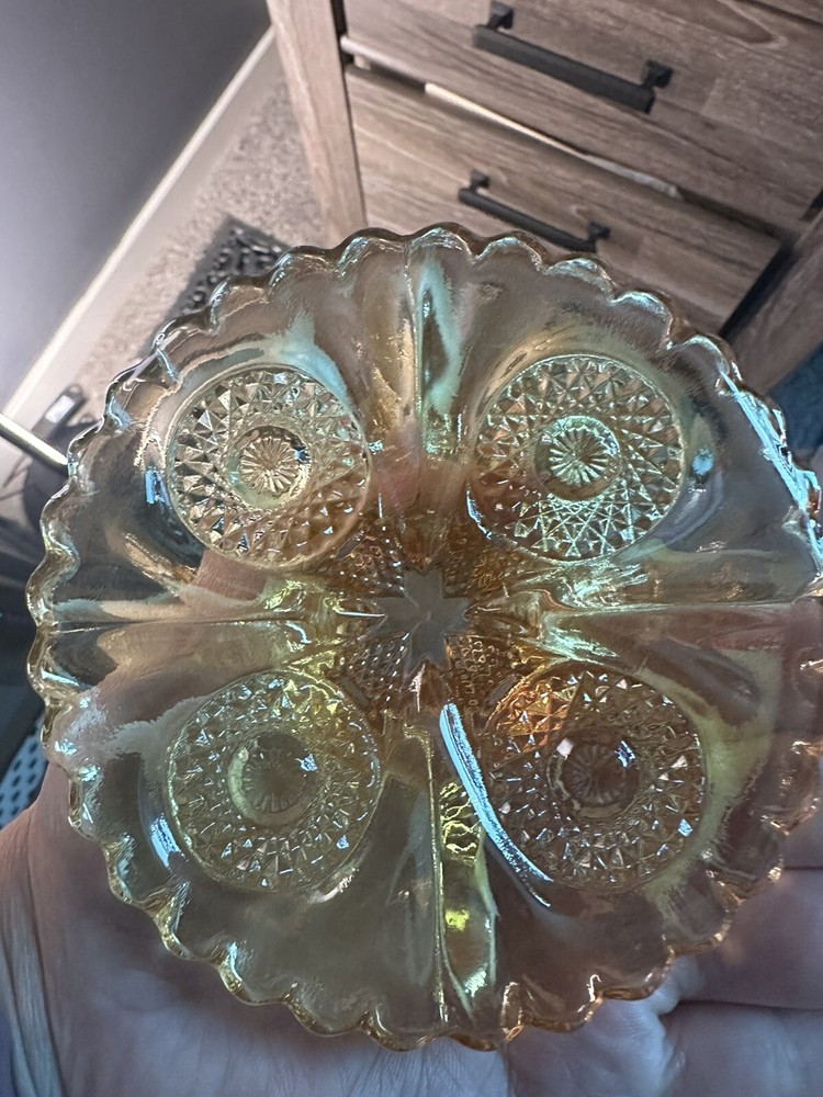 This stunning carnival glass compote is a true showstopper! The iridescent orange shifts to dazzling pinks and purples when light hits it, making it a mesmerizing display piece. The intricate sawtooth edges and elegant pedestal base add vintage charm, while the crisp Imperial "G over I" mark confirms its authenticity. Perfectly preserved and heavier than expected, it feels substantial and high-quality. A must-have for collectors or anyone who loves unique, eye-catching decor!