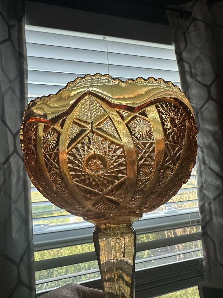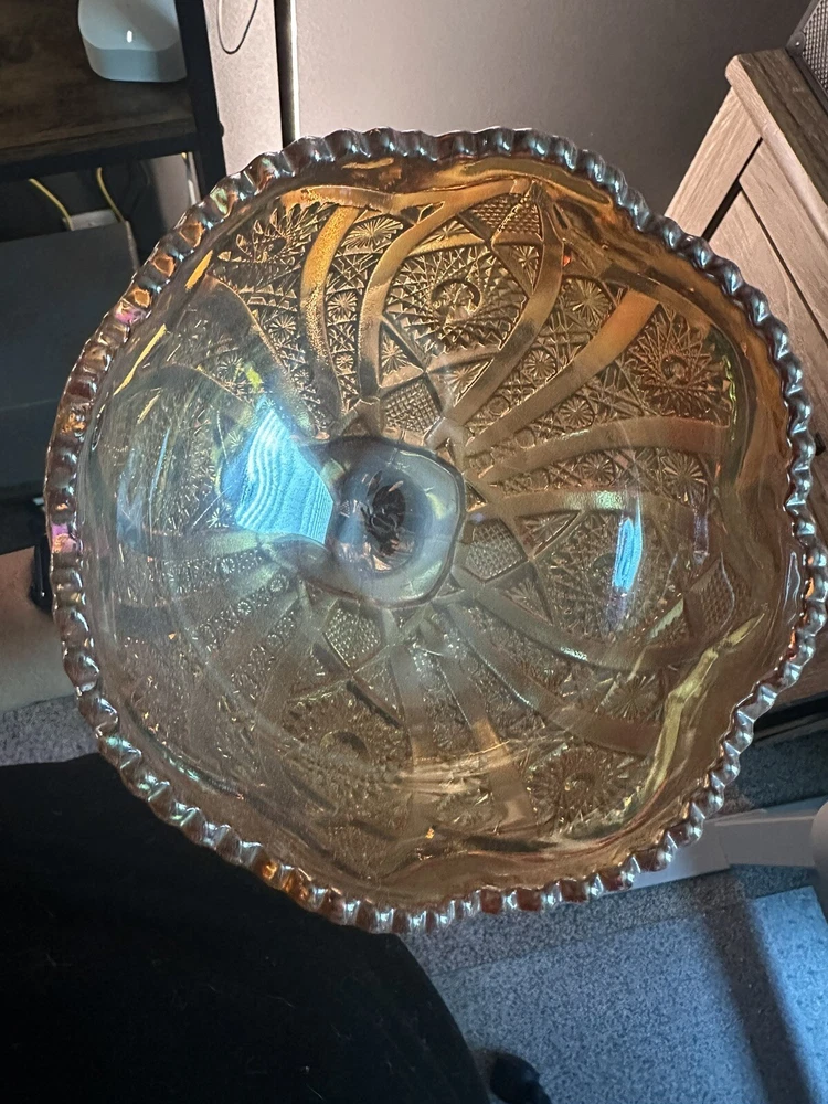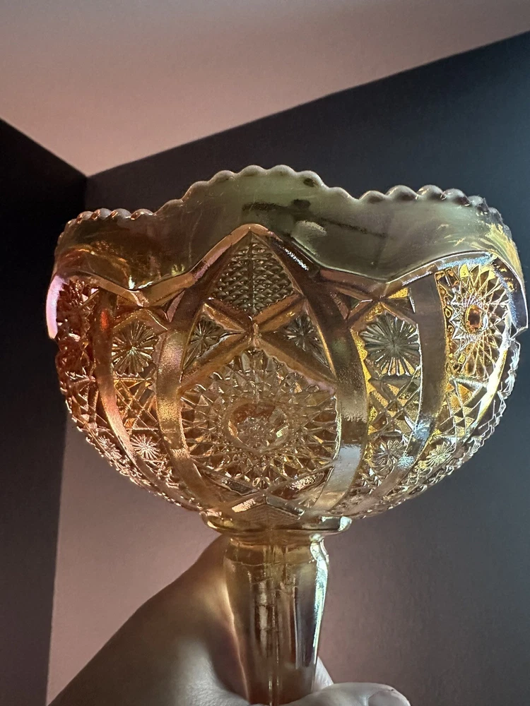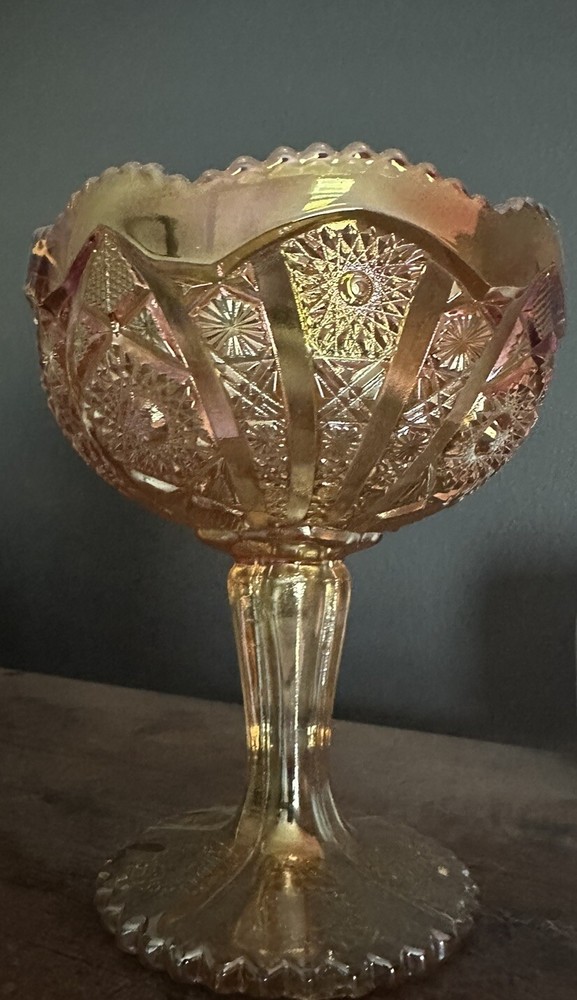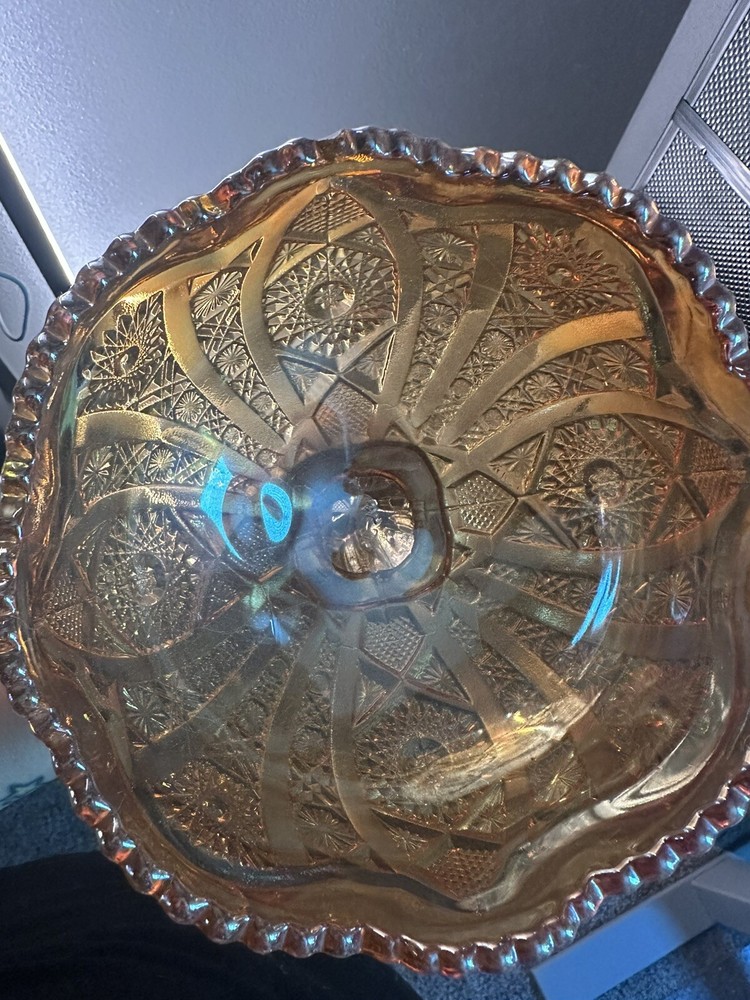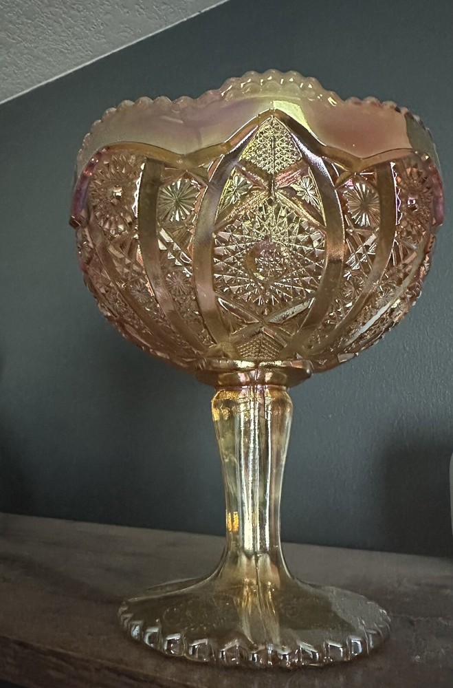 Imperial Iridescent Orange Carnival Glass on Pedestal Compote with Saw Tooth Edges. When the light catches the glass, pinks and purples shine through beautifully! This collectible is in Perfect condition and has been untouched and stored in a protective hutch. This glass bowl has the iconic mark of the capital "G" superimposed over a stylized letter "Iā stamped in the bottom of the bowl. Measuring: Stands 7.75" Tall 6.75" in diameter of the bowl 4.25" diameter of base 2lbs