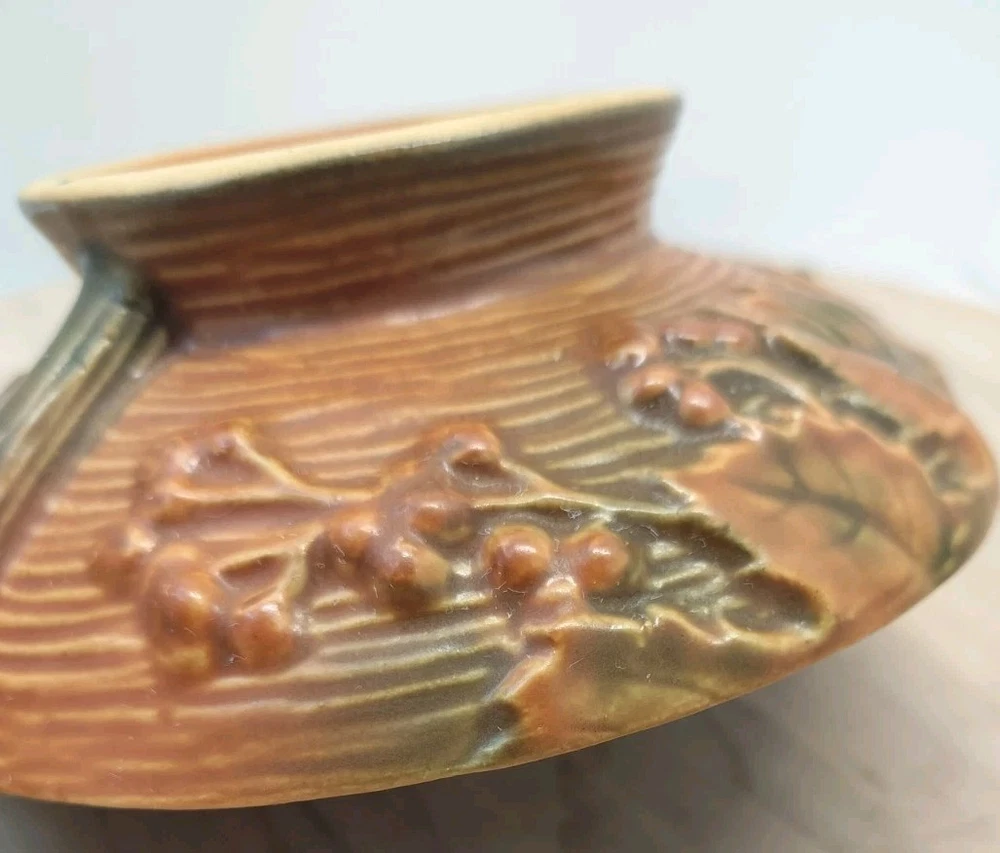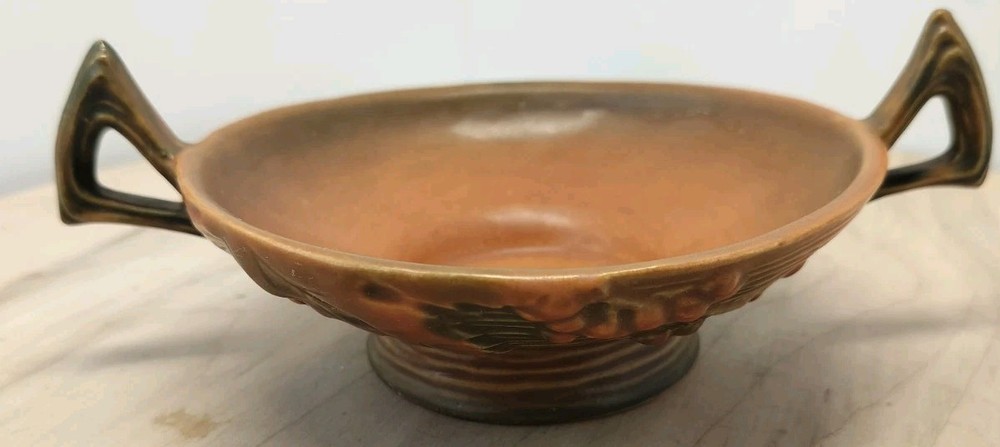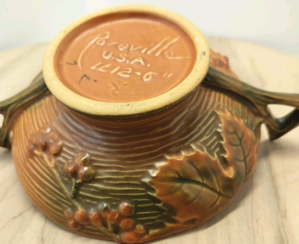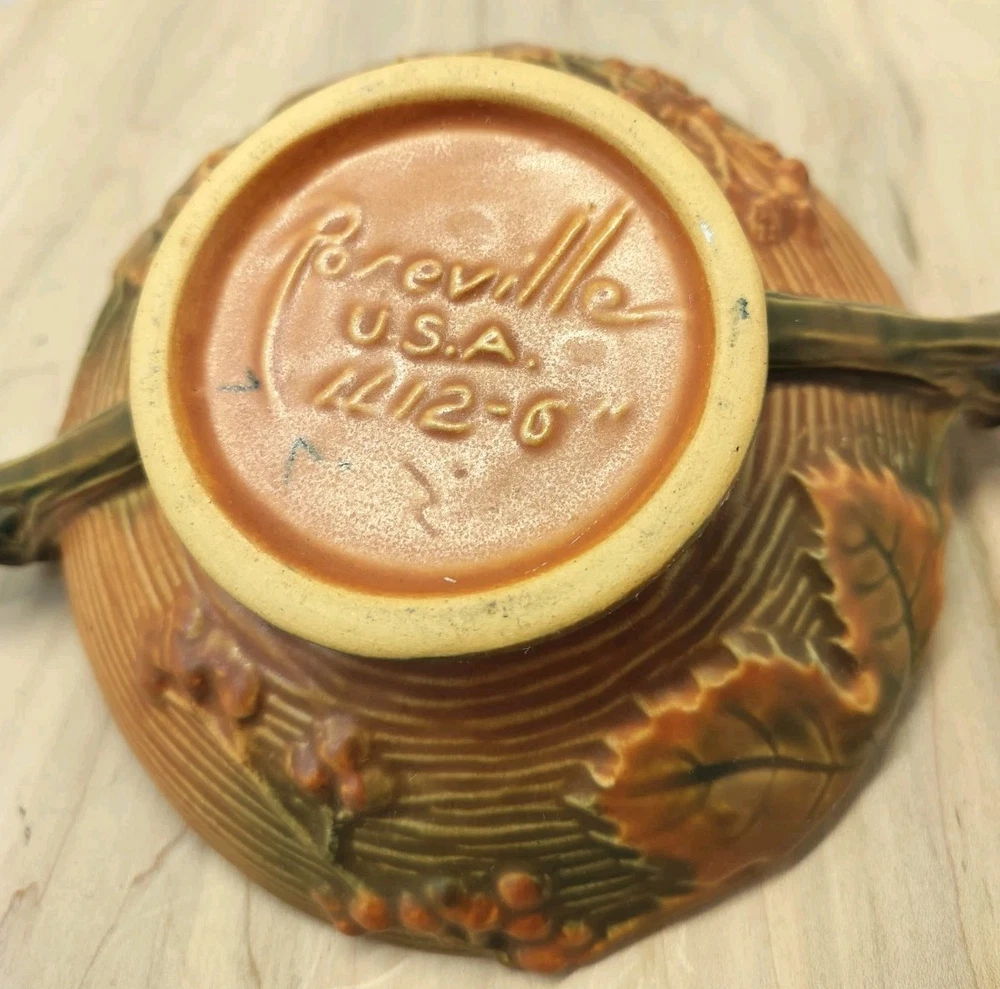 VINTAGE 1941 BUSHBERRY RUSSET HANDLED BOWL ROSEVILLE POTTERY U.S.A. TWIG LOOKING HANDLES BROWNS GREEN & ORANGE HUES 6.25" DIAMETER X 2" TALL NO CHIPS CRACKS OR REPAIRS PLEASE SEE PHOTOS FOR MORE DETAILS. PLEASE SEE MY OTHER LISTINGS AS I LIST MORE VINTAGE ITEMS DAILY . HAVE A WONDERFUL DAY. #5790 6/25 bxshf