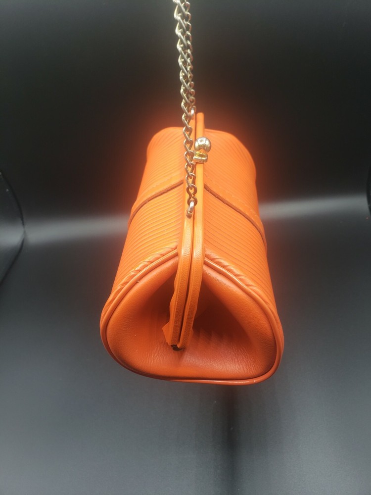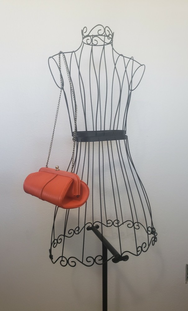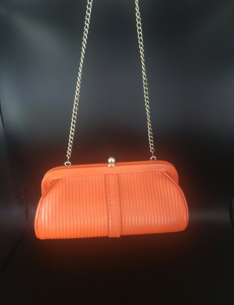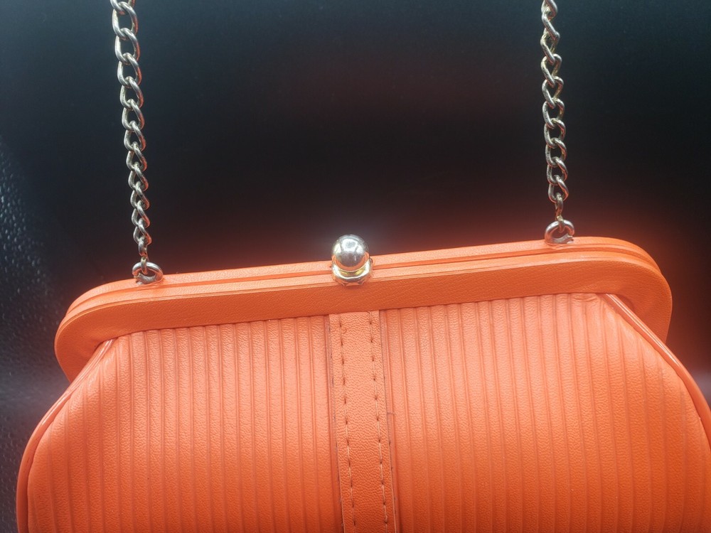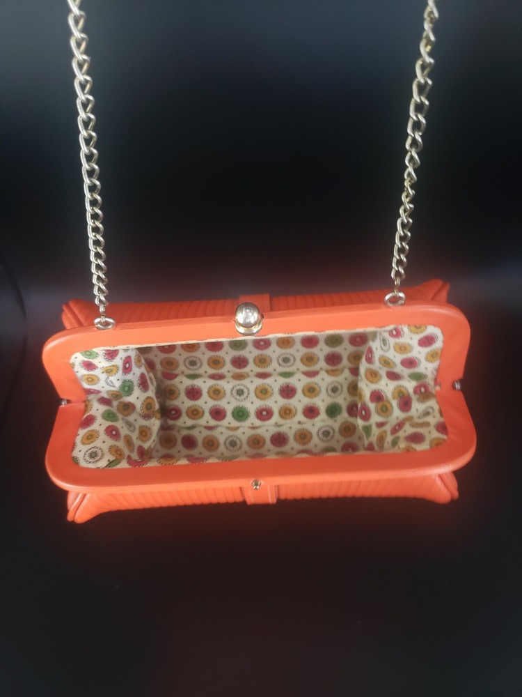 A Rare Find VTG 1960's Retro Orange Mid Century Small Purse What a rare find this is a VTG 1960's Retro orange mid century purse and have not seen anything close to this style as of yet. Gold hardware Measures: 8" long x 4" wide 3 1/2" deep Chain 14" long Inside print is a mid century colorful flower type print Pre-owned and in good condition Please let me know if you have any questions.