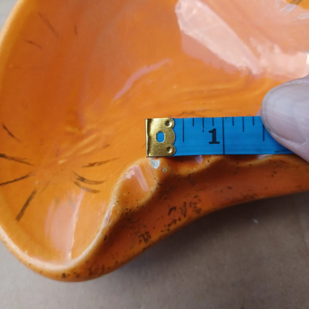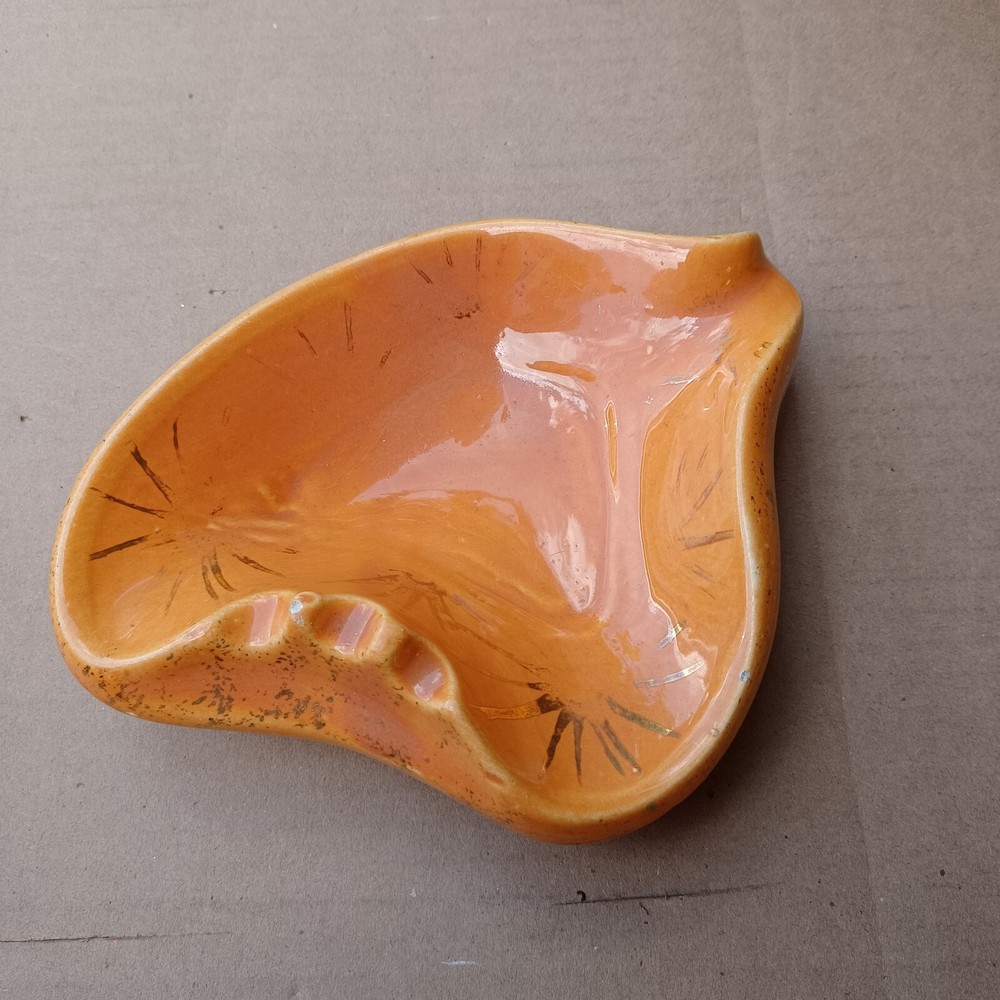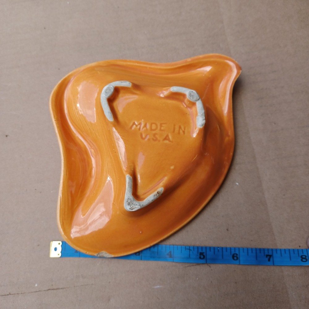 This vintage cigarette ashtray is a unique piece that dates back to the 1970s. Its odd shape and vibrant orange and gold colors make it a great addition to any mid century modern collection. Measuring at 6.5 inches, this ashtray is perfect for use or display. Its authenticity as a United States product adds to its value as a collectible item.