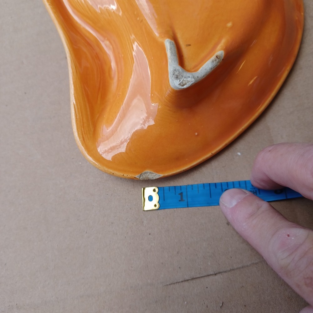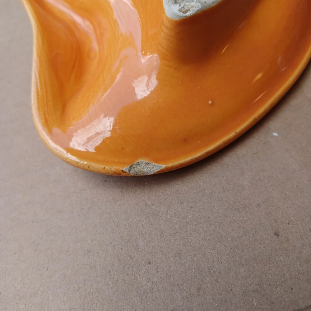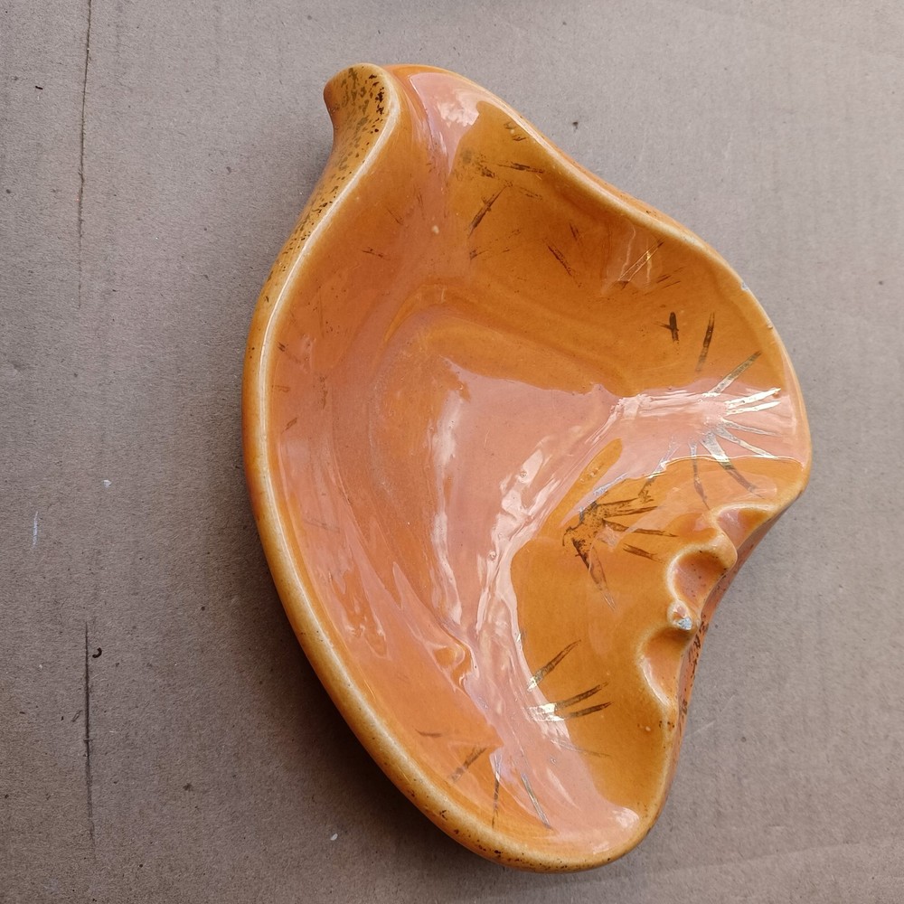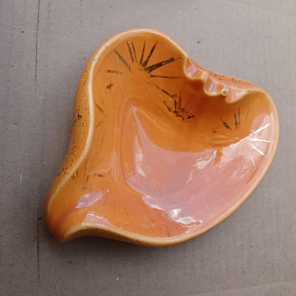 This vintage cigarette ashtray is a unique piece that dates back to the 1970s. Its odd shape and vibrant orange and gold colors make it a great addition to any mid century modern collection. Measuring at 6.5 inches, this ashtray is perfect for use or display. Its authenticity as a United States product adds to its value as a collectible item.