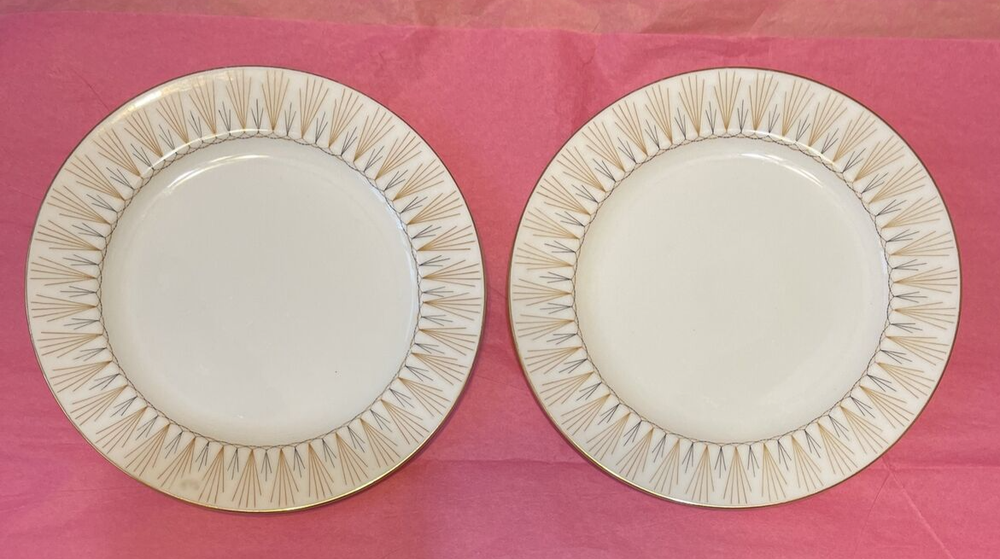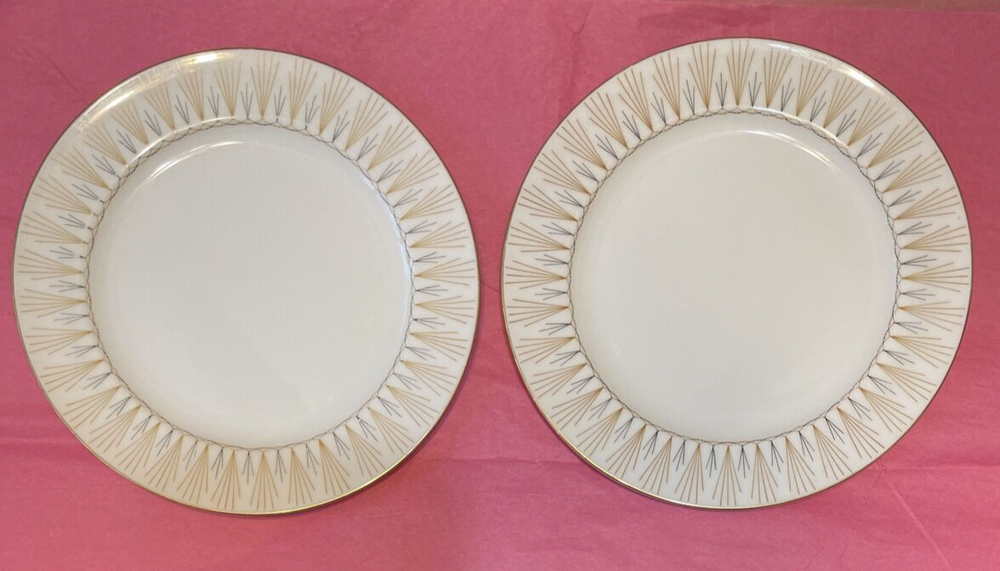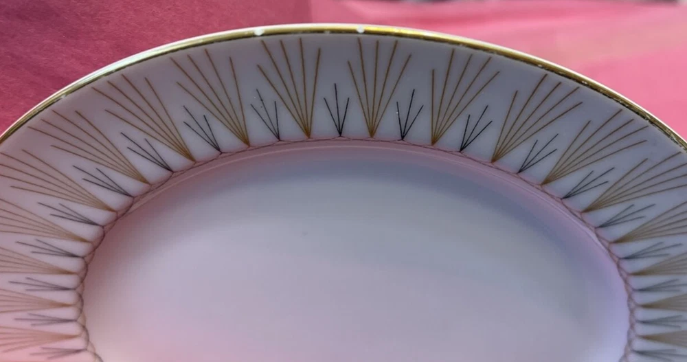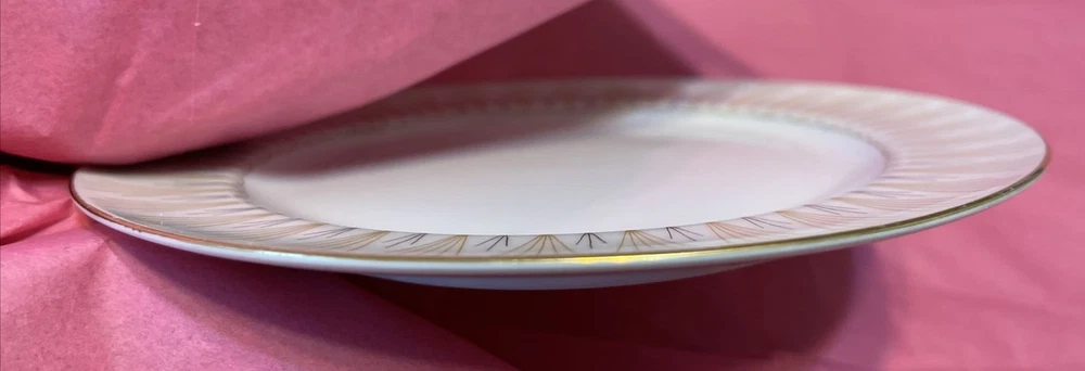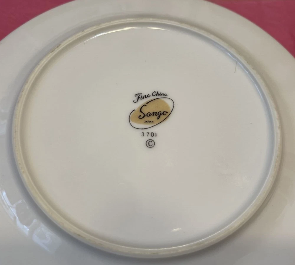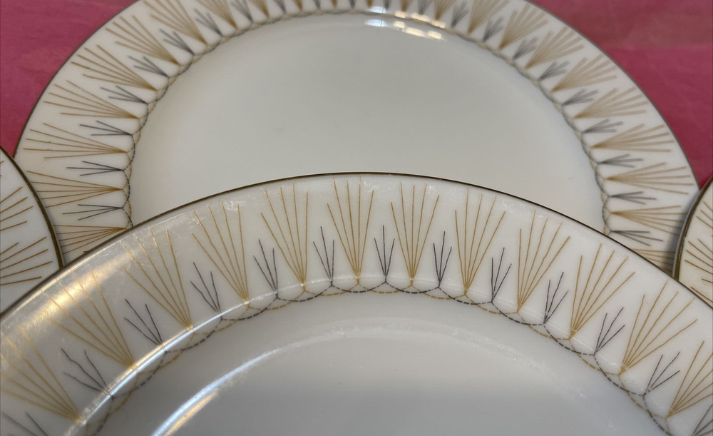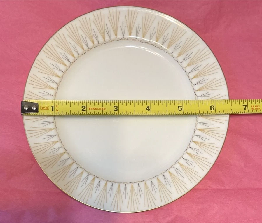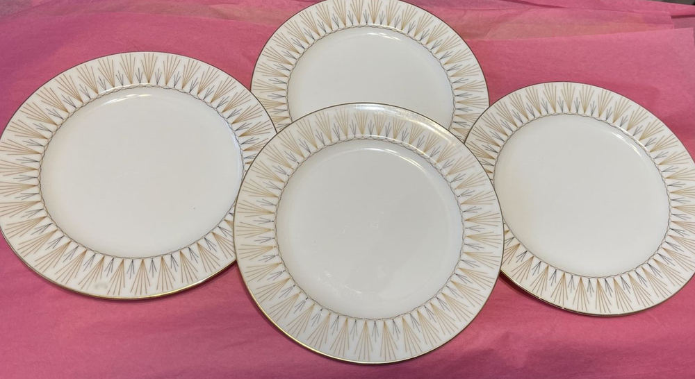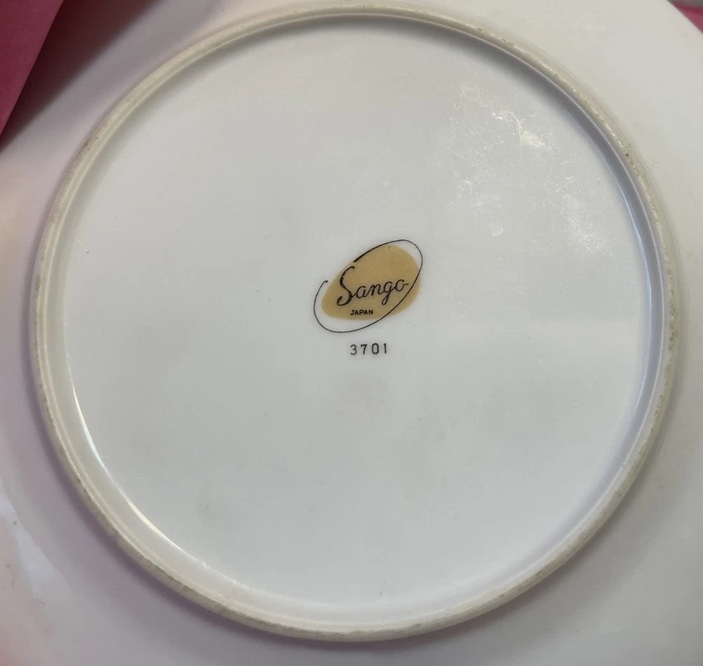 Presented, a set of four, true vintage (1950-1960's), Mid Century Modern , Sango Brand , pattern #3701, made in Japan, pre-owned, used, small dessert (6 1/2" diameter) fine china plates, as pictured. They are from my mother's estate. The color on the MCM "abstract fan" pattern is black and a gold tone or almost amber/light brown color, please refer to the listing pics for true color. They have some use/storage wear, see listing pics for examples of three very tiny chips on the rim of one of the plates, wear to the gold tone rim, possible light graphic wear, scuffing on the bottom rim and other general wear. Overall, I would say they are all in good used, vintage condition without any stains or cracks that I see. Please note , I noticed that the trademarks on the backs are not the same on all of the plates (see pics, one doesn't say "Fine China etc.). They may have other concerns that I overlooked . Please view the listing pics closely for condition and details. Feel free to ask questions. Thank you for viewing! ~Stop by my eBay shop!~