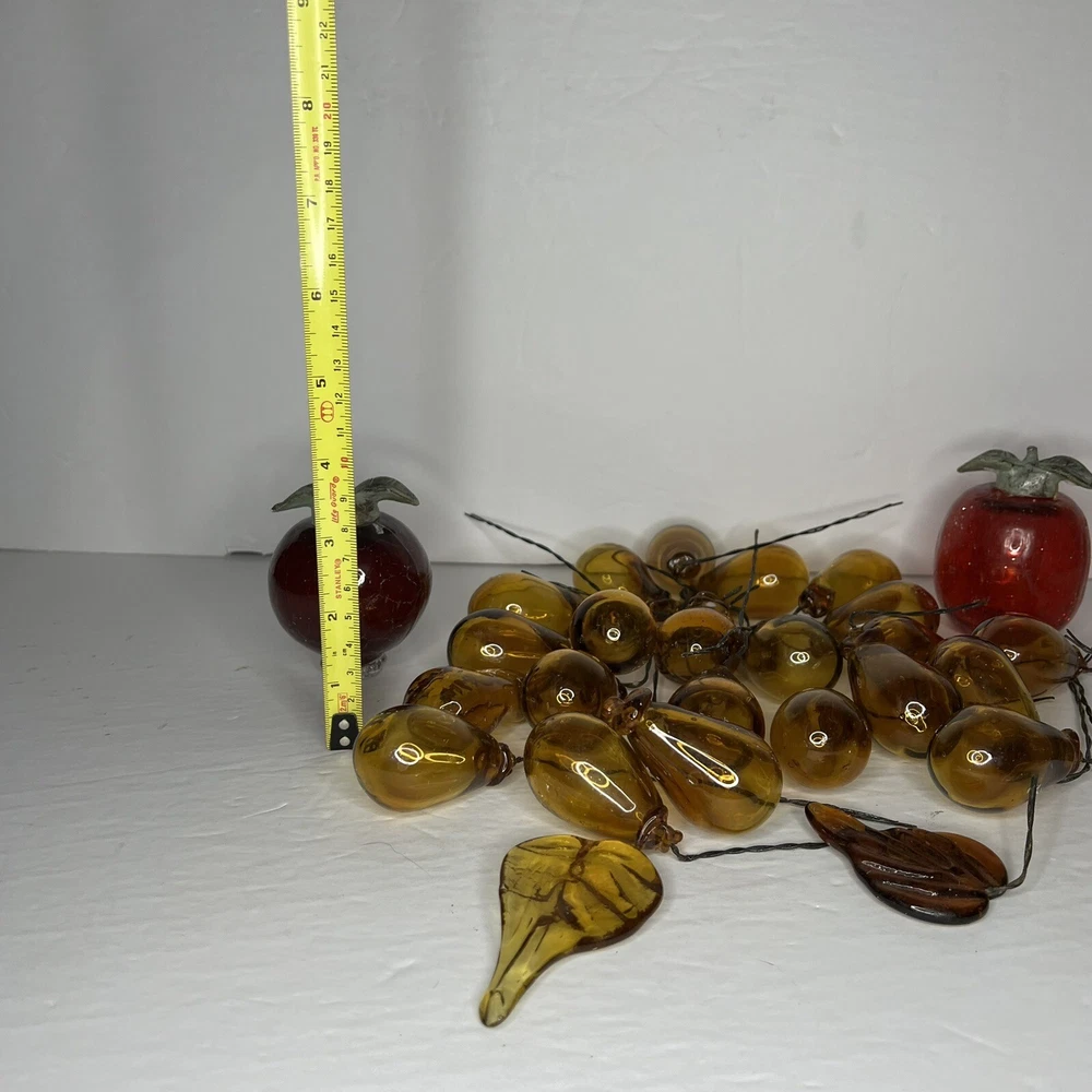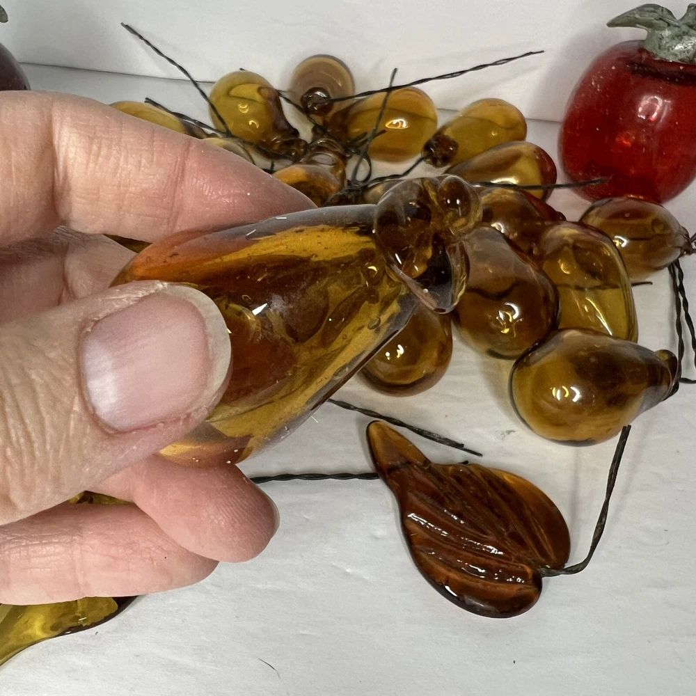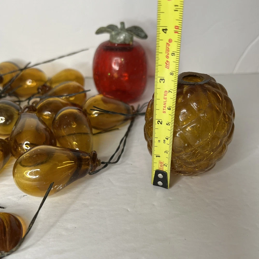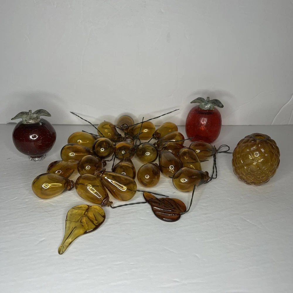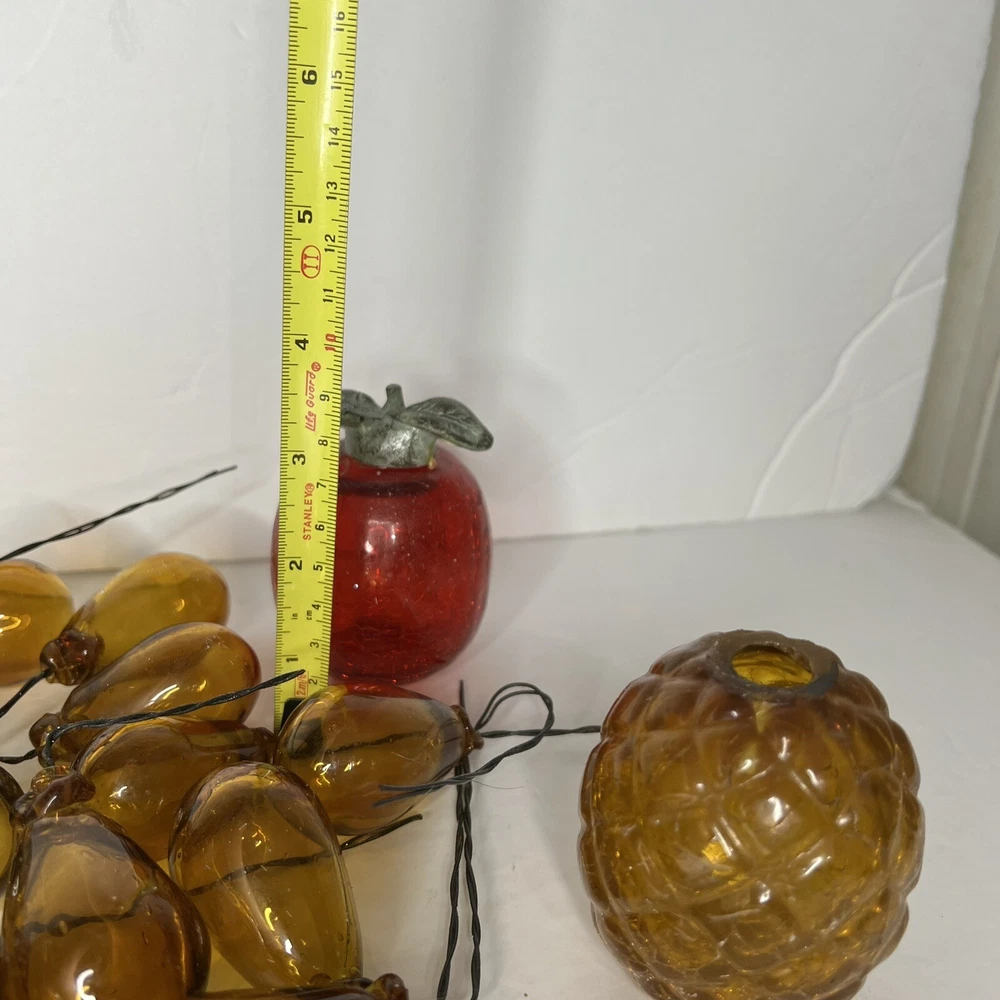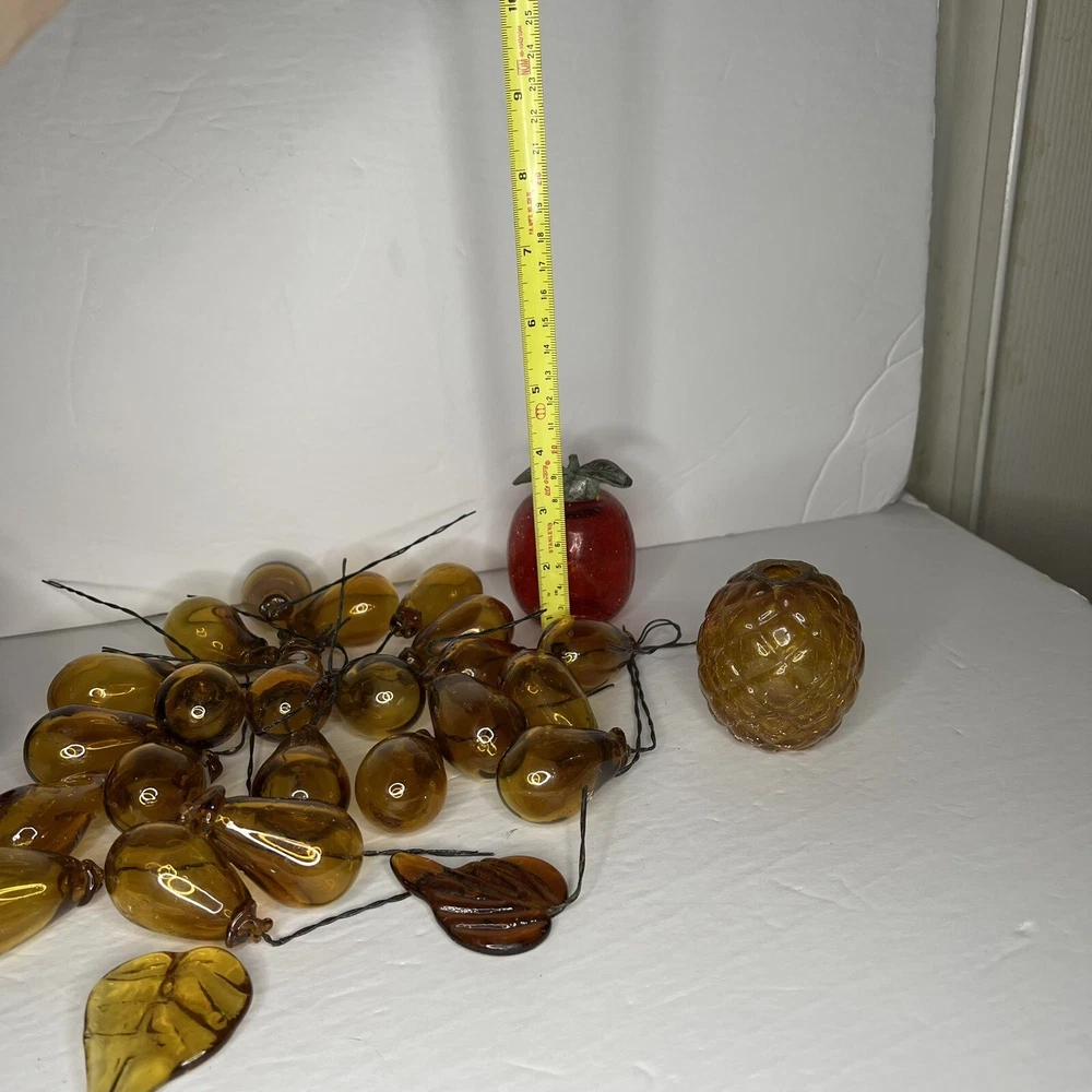 VTG Amber & Crackle Glass Fruit (READ BELOW) Mid-Century Modern Arts Craft Decor. Please read carefully - the pineapple top has broken off as pictured. the grapes have been unwound due to the degradation of the tape used to originally bind, but most till have their metal rods so you can use as you wish or re-twist to make your own bunch of grapes. the larger fruit pieces are a crackle glass and the smaller grapes and leaves seem to be a smoother glass finish. please note a few pieces of the grapes and leave need new wire if you want to add them to a grape vine. will be a great project for your home decor or to make into other crafts projects. see photos for condition and approximate measurements.