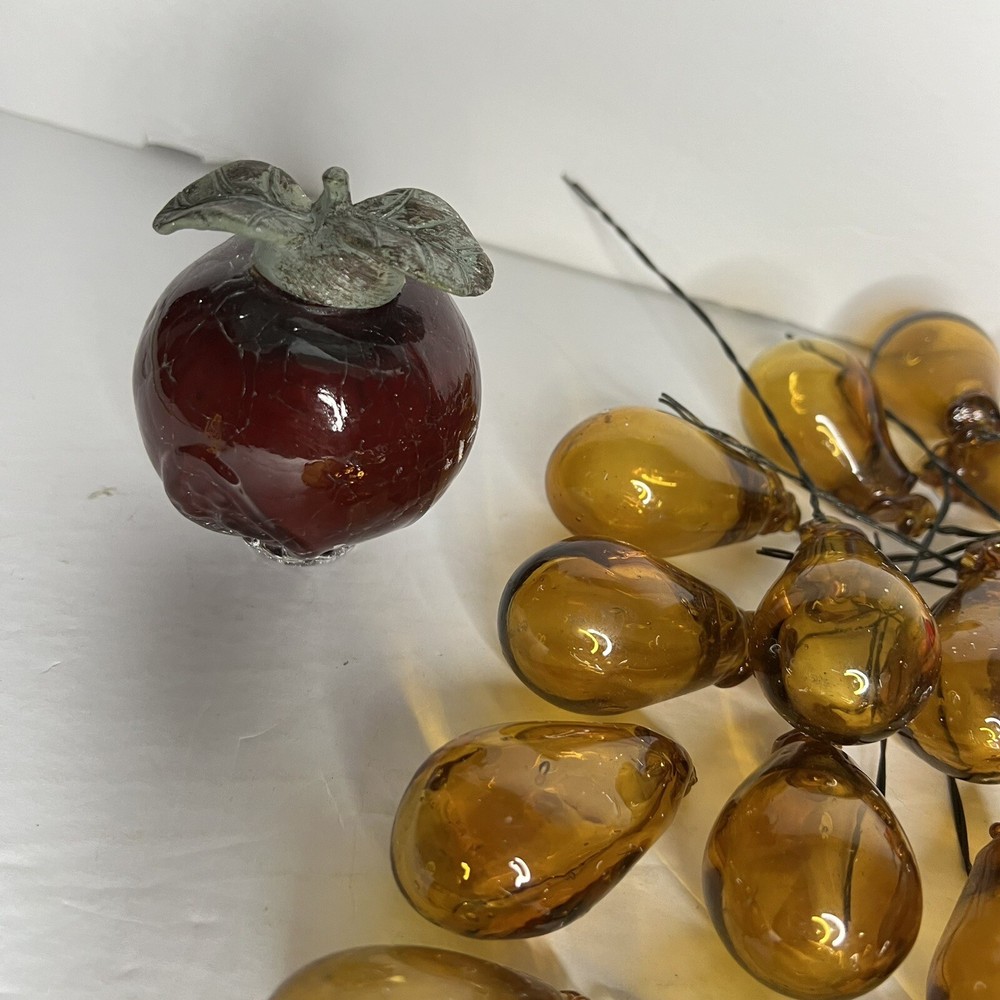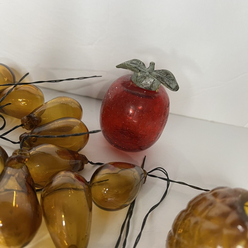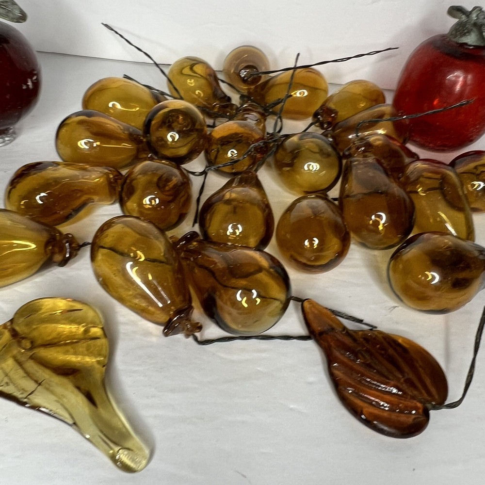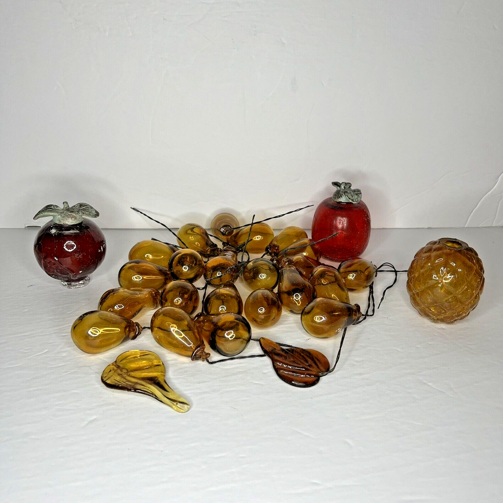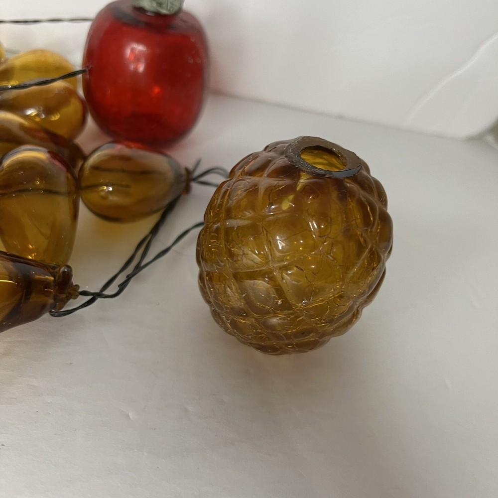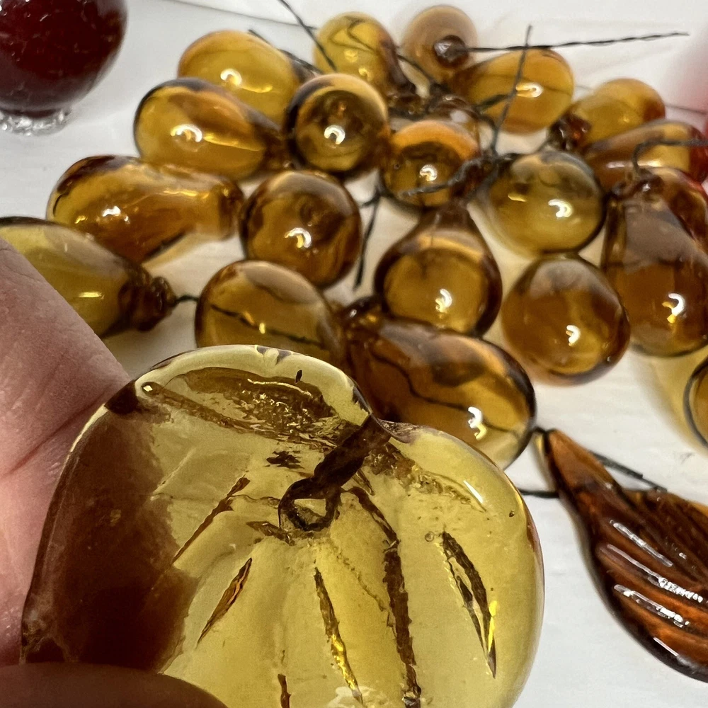 VTG Amber & Crackle Glass Fruit (READ BELOW) Mid-Century Modern Arts Craft Decor. Please read carefully - the pineapple top has broken off as pictured. the grapes have been unwound due to the degradation of the tape used to originally bind, but most till have their metal rods so you can use as you wish or re-twist to make your own bunch of grapes. the larger fruit pieces are a crackle glass and the smaller grapes and leaves seem to be a smoother glass finish. please note a few pieces of the grapes and leave need new wire if you want to add them to a grape vine. will be a great project for your home decor or to make into other crafts projects. see photos for condition and approximate measurements.