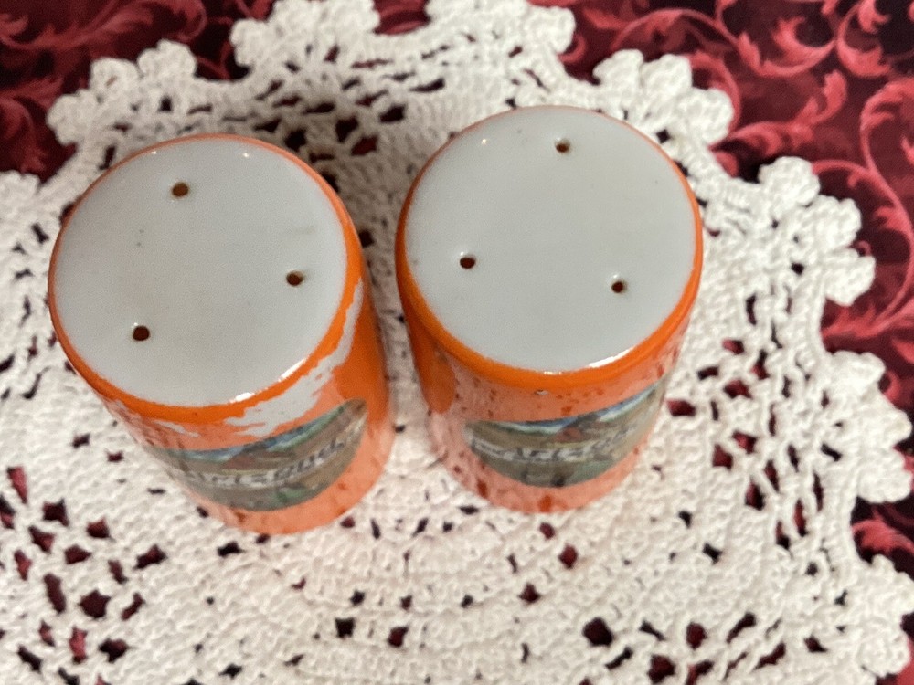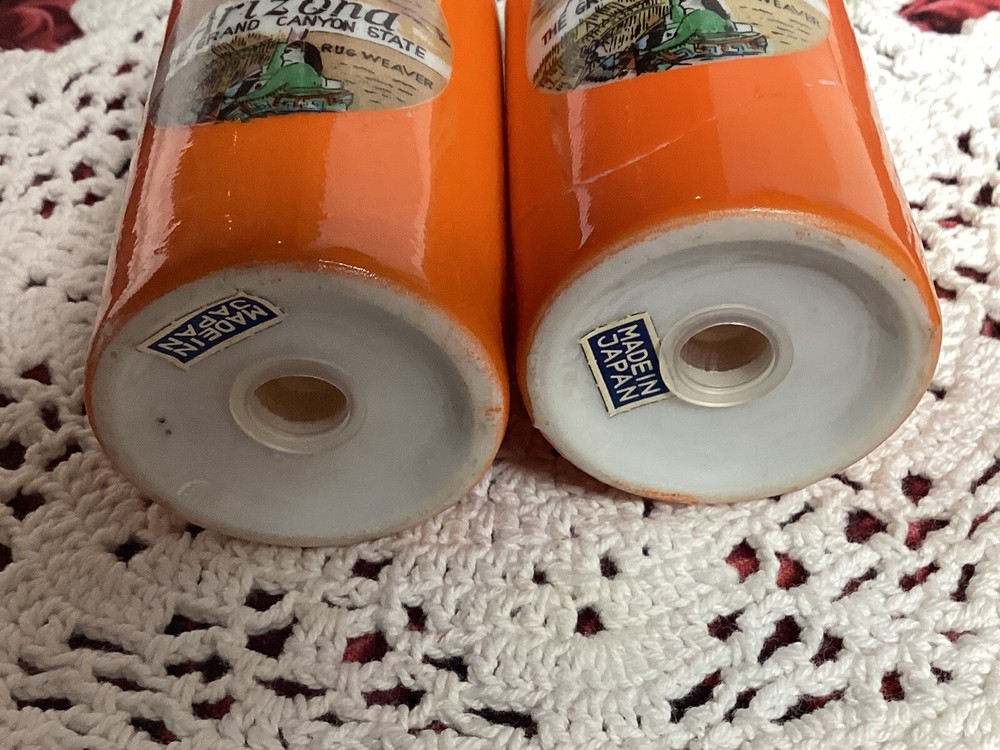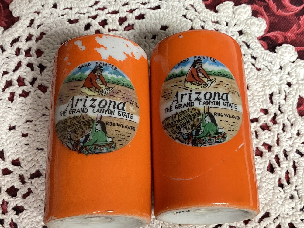 Souvenirs of Arizona both shakers have made in Japan paper sticker on bottom. Approximately 3” tall, orange paint is missing from areas as seen in pictures, decal pictures are great. Graphics say Rug Weaver & Sand Painter. Both have stoppers. Also says The Grand Canyon State.