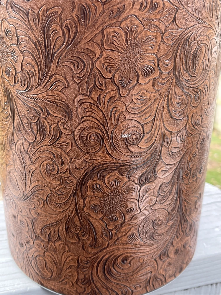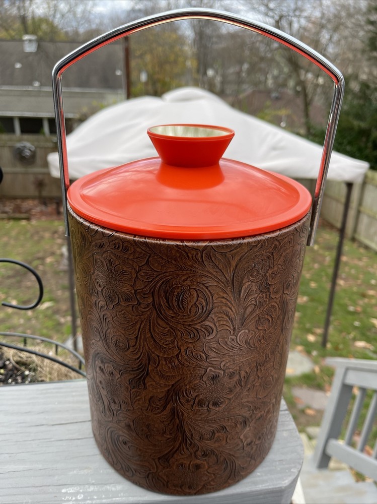 VTG BROWN TOOLED EMBOSSED LEATHER ICE BUCKET/ORANGE TOP MID CENTURY BARWARE....