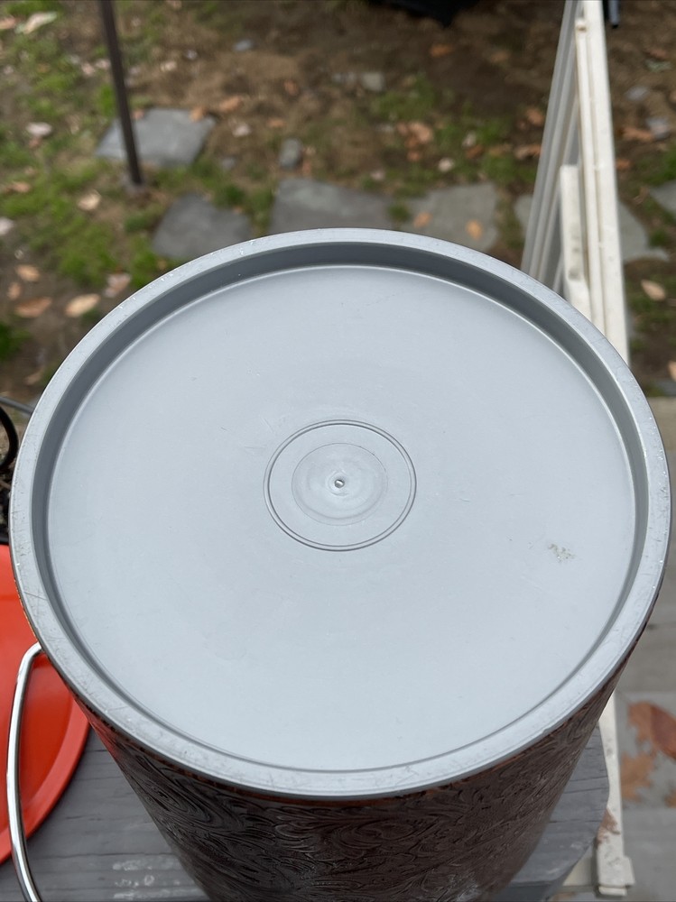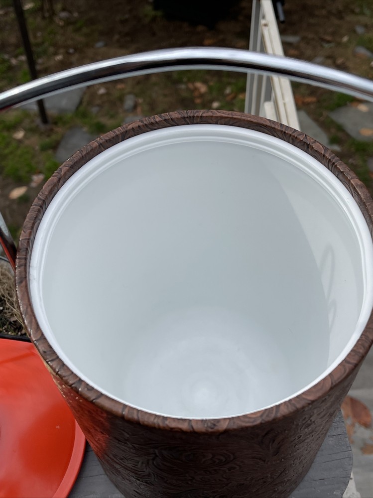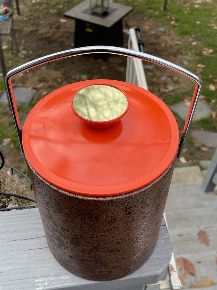 VTG BROWN TOOLED EMBOSSED LEATHER ICE BUCKET/ORANGE TOP MID CENTURY BARWARE.