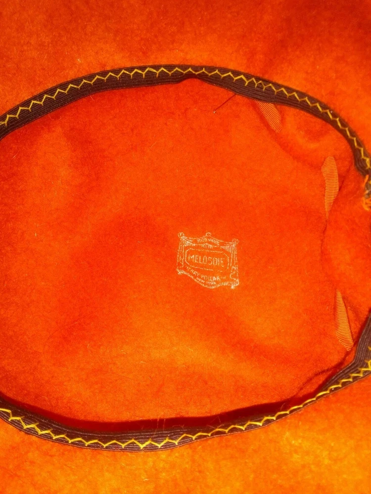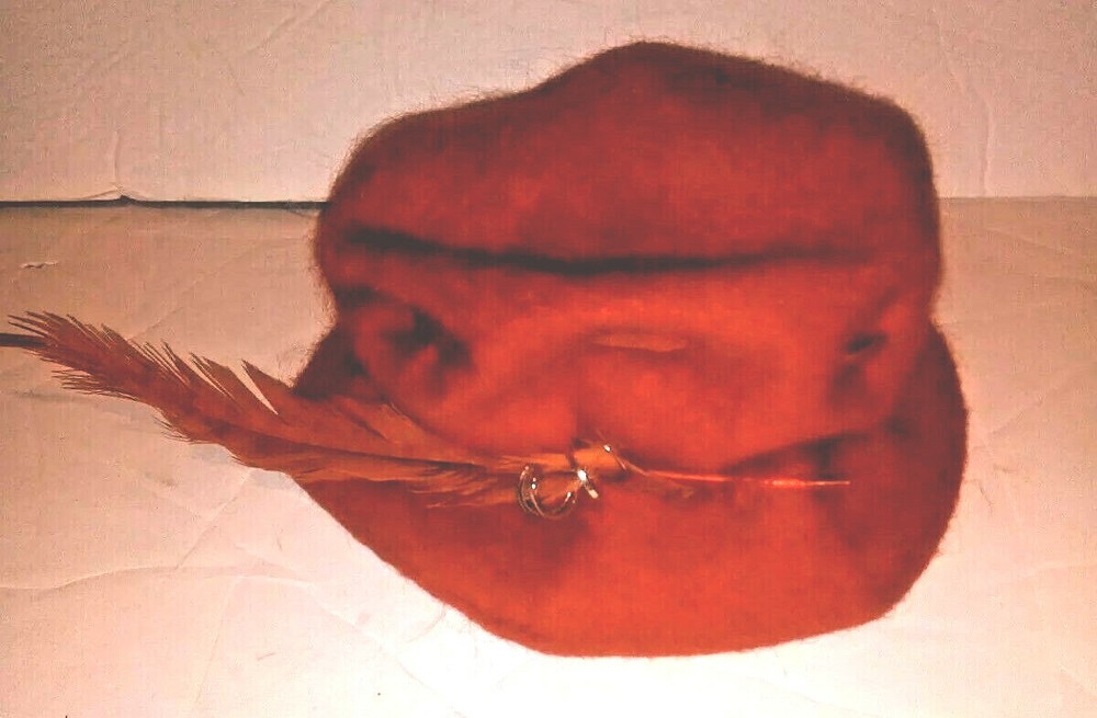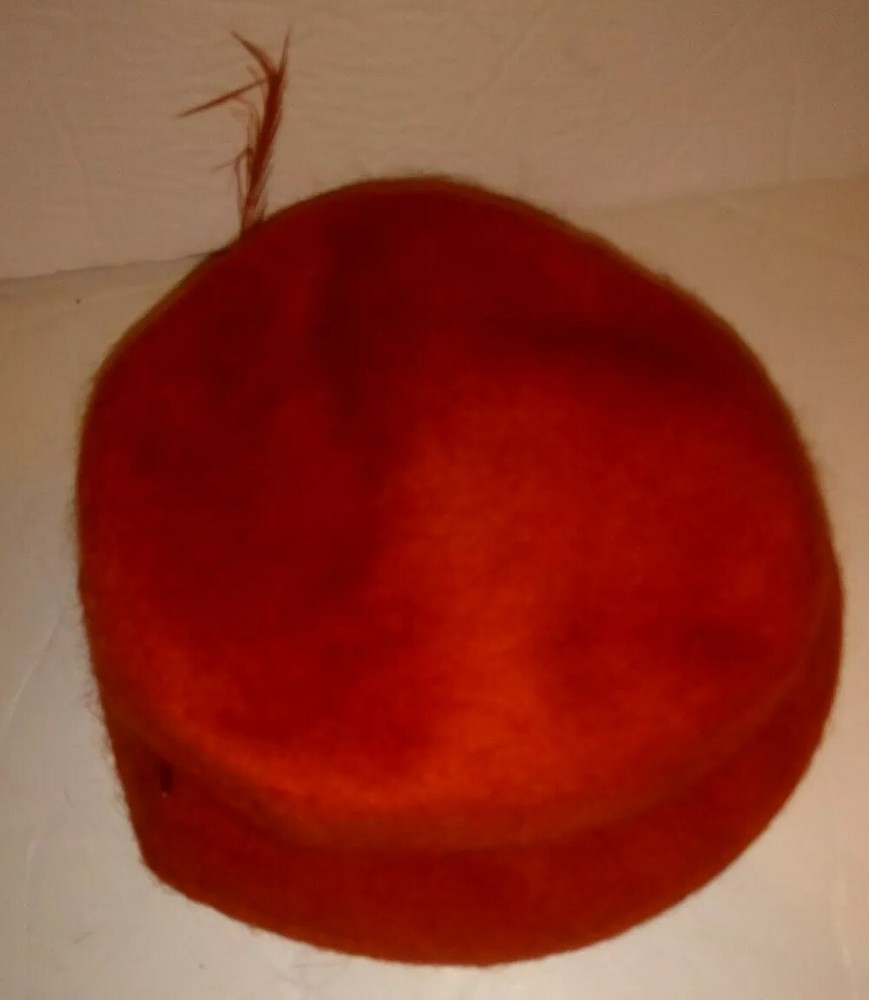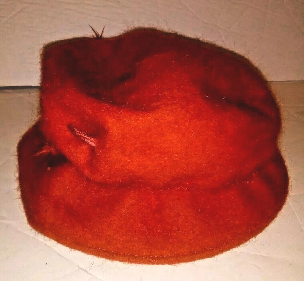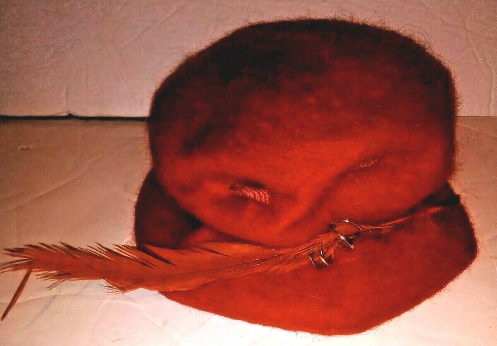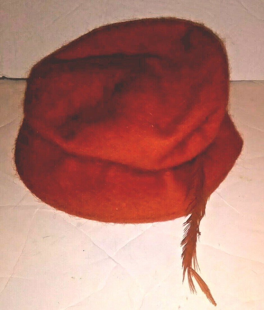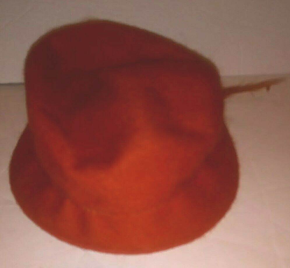 Offering this eye-catching burnt orange wool bucket hat by Henry Pollak. It has a deep orange-red color and a silver ring detail and feather on one side. The feather needs to be replaced but the hat is otherwise in good, wearable condition. Looks to be about a size 7.