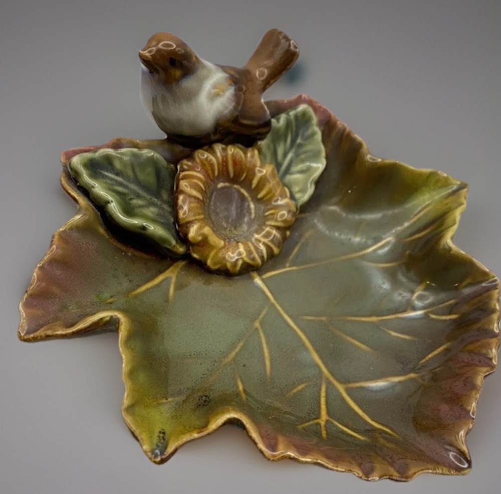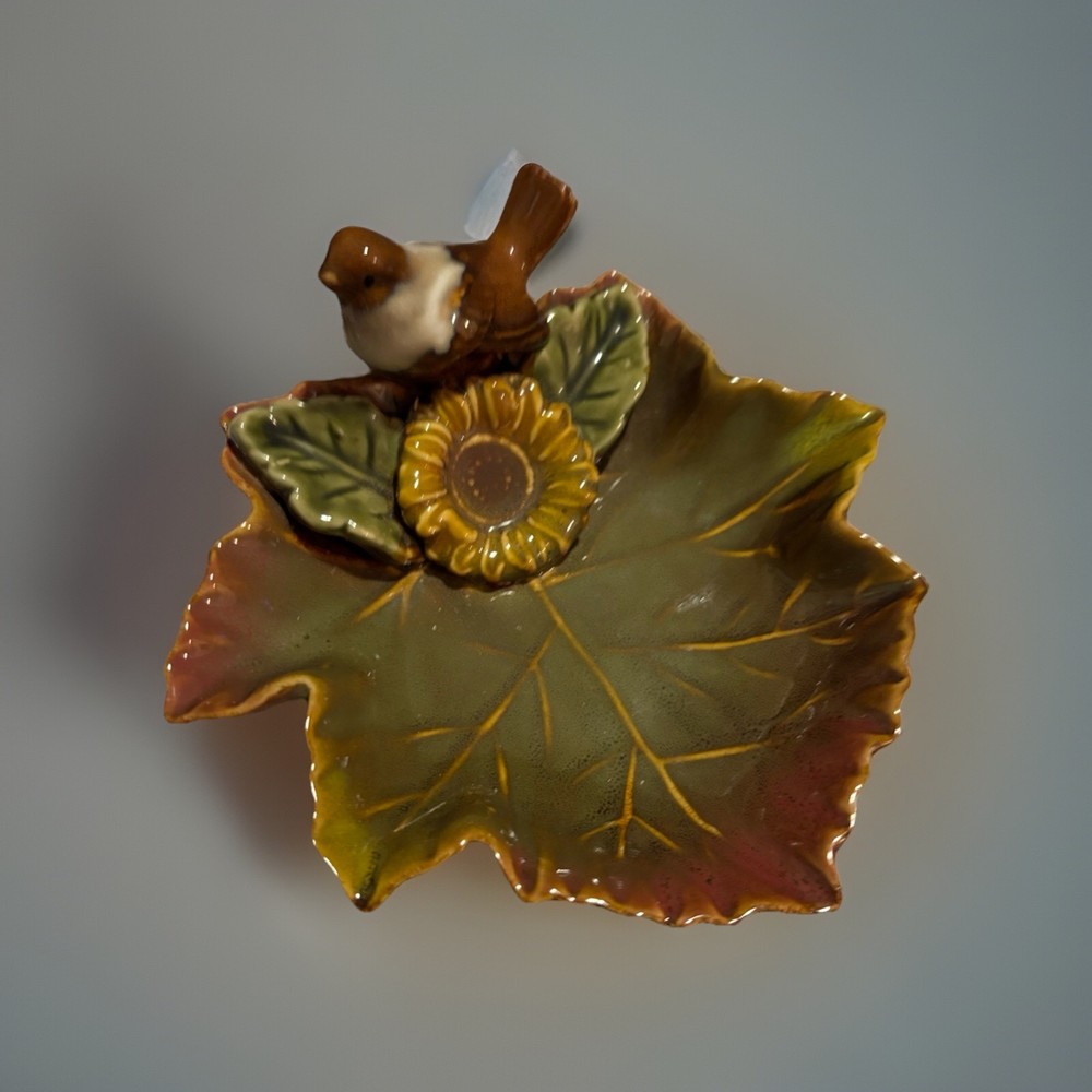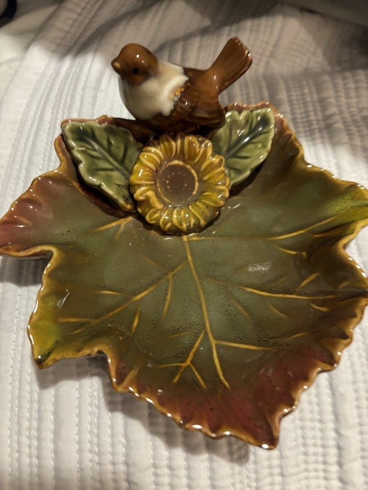 See Pics! In mint condition. The VTG Creative Co-Op Bird On A Leaf Trinket/Candy Dish is a beautifully painted and glazed ceramic piece that doubles as both a decorative trinket dish and a candy dish. The glossy finish adds a touch of elegance to any room, making it a stylish addition to home décor. The unique design of a bird sitting on a leaf adds a playful and charming element to the dish's aesthetic, making it a conversation starter in any space.