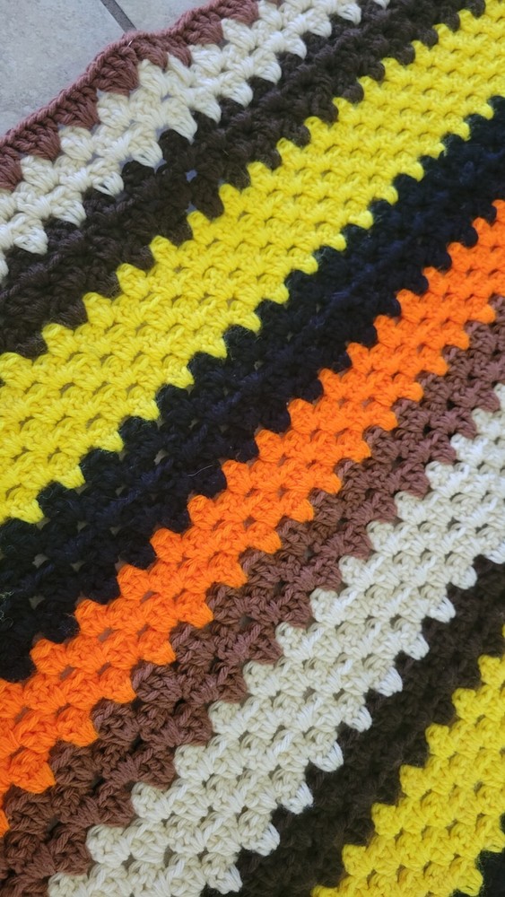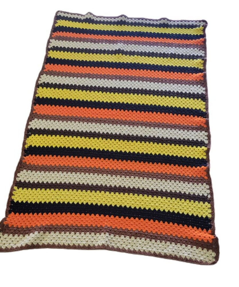 MCM Crocheted Throw 75"x43" Yellow Brown Orange Black Handmade Striped Blanket....