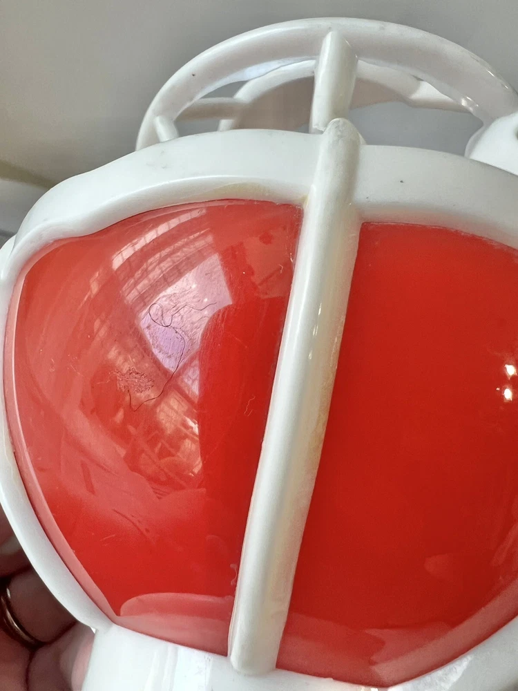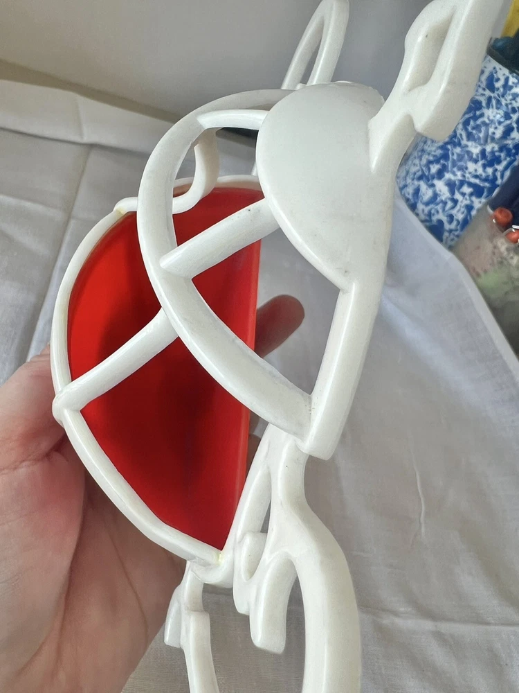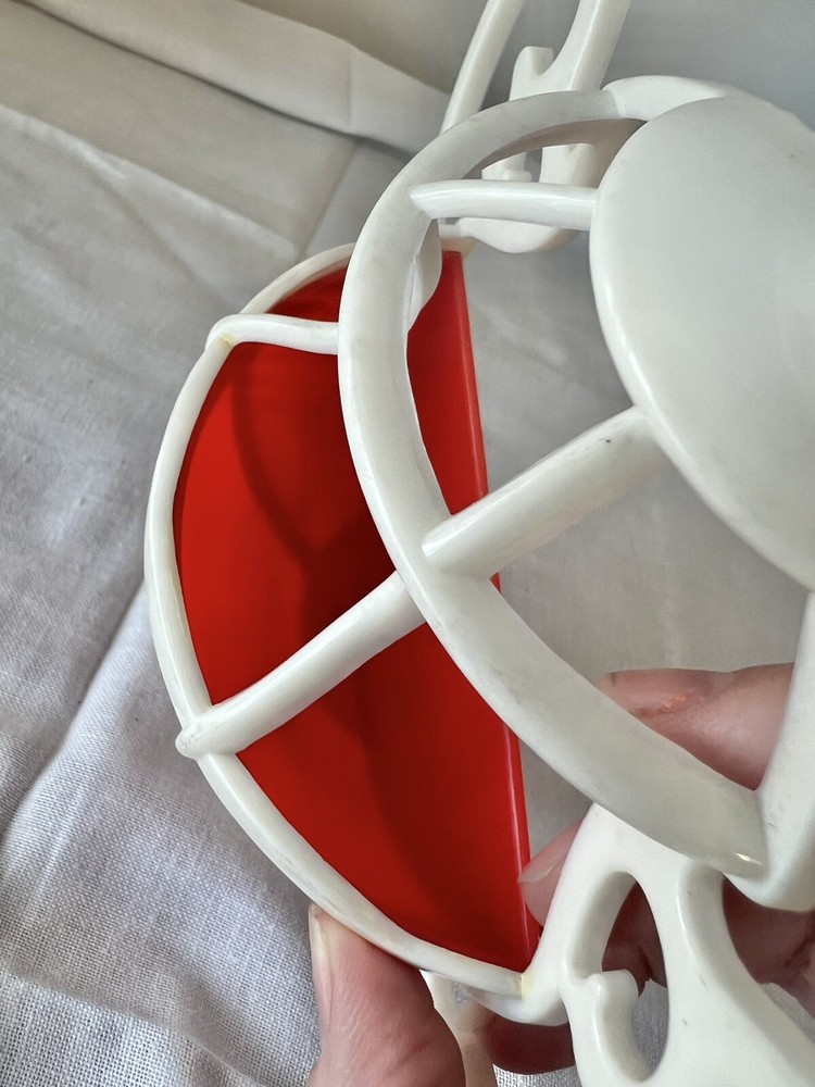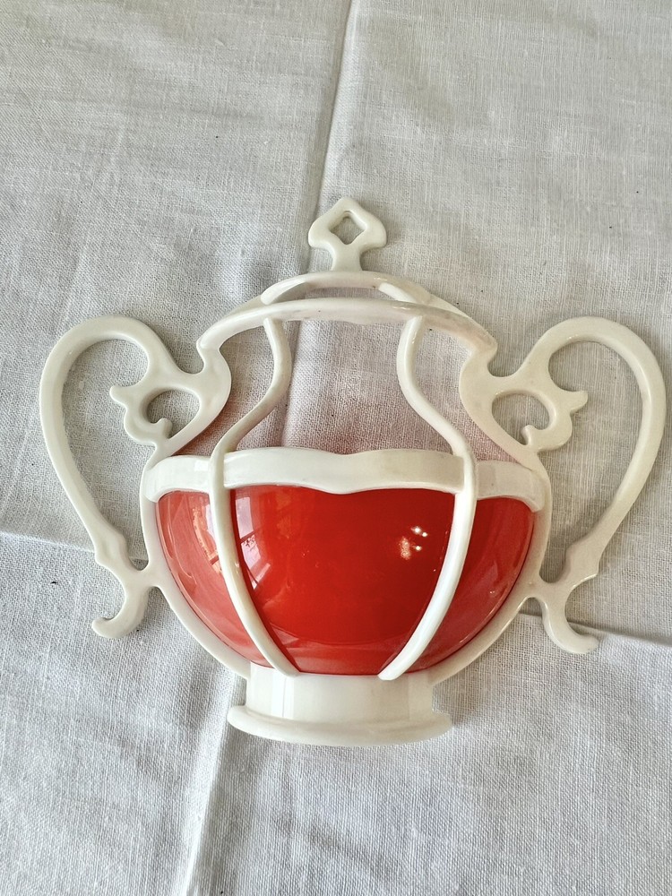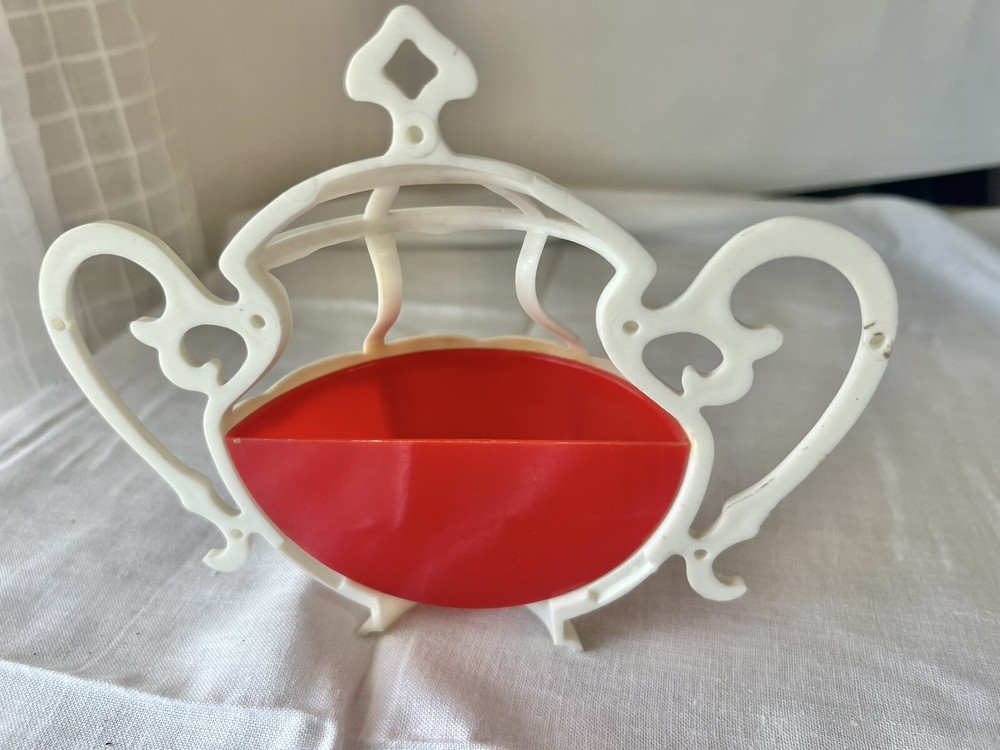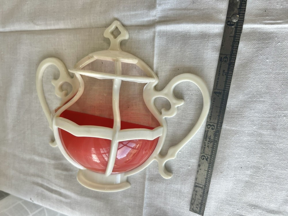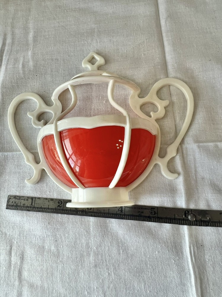 Vintage MCM plastic wall pocket in shape of a sugar bowl. Some areas of discoloration and scratches. See photos for details and dimensions.