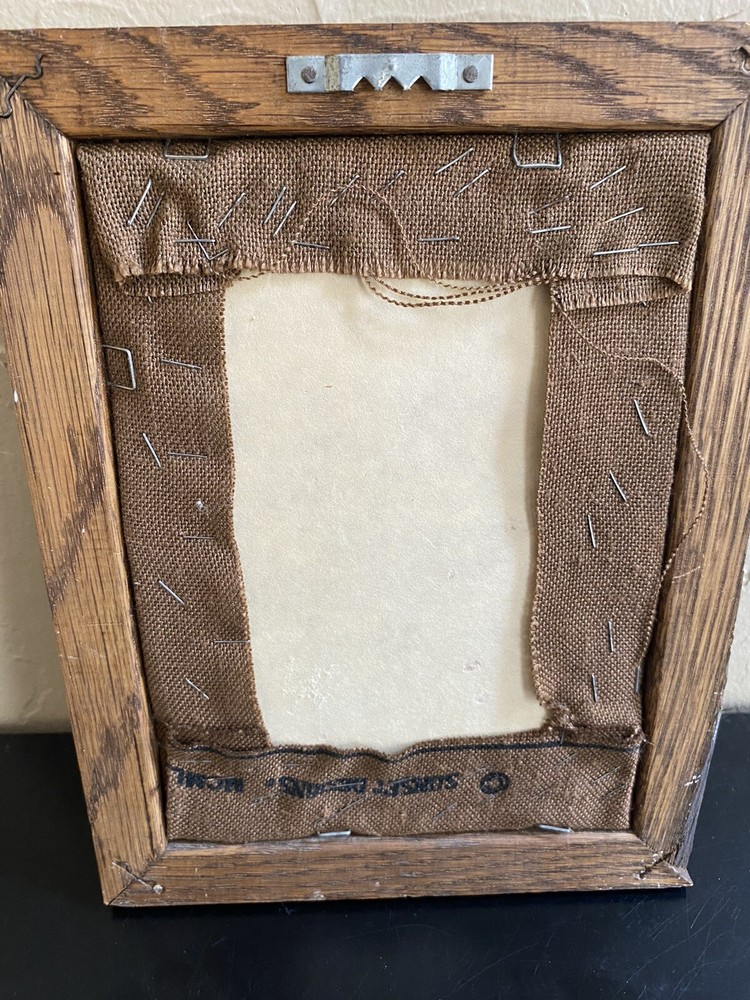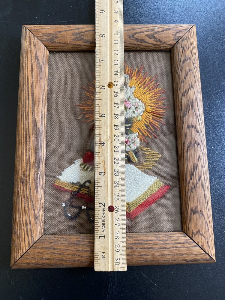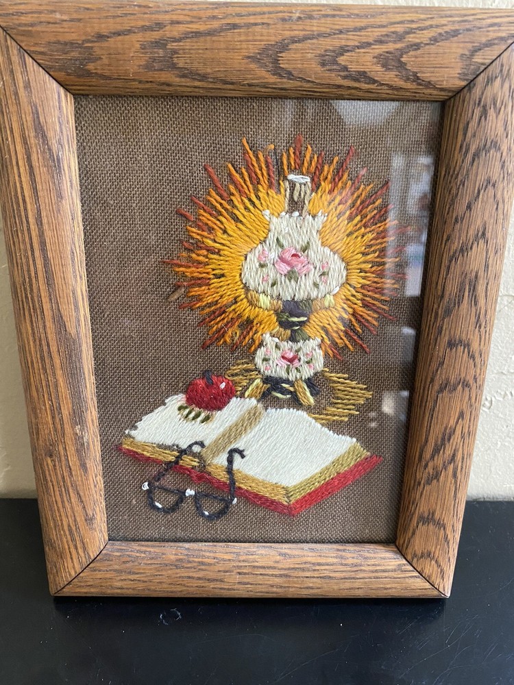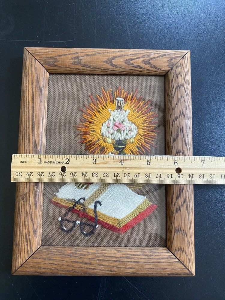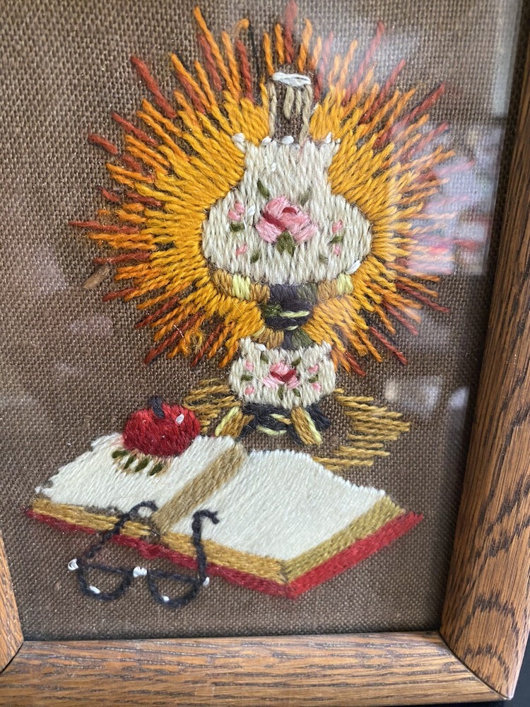 VTG MCM Needlepoint Crewel Framed Lamp Brown Orange Yellow Mid Century Library About 6.5 x 8 3/4 see back of frame