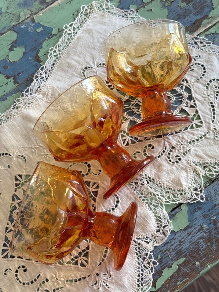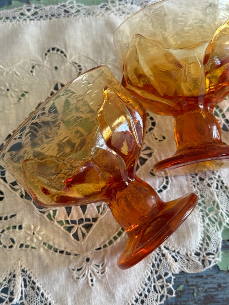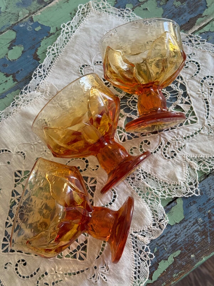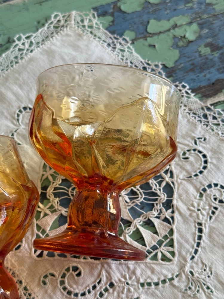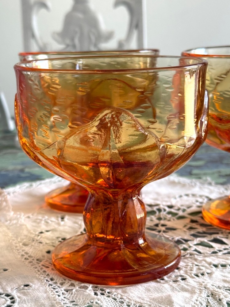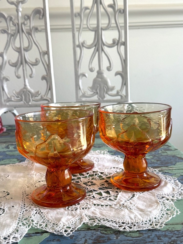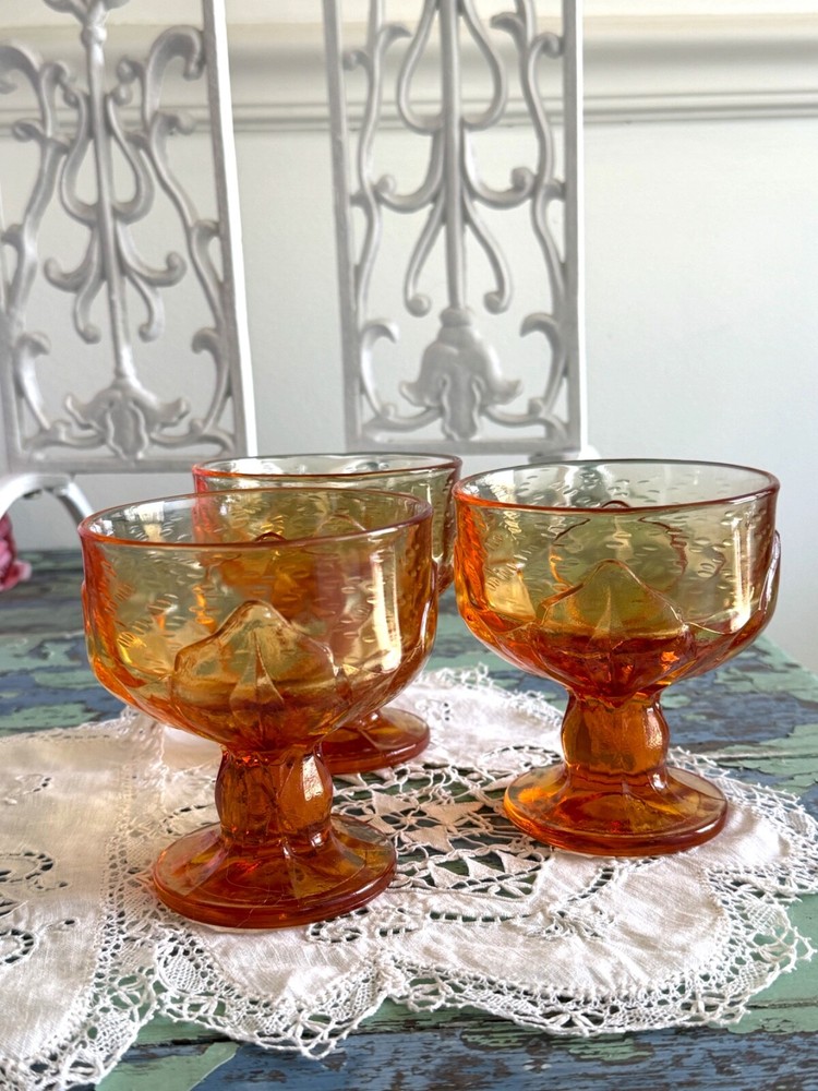 A vintage set of 3 glass sherbet or dessert cups. They could also be used for champaign. They are a substantial weight with a leaf design at the base of the cup. The top of the sherbets have tiny oblong marks that are indented inside the sherbet glass. The color is unusual and fantastic. It is an orangy amber, like apricot. We were not able to find a maker on these so we are just guessing at Blenko or possibly Noritake. We believe that they may be mid century era. Height: nearly 4 1/2” Width Across: 4” A fantastic set! Hint: To view clearest pictures please do not click into the Ebay picture program to scroll down, just expand / enlarge the main picture manually then use the arrow to scroll sideways to view pictures. They will be much clearer :-) Please email us with any questions and please check our Ebay store, Hooked-On-Vintage, for more great vintage items. We combine ship :-) We can ship either USPS or UPS Ground. The latter may be less expensive. These are heavy sherbets and will be aprox 5 pounds with packaging.